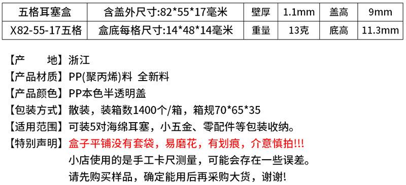 | | Caja de tapones para oídos de PP de cinco rejillas, caja de almacenamiento de esponja antirruido, caja de plástico rectangular translúcida Q5 |