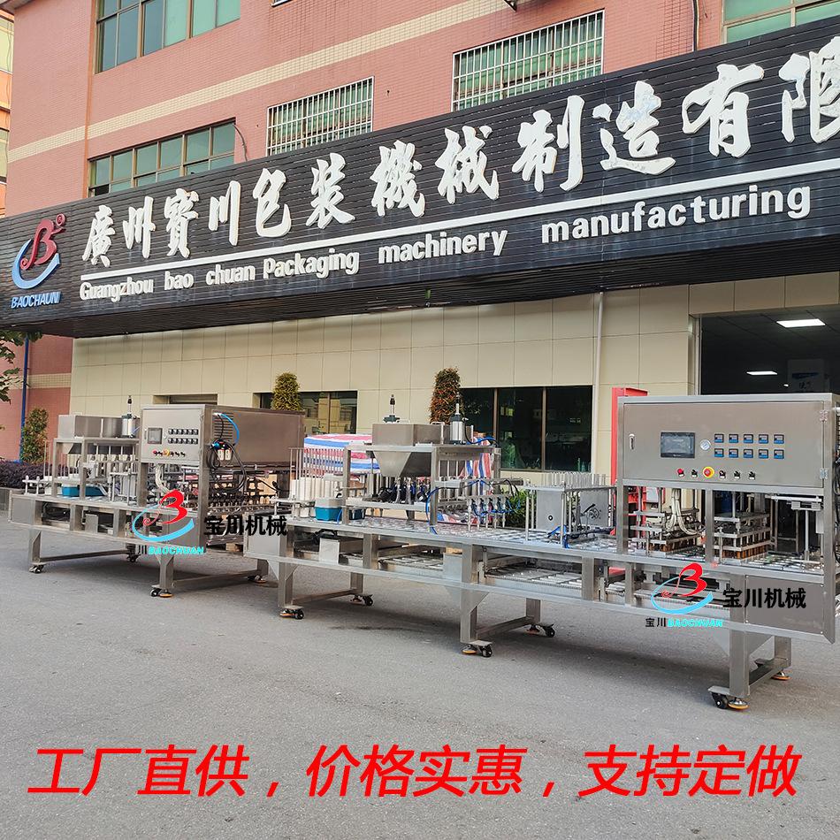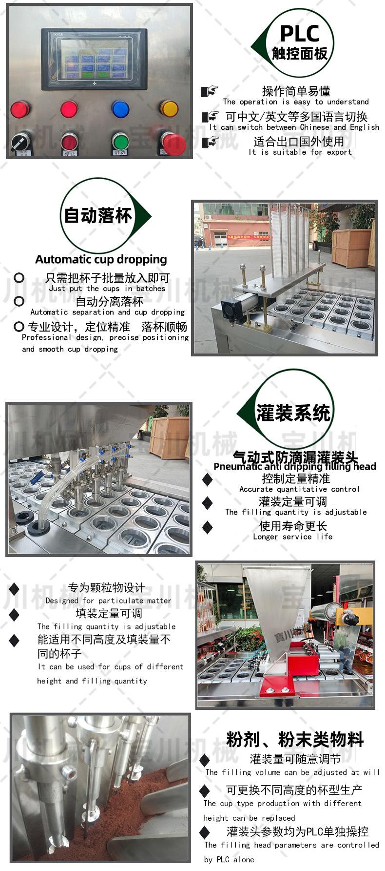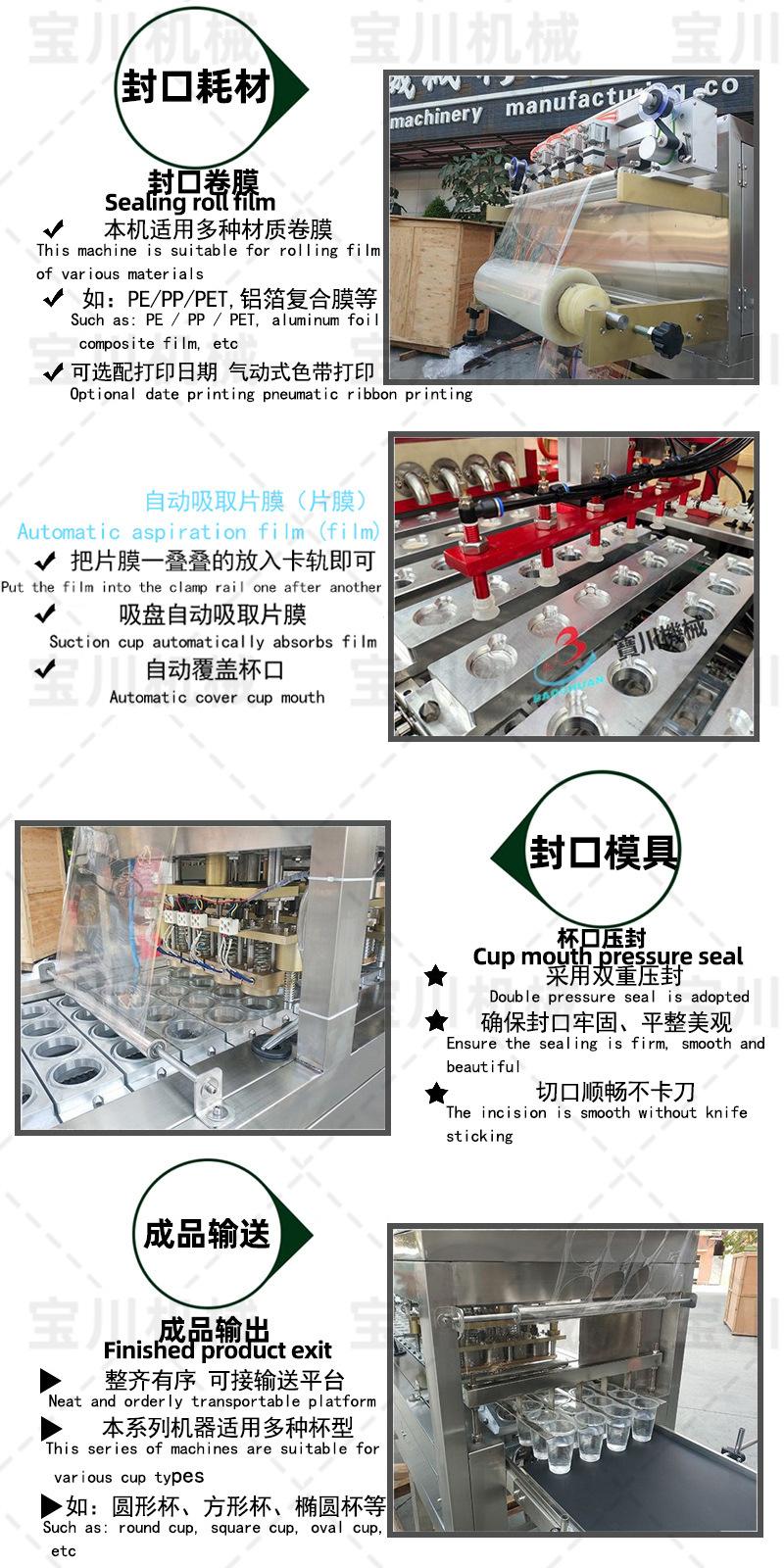 La máquina está hecha de acero inoxidable y es adecuada para llenar bebidas líquidas y salsas en vasos de papel, botellas de plástico, vasos de plástico y vasos de aluminio de diversas formas. Cuenta con control automático de temperatura, enrollado y laminado automático de película, y sellado automático. Es una máquina selladora totalmente automática que se puede completar de una sola vez. Se utiliza ampliamente en las industrias de alimentos y bebidas, elaboración de cerveza, medicina, condimentos, tofu, gelatina, pudín, jugo, leche, yogur, bebidas frías, mascarillas faciales líquidas y otras.