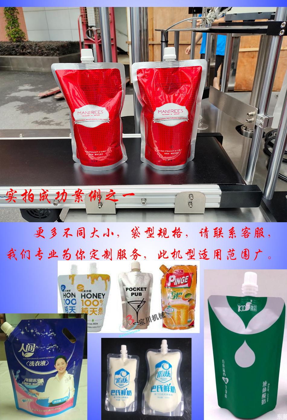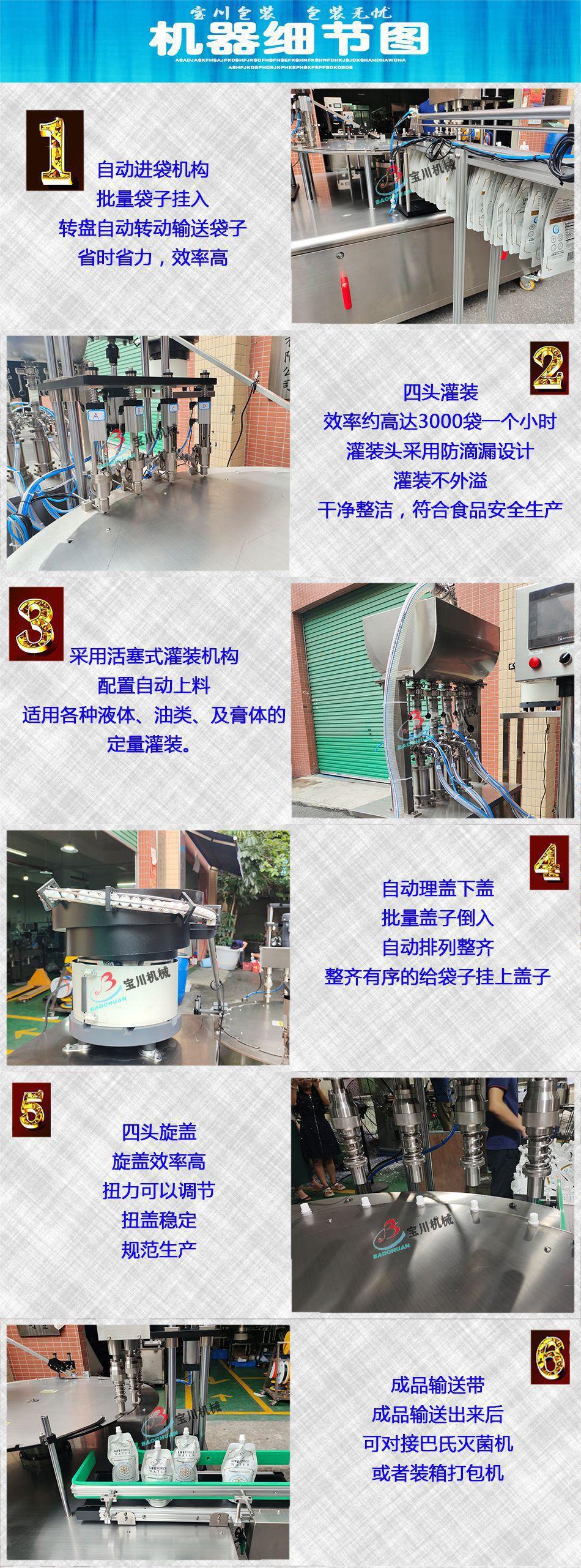 Esta máquina adopta una estructura de plato giratorio, que es más costosa que la estructura lineal, pero es aplicable a una gama más amplia de tipos de bolsas. La razón principal es que la máquina lineal no puede usarse para bolsas colgantes de una sola hebilla, mientras que la estructura de plato giratorio es más universal y puede usarse para bolsas colgantes de una o dos hebillas. Esta máquina llenadora y tapadora de bolsas autoportante con plato giratorio adopta una tapa de agarre y apriete tipo servo. El servo detecta automáticamente el torque, lo que la hace más estable y duradera. El mecanismo de plato giratorio es más conveniente y rápido de depurar. Adopta un mecanismo de llenado autocebante de tipo pistón, que no requiere una tolva independiente y puede autocebarse cuantitativamente en la tubería. El mecanismo de pistón puede usarse para el llenado cuantitativo de líquidos como agua, aceites, salsas, pastas químicas, etc. La máquina llenadora de bolsas con boquilla de plato giratorio también adopta una función de reabsorción de burbujas. Dado que las burbujas llenas durante el llenado son fáciles de llenar la boca de la botella, se instala la función de reabsorción de burbujas. Esta función hace que el llenado sea más ordenado y limpio, e incluso los líquidos de agua no se desbordarán.
