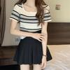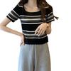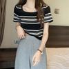 Camiseta de Punto de Manga Corta a Rayas de Seda Helada para Mujer Verano 2023 Nuevo Estilo Estilo Hyun-tasted Ajustada Delgada Camisa Corta a Rayas