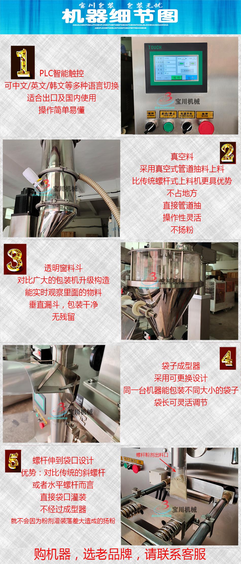 Adecuado para medir y empacar automáticamente polvo de flujo difícil o mala liquidez, como leche en polvo, polvo de arroz, polvo para té con leche, almidón, polvo de albúmina y polvo saborizante.