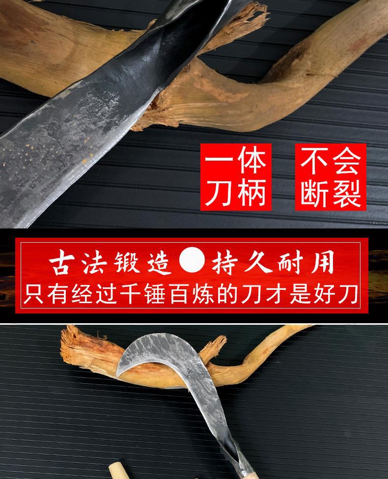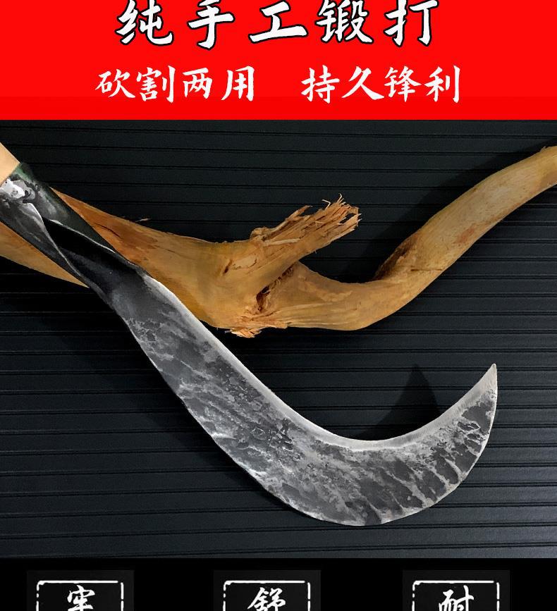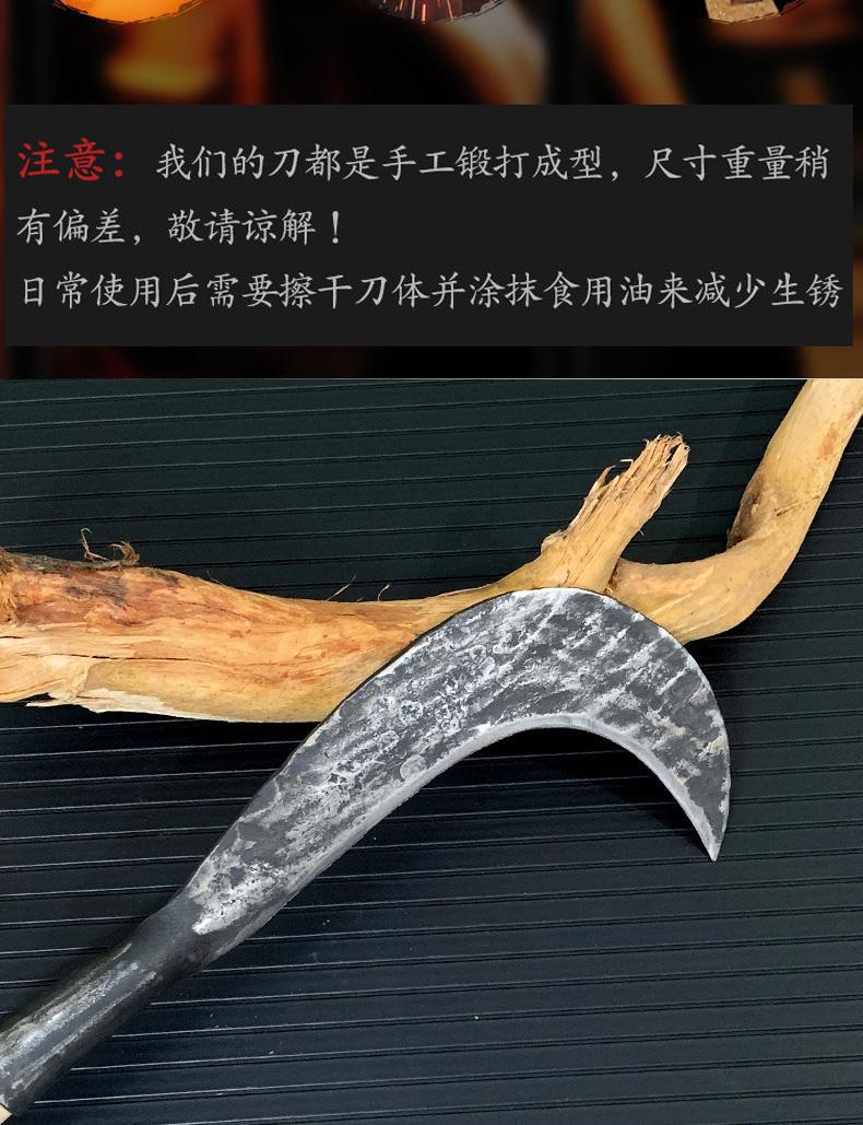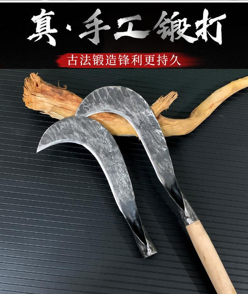 Guadaña de jardín doméstica Cimitarra de corte forjada a mano pura Deshierbe de doble propósito Cuchillo barato Cosecha Gancho para maíz Cuchillo Todo acero
