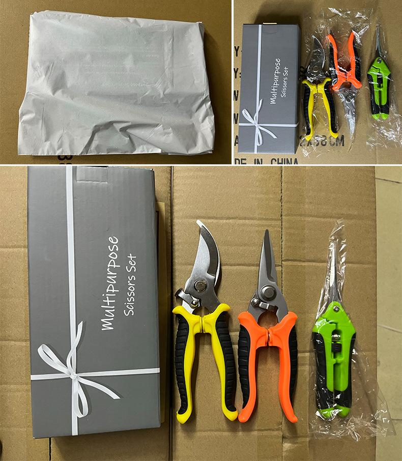 Tijeras de punta curva+tijeras para uvas+tijeras de electricista tamaño del paquete insertado en tarjeta: 22.5*18.2*2cm, peso aproximado: 330g