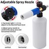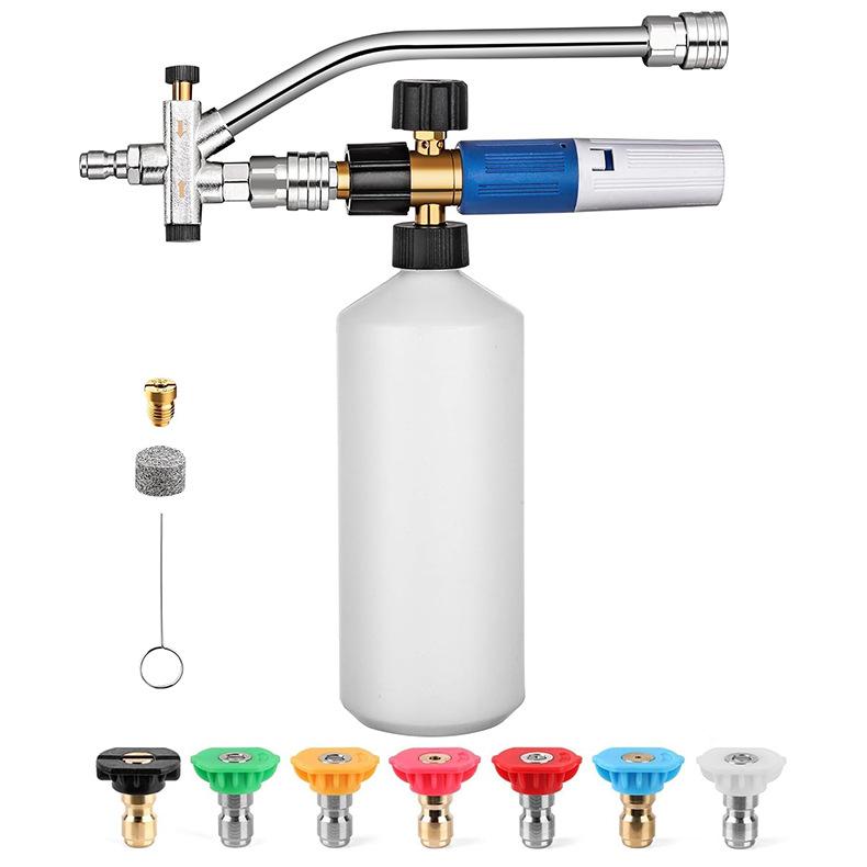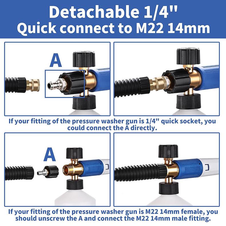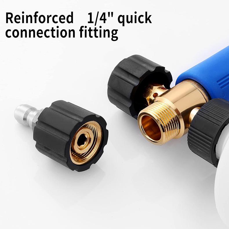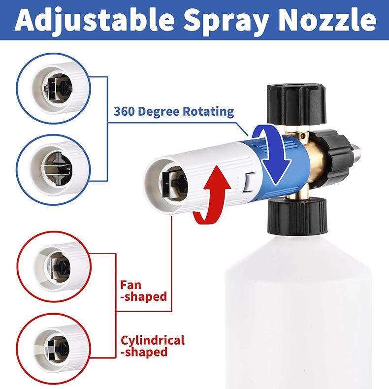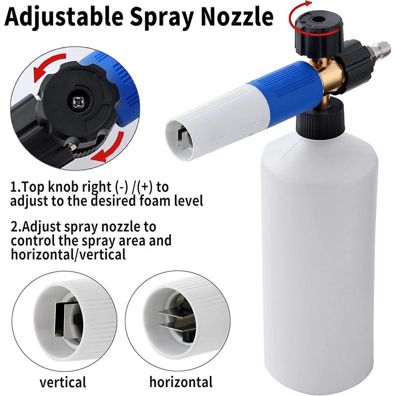 【Tanque de Espuma para Lavado a Presión Ajustable】Cañón de Espuma de Nieve de 1L/ 0.26 Galones, viene con un conector rápido desmontable de 1/4" y rosca externa M22-14, puede elegir el conector según su pistola de lavado a presión. Gire la perilla superior hacia la derecha (-) y la perilla superior hacia la izquierda (+) para ajustar al nivel de espuma deseado, ajuste la boquilla para controlar el área de rociado y horizontal/vertical.