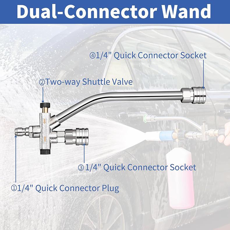 【Conector de Doble Extremo】Nuestro conector rápido de 1/4 tiene un diseño único con dos extremos de conector diferentes: uno más largo para boquilla de hidrolavadora para lavado con agua, y uno más corto para lavado con espuma de cañón de espuma de nieve. Este diseño simplifica el proceso de uso, facilitando el cambio entre los modos de agua y espuma y mejorando la eficiencia.