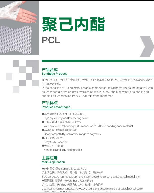 La policaprolactona tiene una tasa de degradación lenta, alta resistencia inicial y resistencia mecánica duradera, lo que la hace más adecuada como biomaterial para fijación interna de fracturas y para fabricar un dispositivo interno de fijación ósea. En la última década, con el desarrollo de la liberación controlada de fármacos y la tecnología de ingeniería tisular, los materiales degradables se han desarrollado rápidamente, y su rango de aplicación abarca casi todos los implantes no permanentes, incluyendo portadores de liberación controlada de fármacos, suturas quirúrgicas, dispositivos de fijación de fracturas, materiales de reparación de órganos, piel artificial, membranas quirúrgicas antiadherentes e ingeniería tisular y celular.