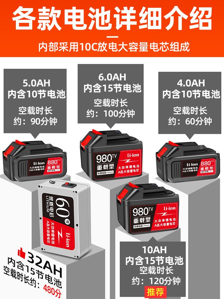Upgrade (10 cells 4.0ah) 1 power standard, Upgrade (10 cells 4.0ah) 2 power standard, Brushless reinforced mod...