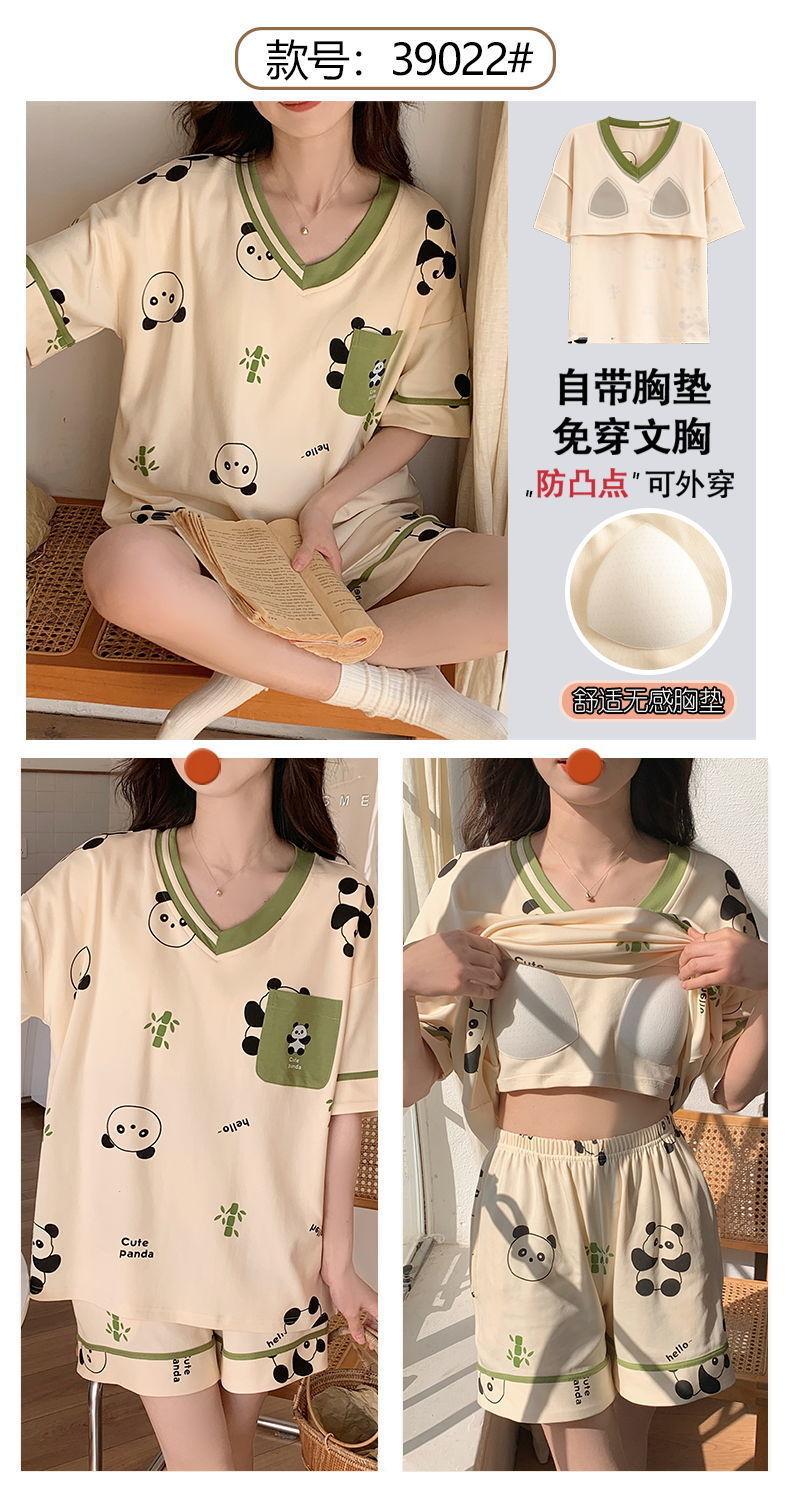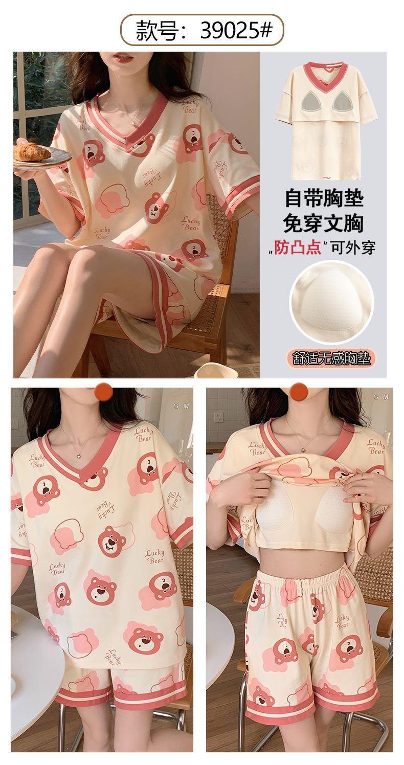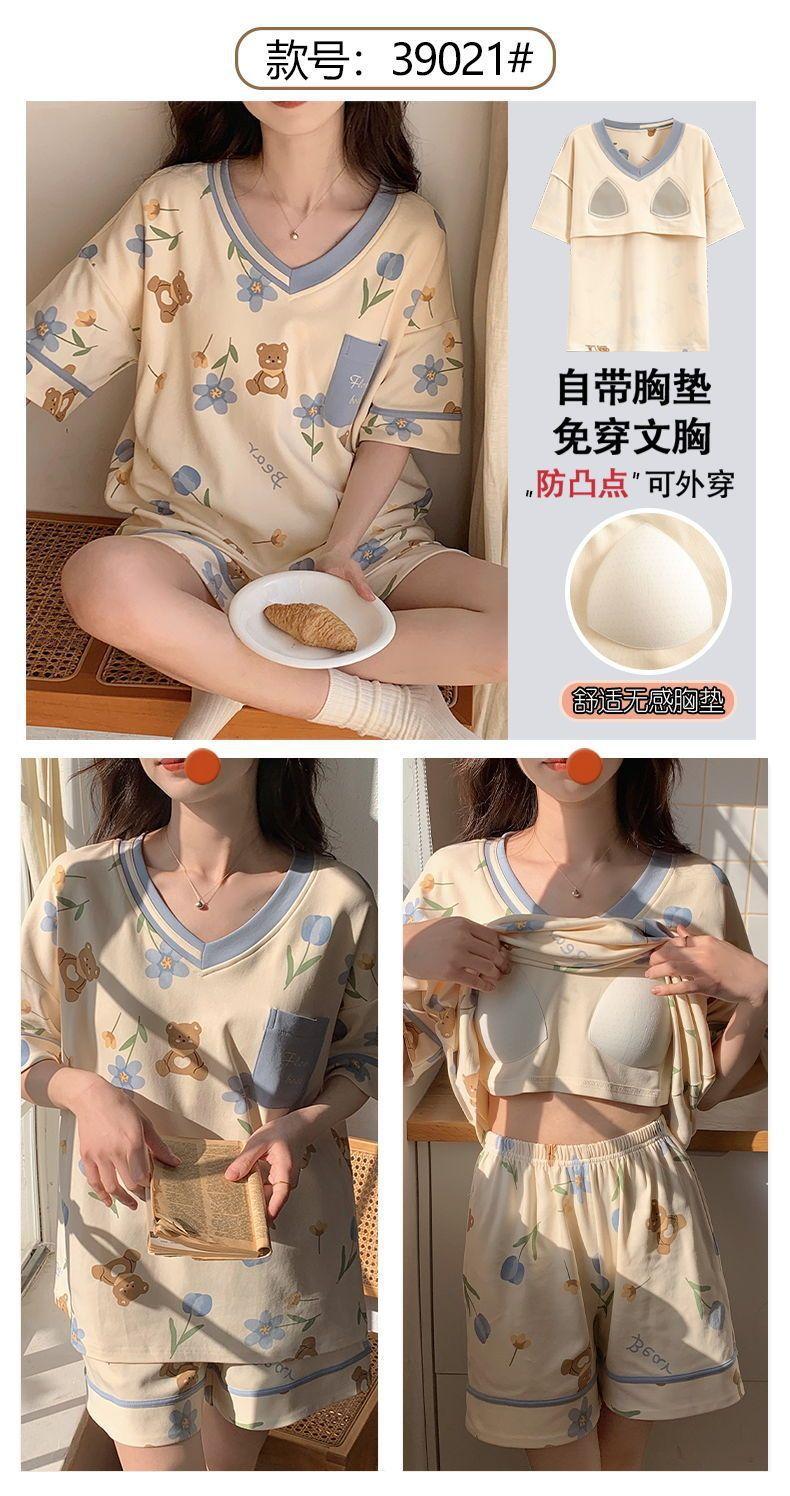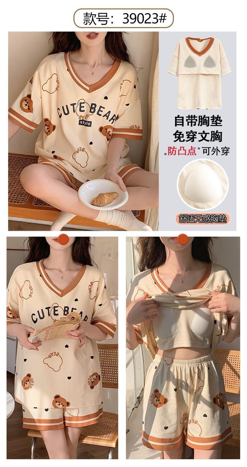 Pijama de verano para mujer con almohadilla para el pecho, 100% algodón, manga corta, pantalones cortos, algodón puro, fino, verano, dibujos animados, ropa para el hogar, traje