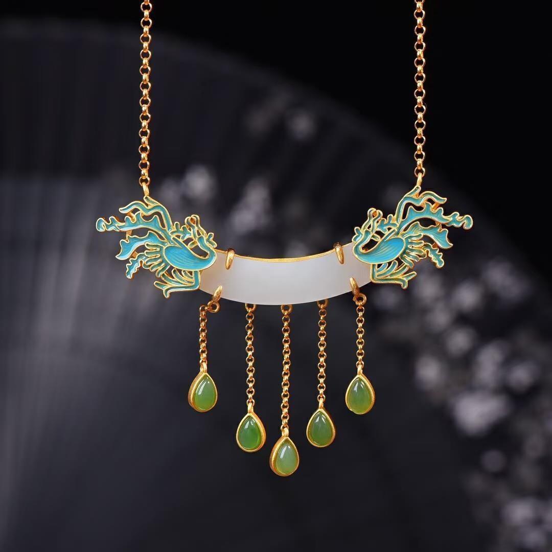 Colgante vintage de plata s925 con esmalte chapado en oro y incrustaciones de jade blanco natural, collar de arco de jade, regalo
