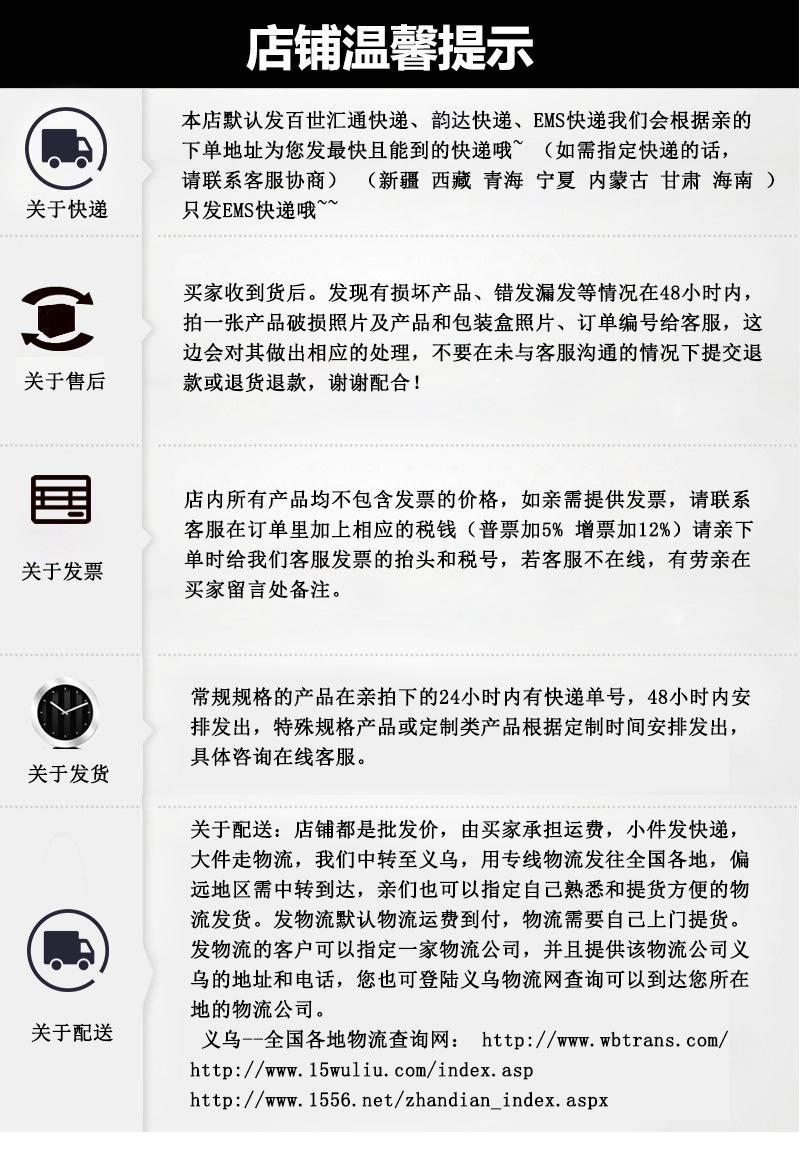 Antes de recibir (firmar) la mercancía, por favor verifique si la mercancía está dañada (debe ser desempaquetada para inspección) (especialmente la verificación de cantidad). Si hay algún daño, por favor asegúrese de contactarnos a tiempo e indicar en el mensajero: el contenido está dañado, me niego a aceptarlos, y devuélvanoslos en el embalaje original. Nos encargaremos de este asunto. Si la cantidad es incorrecta, nuestra empresa puede solicitar a la empresa de mensajería una compensación. Si firma por la mercancía sin una inspección cuidadosa, ¡será responsable de todas las consecuencias! ¡Por favor, preste atención! Los compradores deben firmar por la mercancía en persona (si necesita que alguien más la recoja en su nombre, por favor asegúrese de informar a los asuntos de aceptación, y la recogida en nombre de otros se considerará como firma por ellos por usted mismo). Si tiene alguna pregunta al recibir la mercancía, por favor consulte a nuestro personal de atención al cliente y haremos todo lo posible para resolver sus problemas.