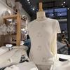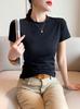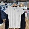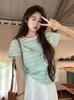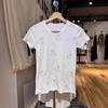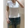 Camiseta de manga corta con cuello redondo y estampado de oso estilo americano BM para mujer, top ajustado con hombros descubiertos y corte adelgazante.