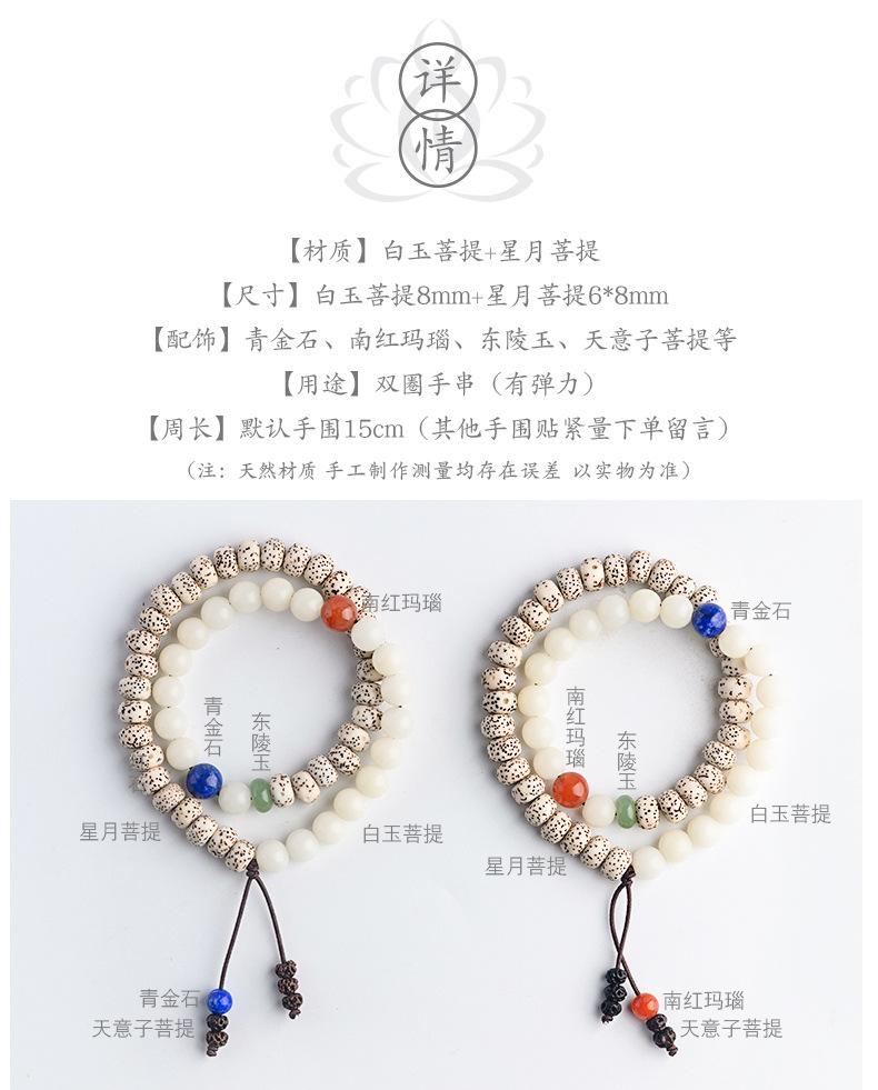 Jade blanco natural Bodhi con semillas de Bodhi estrella y luna Pulsera de doble círculo Hilo elástico La circunferencia de muñeca predeterminada es 15 cm Otras circunferencias de muñeca son cercanas a la medida. Deje un mensaje al realizar el pedido o contacte con el servicio de atención al cliente Observaciones Personalización Contacte con el servicio de atención al cliente Material natural hecho a mano Hay ligeras diferencias en cada pieza. Tenga cuidado al comprar.