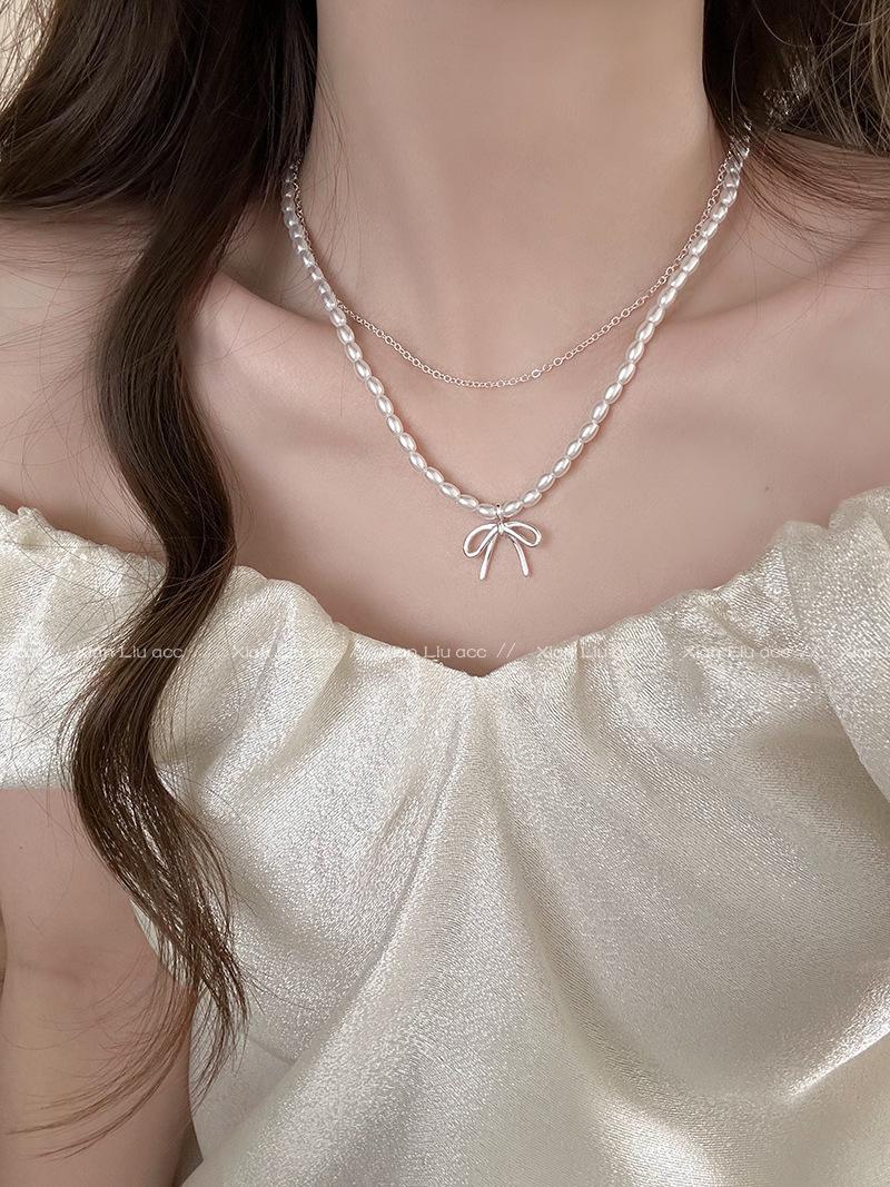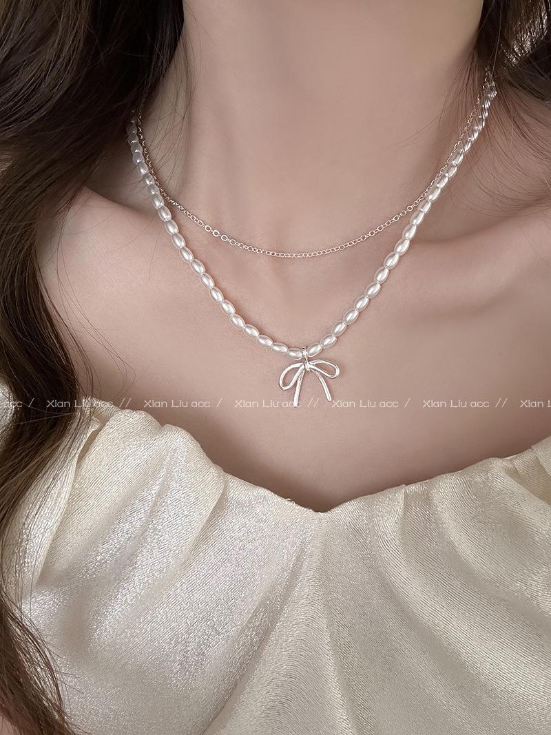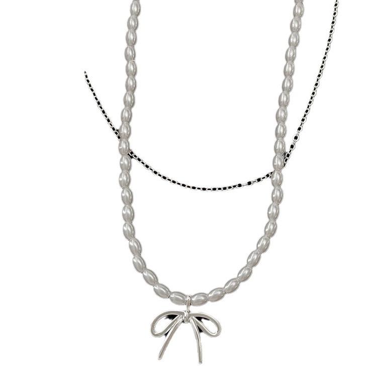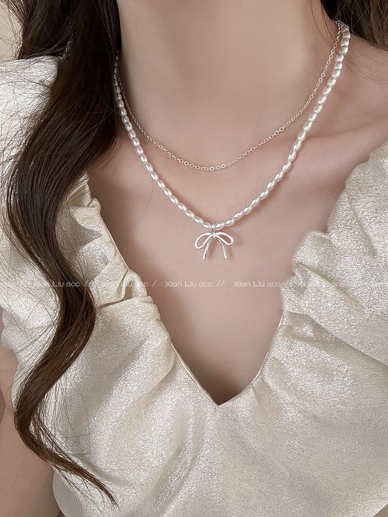 Collar de Perlas de Mijo de Doble Capa con Lazo 2024 Nuevo Estilo Caliente Cadena para Clavícula Collar para Mujer con Alto Sentido del Diseño Accesorios