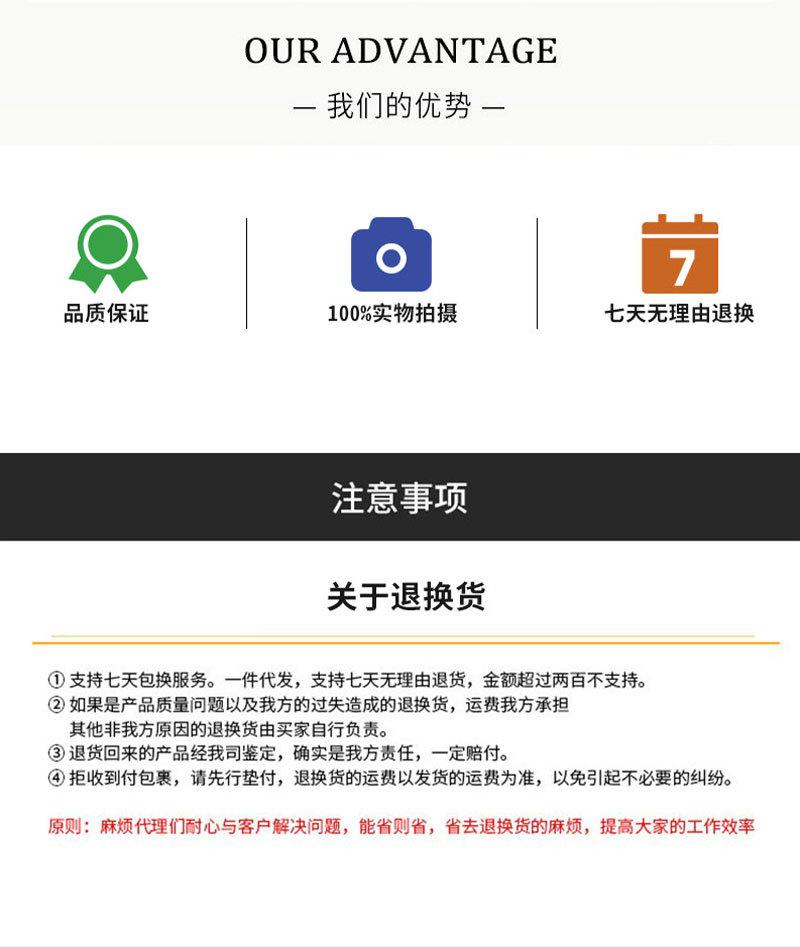 2. En cuanto a los estilos y colores, el valor predeterminado es el que se indica en el pedido. No se aceptan comentarios sobre estilos ni colores (excepto las instrucciones especiales en la página del producto). Haremos todo lo posible para adaptar los productos a sus necesidades, pero es inevitable que haya escasez, y esperamos que todos lo toleren. Si hay una escasez temporal (también puede hacer un pedido teniendo en cuenta que el color de la escasez es aleatorio), le notificaremos por Wangwang o por teléfono. ¡Disculpe!
