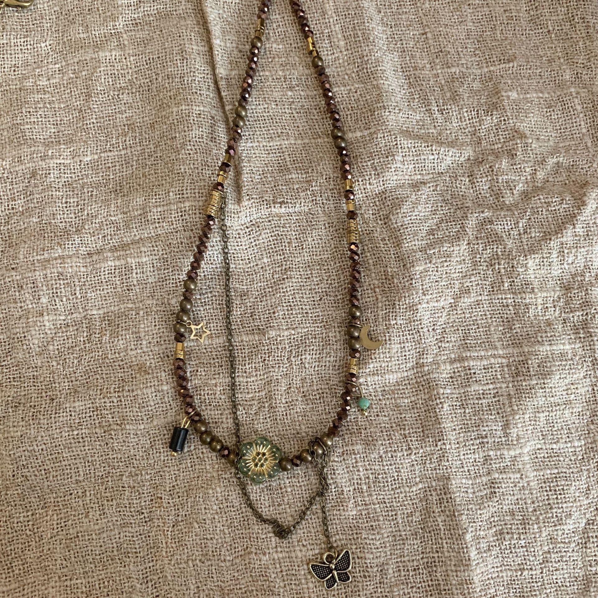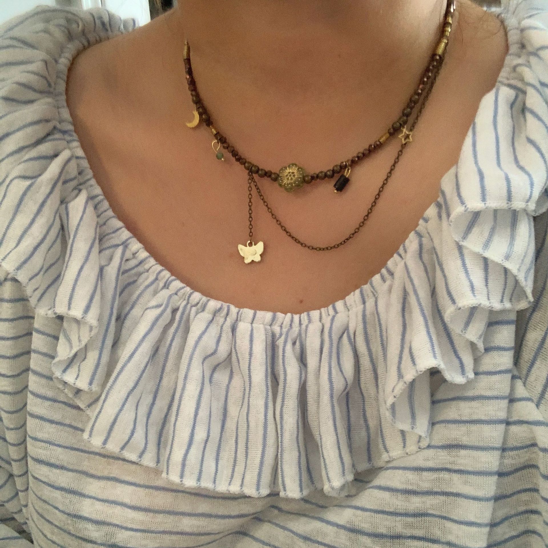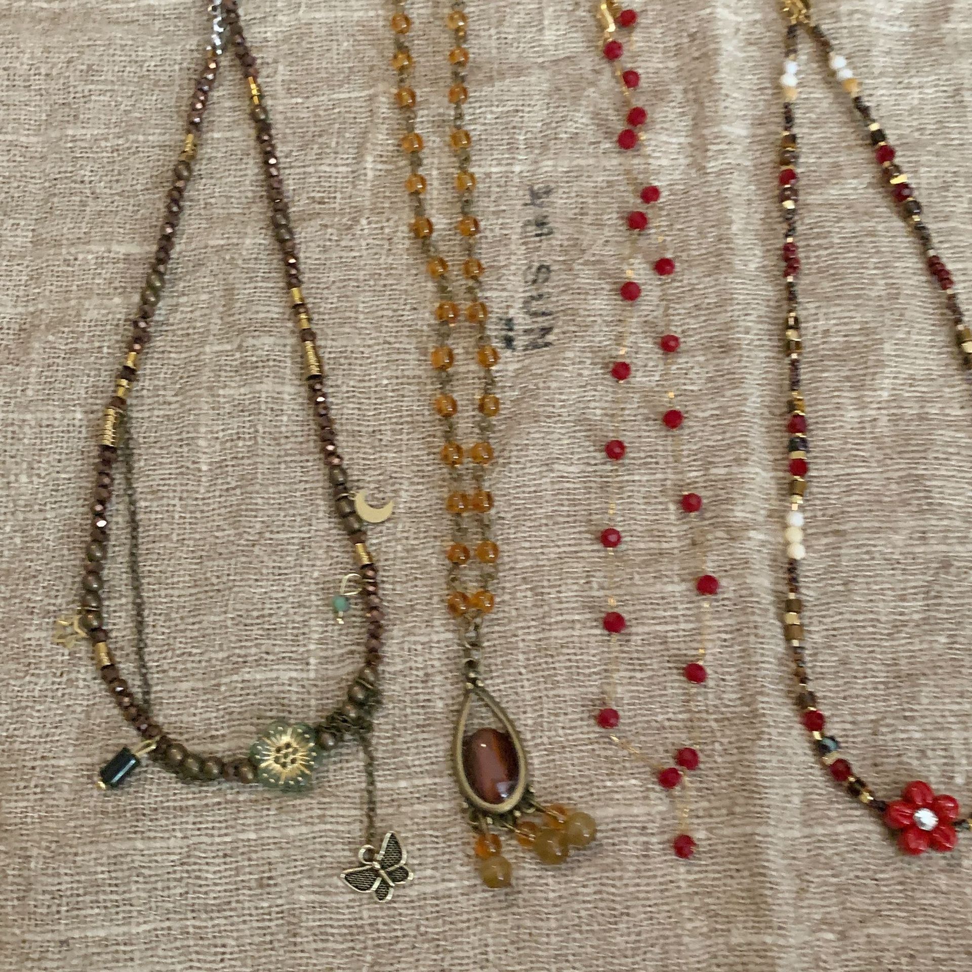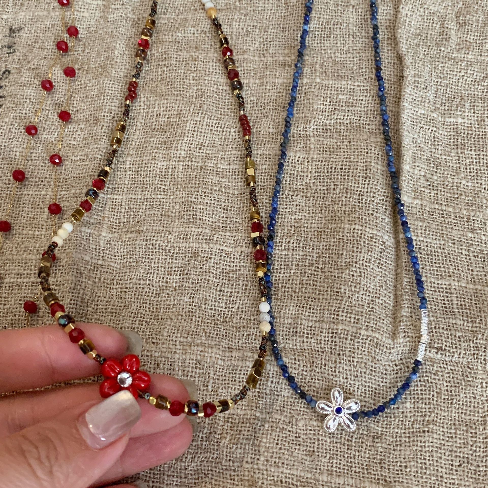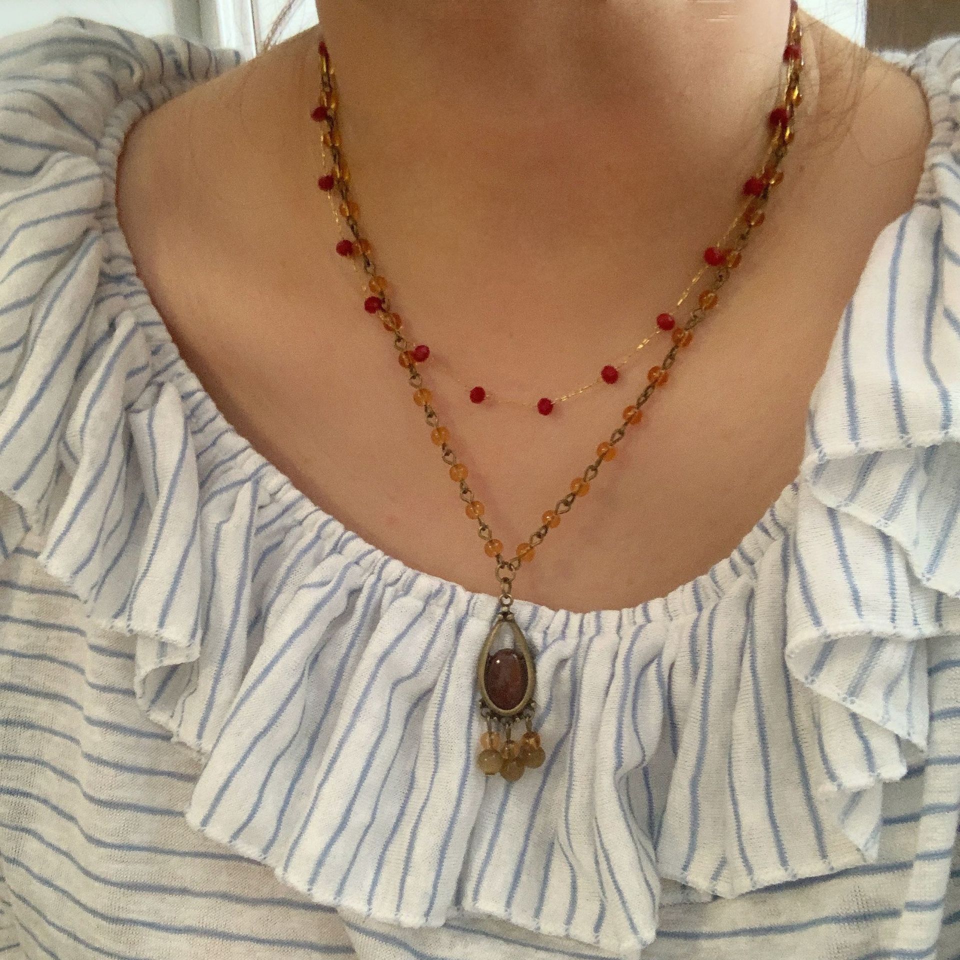 Multi-element butterfly pendant ry, Red bead thin chain yx