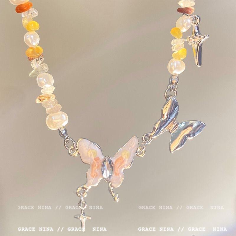 Collar de mariposa con perlas de grava de colores para mujer, nuevo estilo 2024, cadena de collar ligera y moderna, accesorios de nicho de lujo