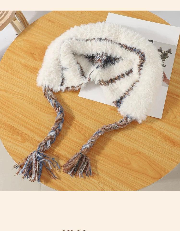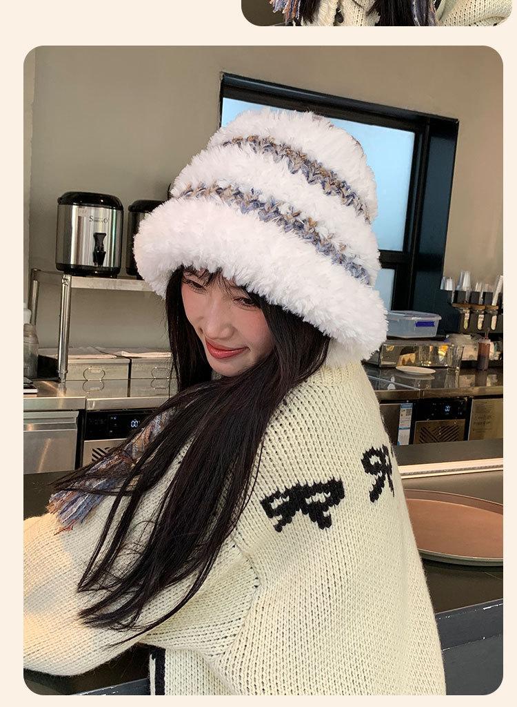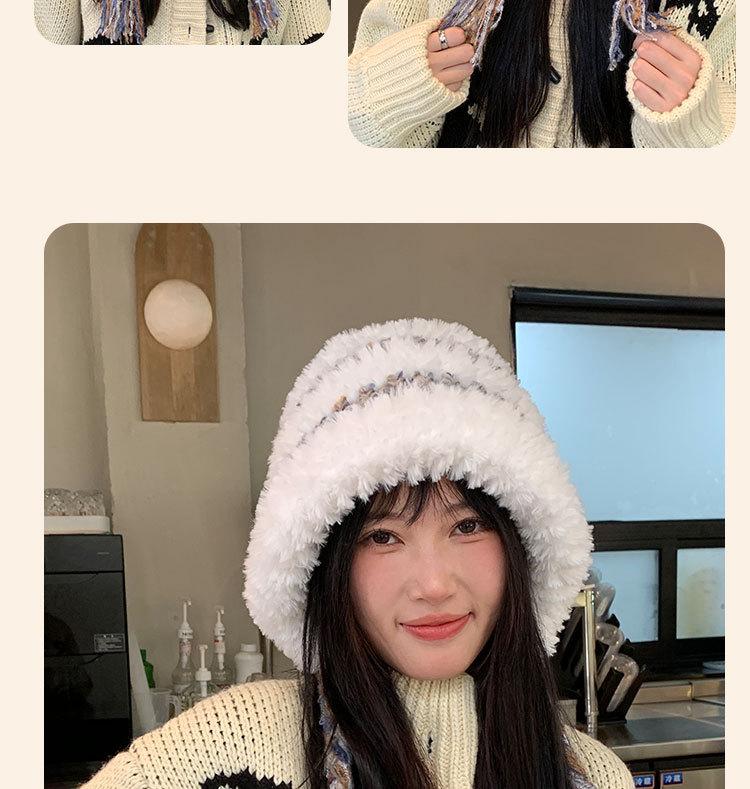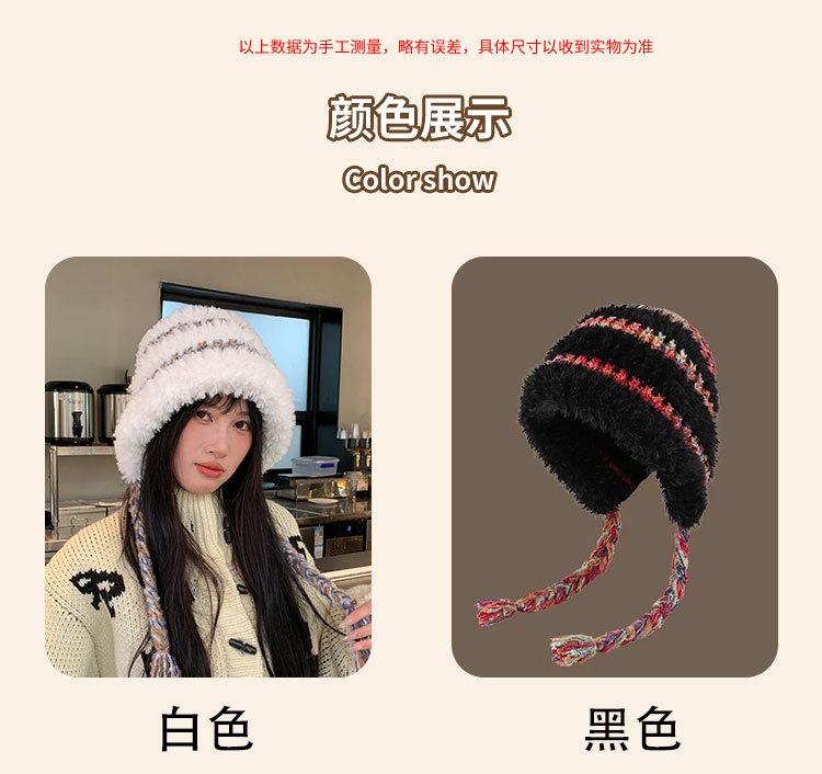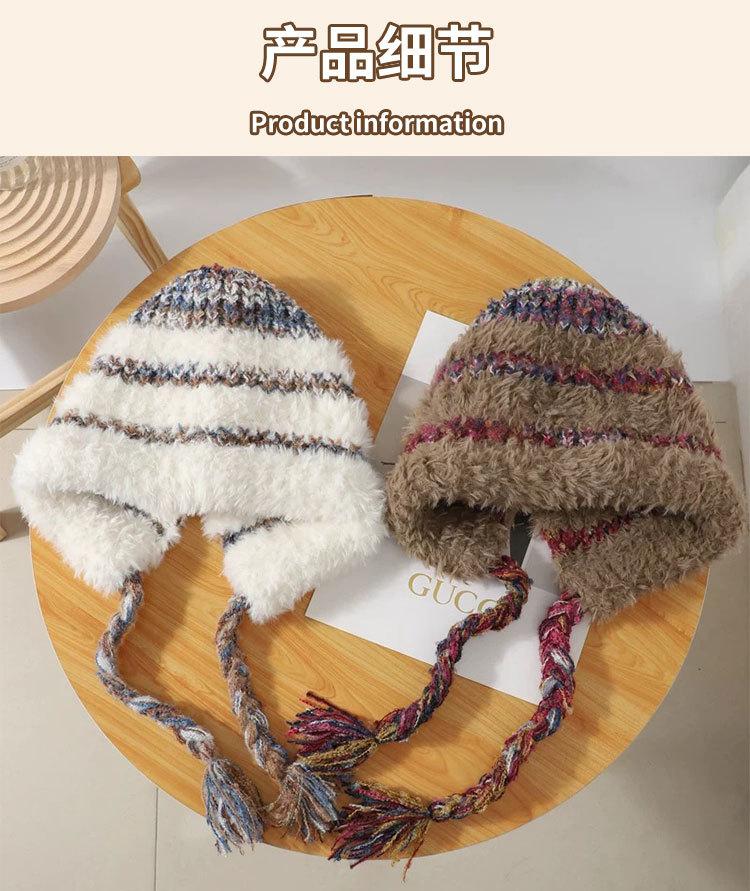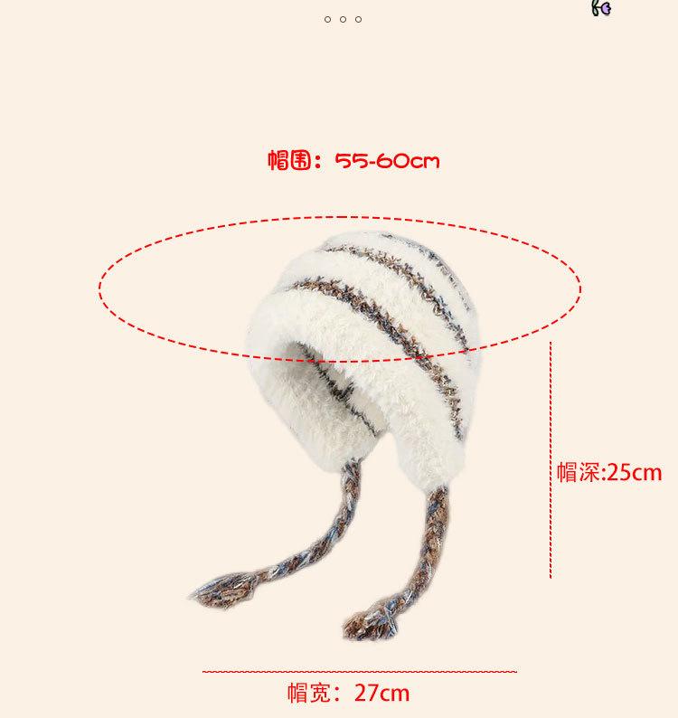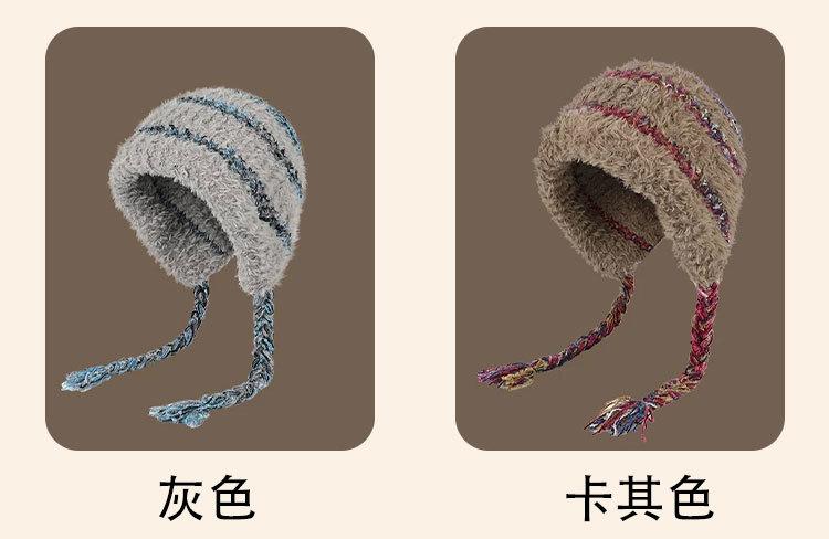 Gorro de felpa para otoño e invierno, gorro con protección para los oídos, gorro de punto a rayas de colores a juego, gorro cálido con correa pequeña que combina con todo.