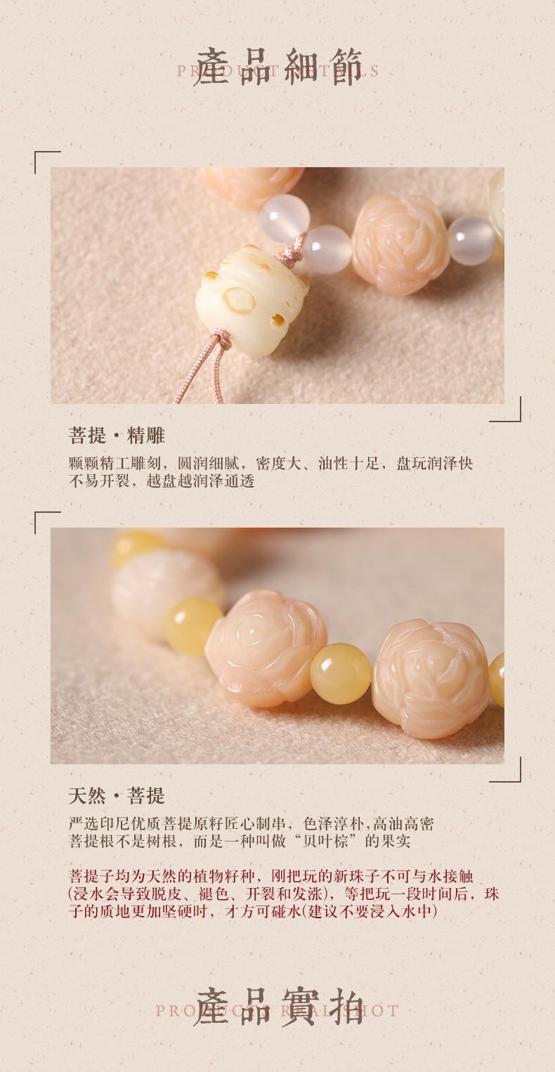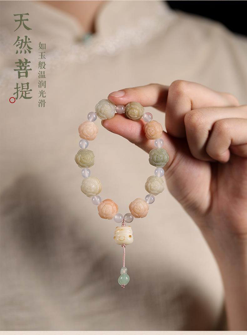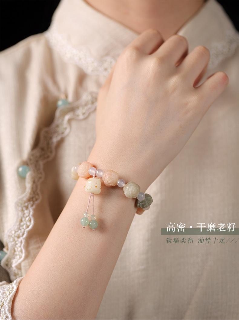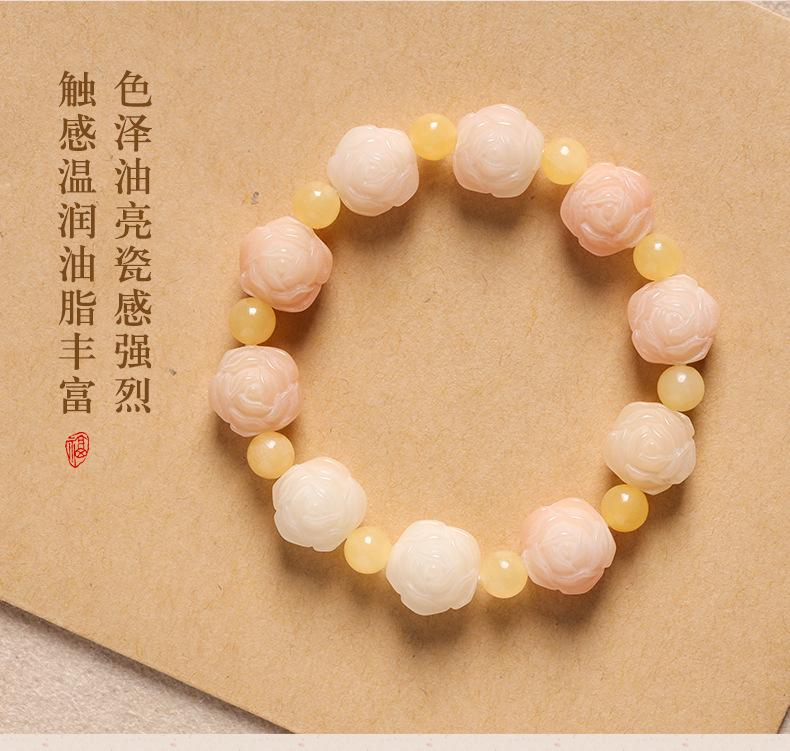 Pulsera Guofeng Camelia Tallada Jade Blanco Raíz de Bodhi Placa Gradiente Juego Cultural de Bodhi para Niña Pulsera de Cuentas de Buda