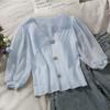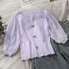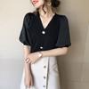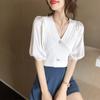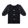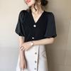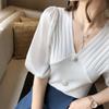 Compra Verano Transfronterizo Color Puro Estilo Chifón Cuello en V Tres Botones Ajustado Tejido de Punto para Mujer con Top de Manga Abullonada Empalmada al por mayor en Joom.pro