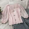 Verano Transfronterizo Color Puro Estilo Chifón Cuello en V Tres Botones Ajustado Tejido de Punto para Mujer con Top de Manga Abullonada Empalmada