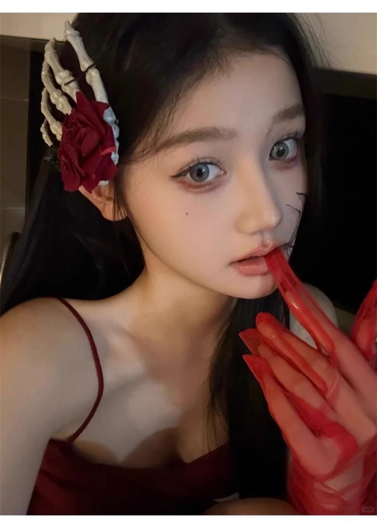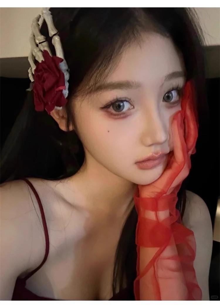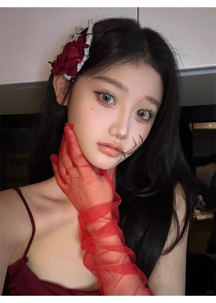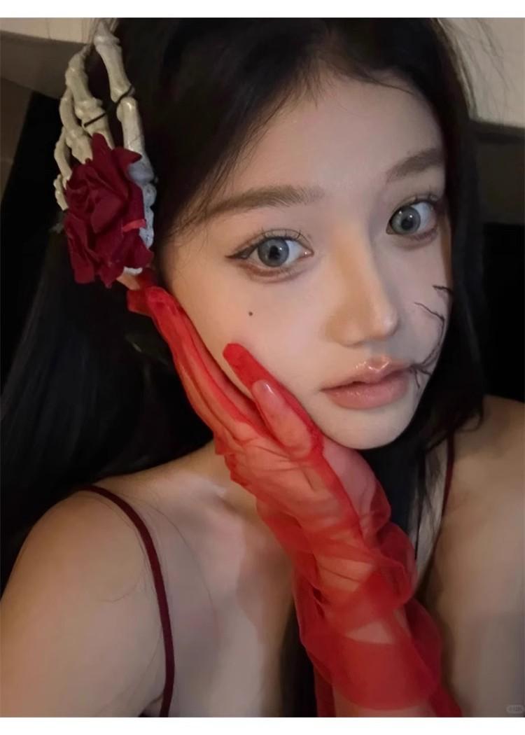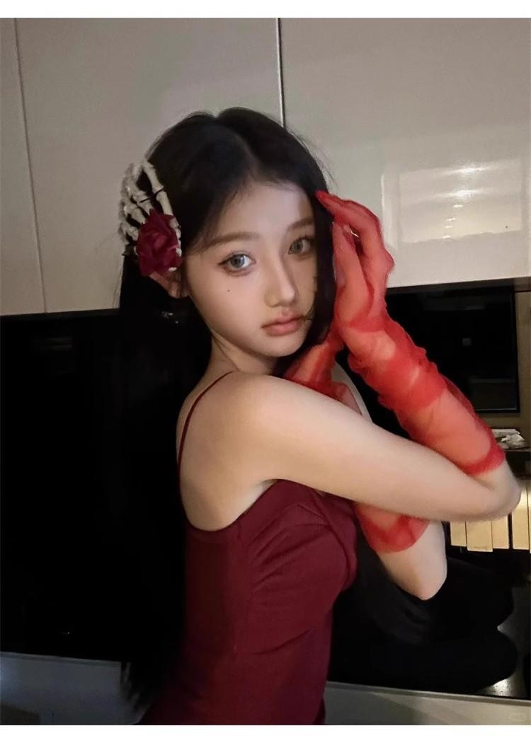 Guantes de Malla Transparentes Rojo Vino Puro Retro Halloween cos Accesorios para Fotos de Chicas Hot Horquilla Rosa Calavera