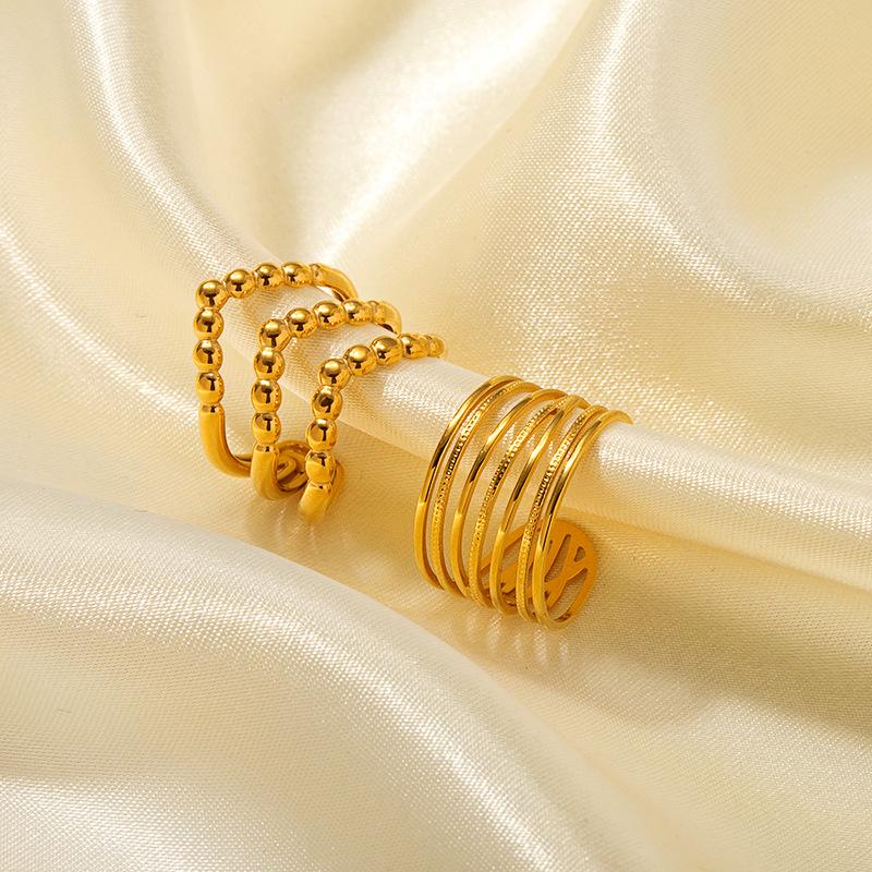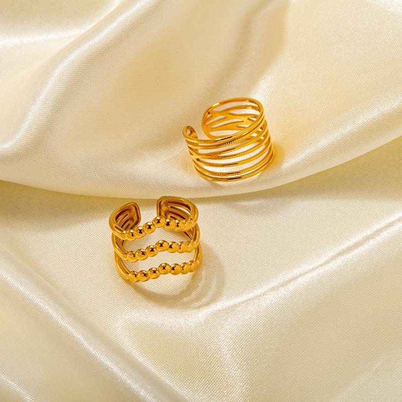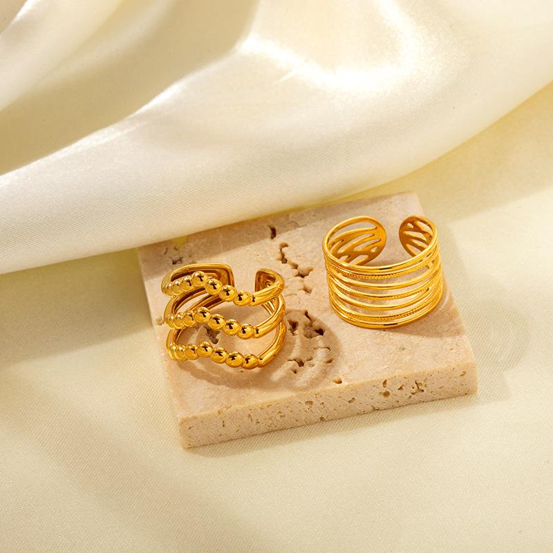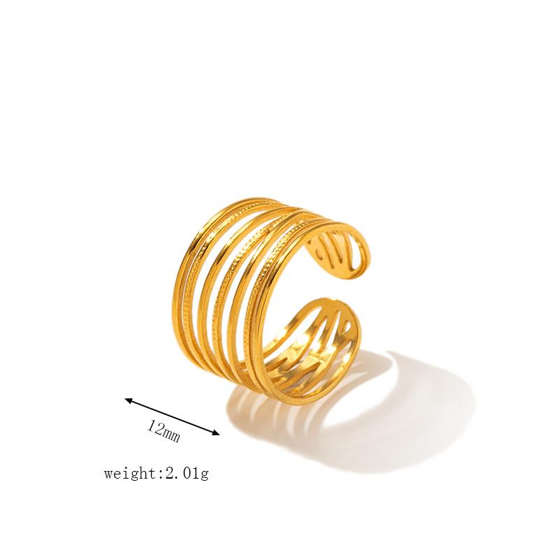 Anillo de acero inoxidable chapado en oro de 18 quilates con apertura de acero de titanio y diseño geométrico multicapa, simple y popular.