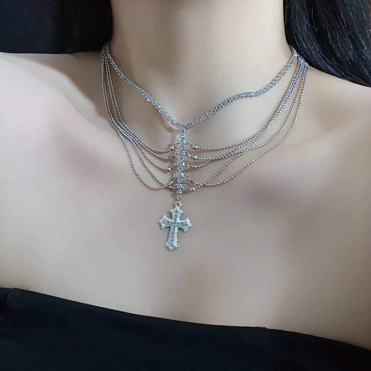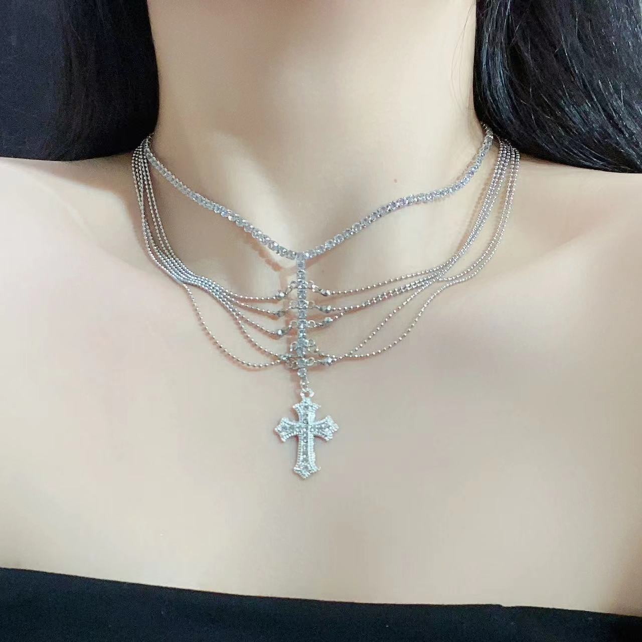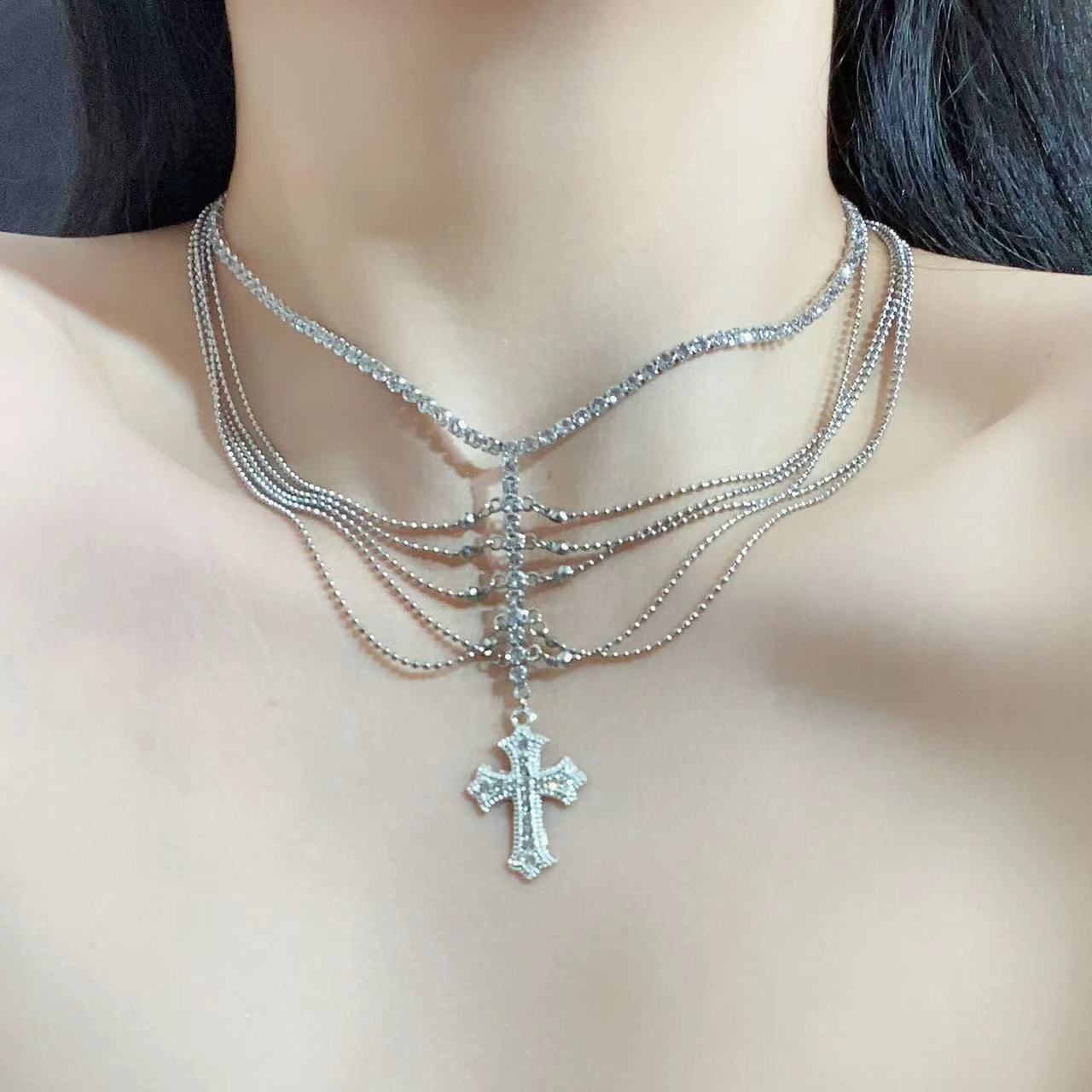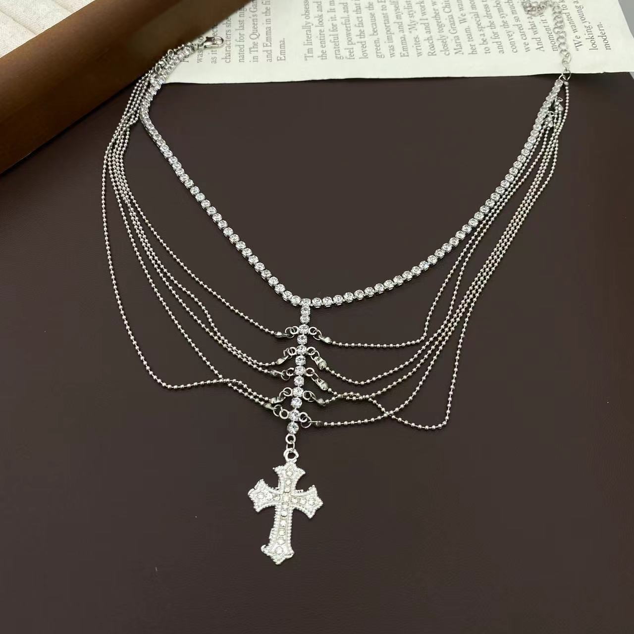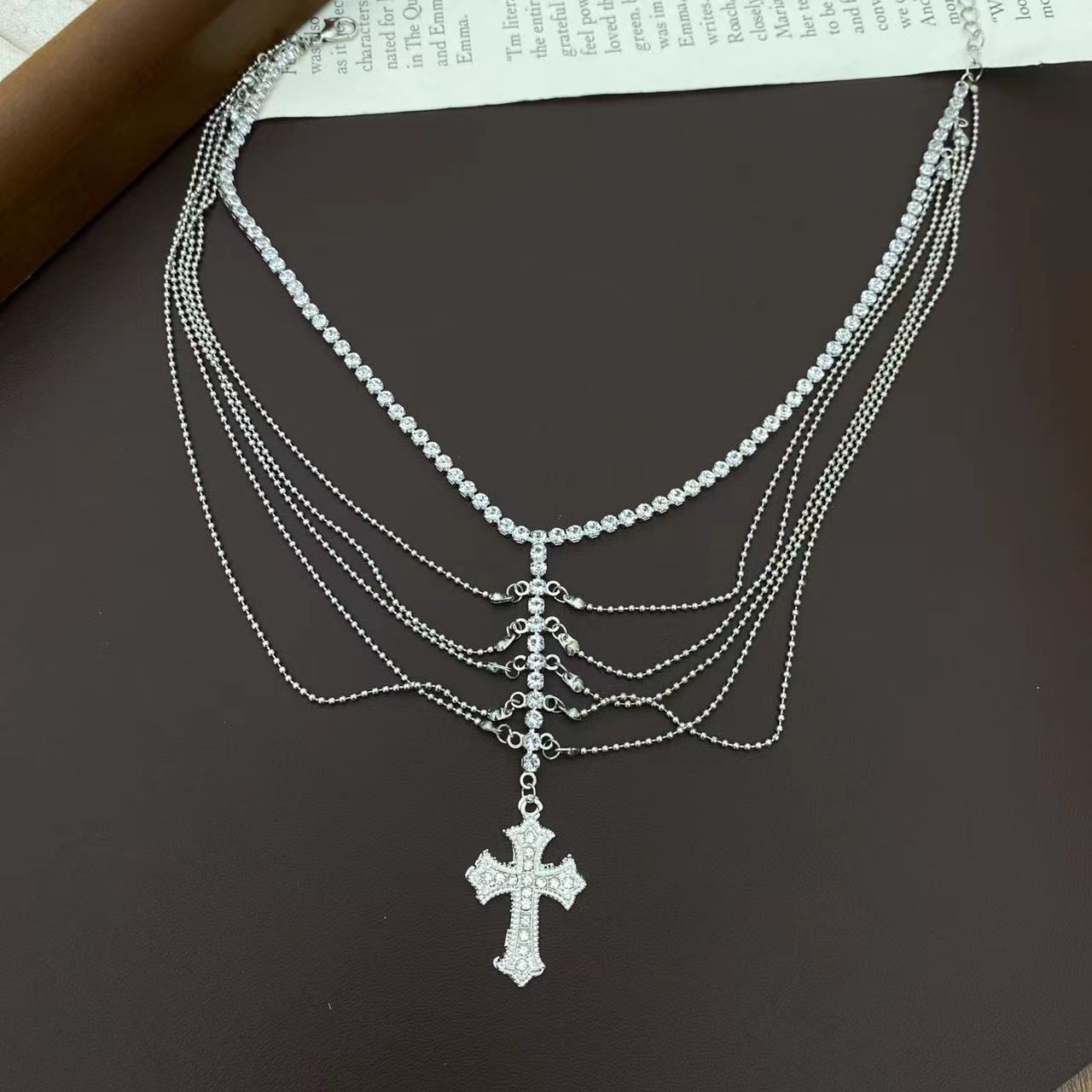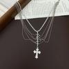 Collar con colgante de cruz de alta calidad para mujer, cadena de clavícula exquisita con circonitas brillantes multicapa, collar elegante y ligero de lujo.