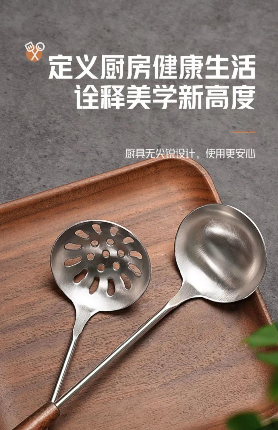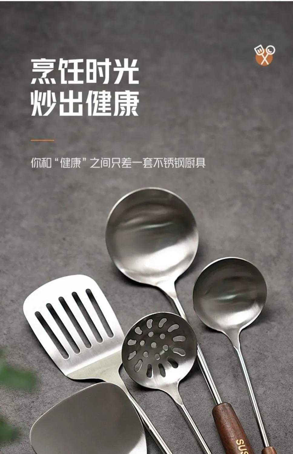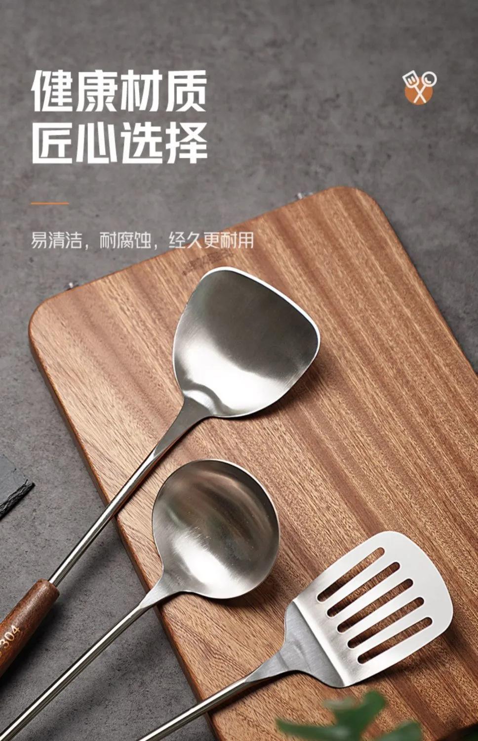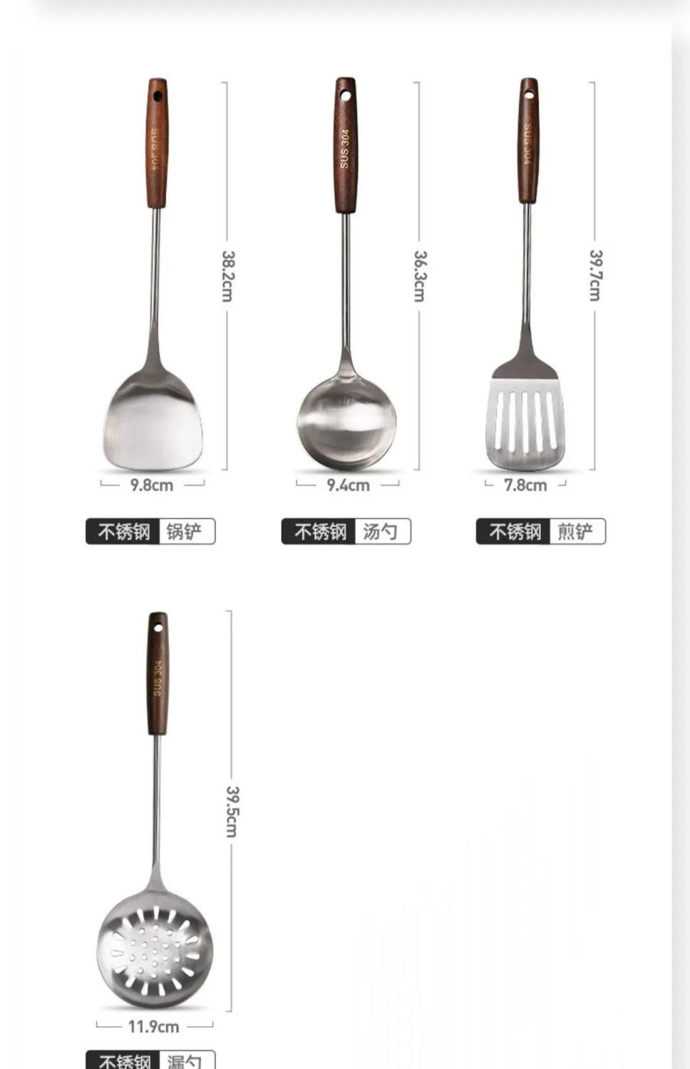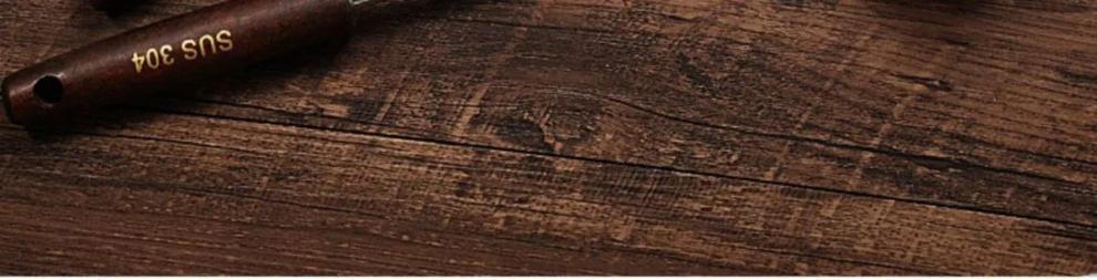 Espátula de acero inoxidable 304, pala para saltear, cuchara sopera con mango de madera vintage, colador, aislamiento térmico, pala doméstica, cuchara, traje