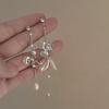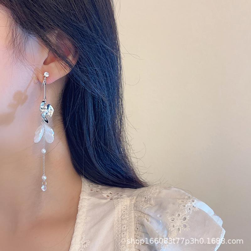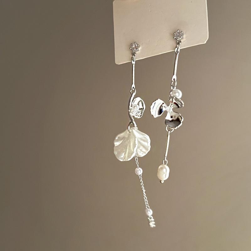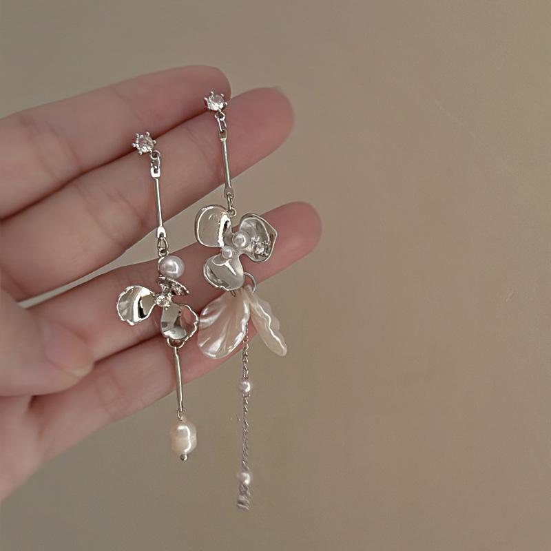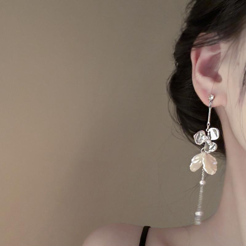 Pendientes asimétricos de perlas y flores de metal francés con súper hadas y aguja plateada, ligeros, de lujo, de gran sentido, elegantes y de nicho.
