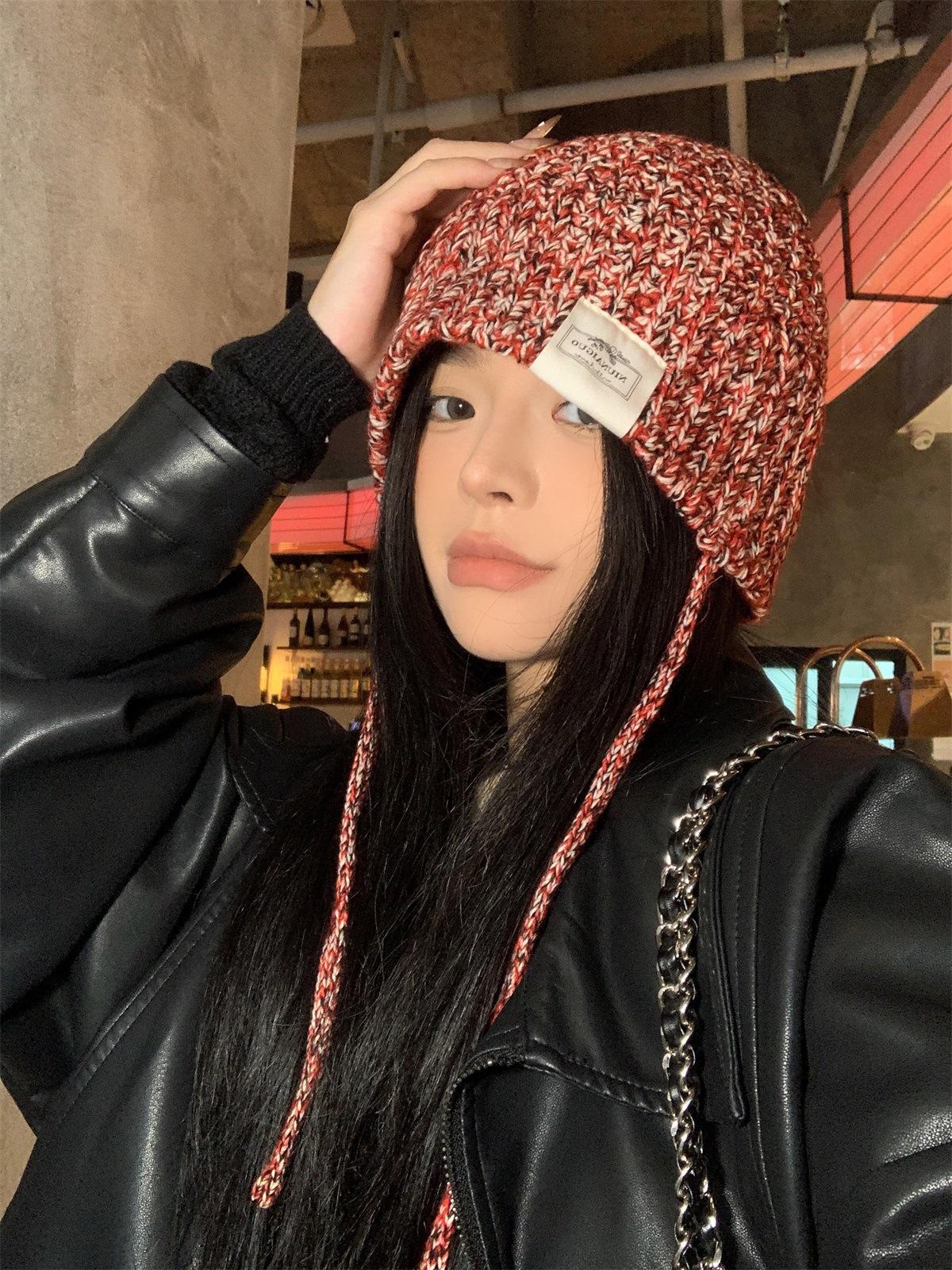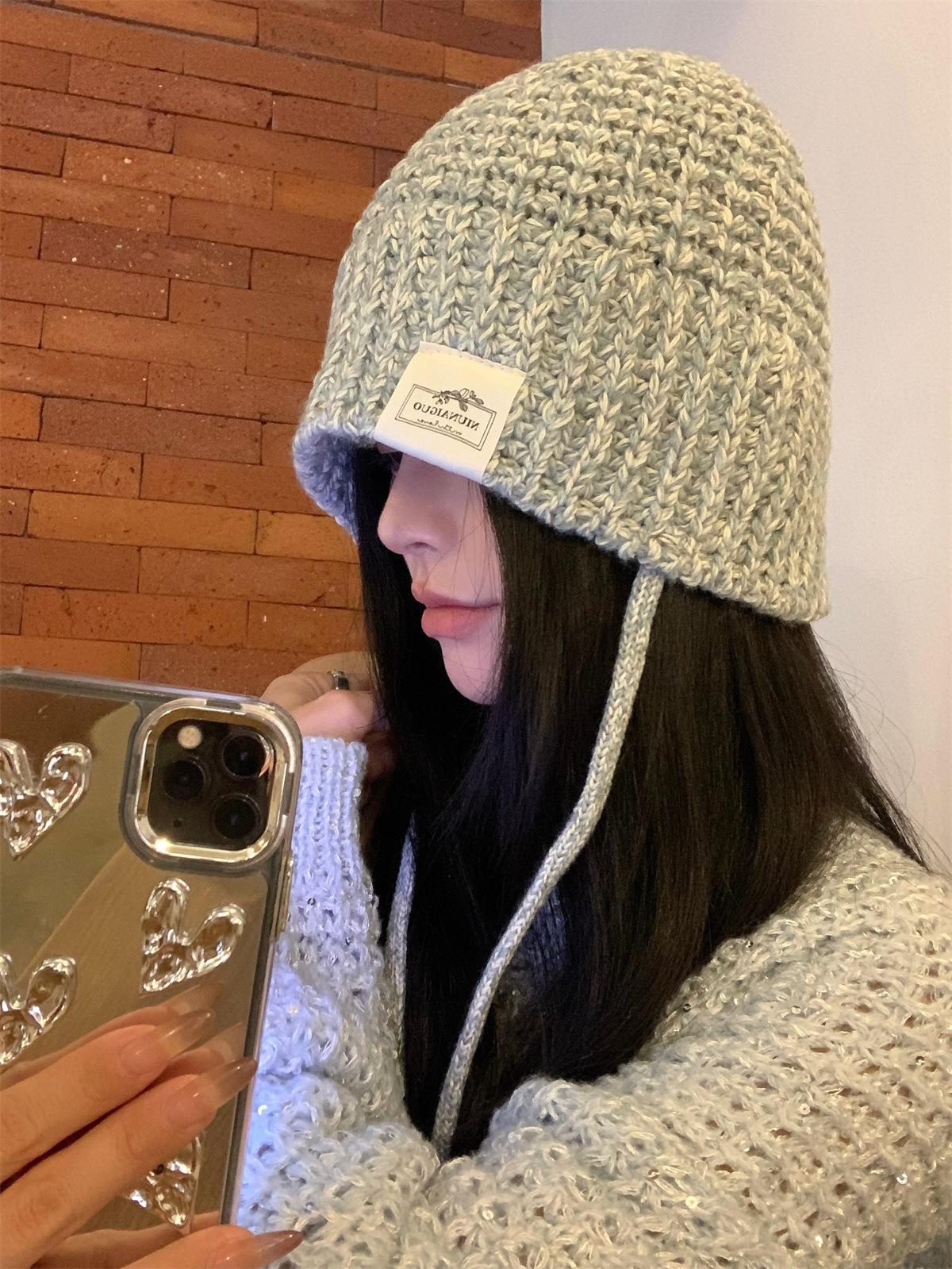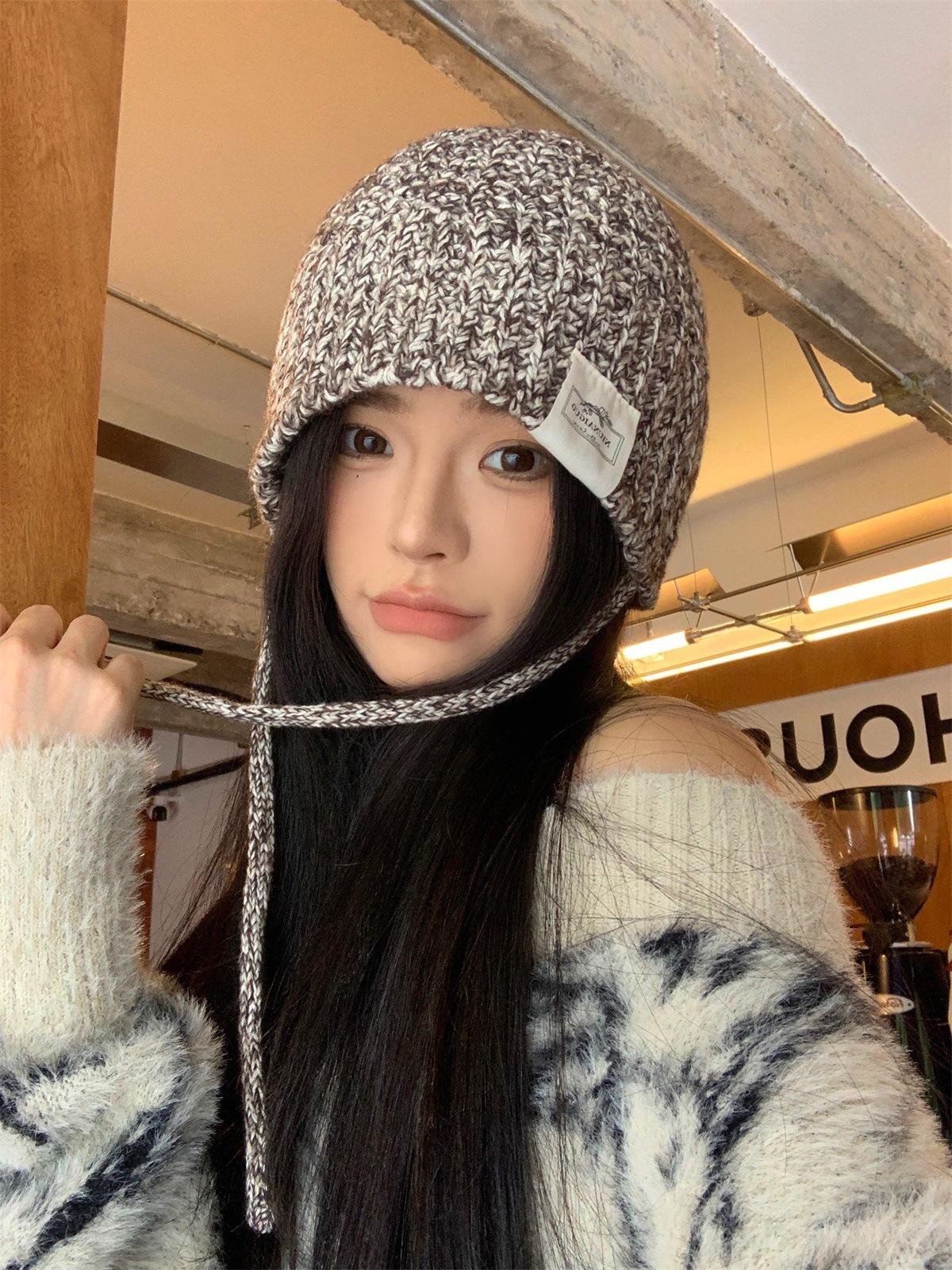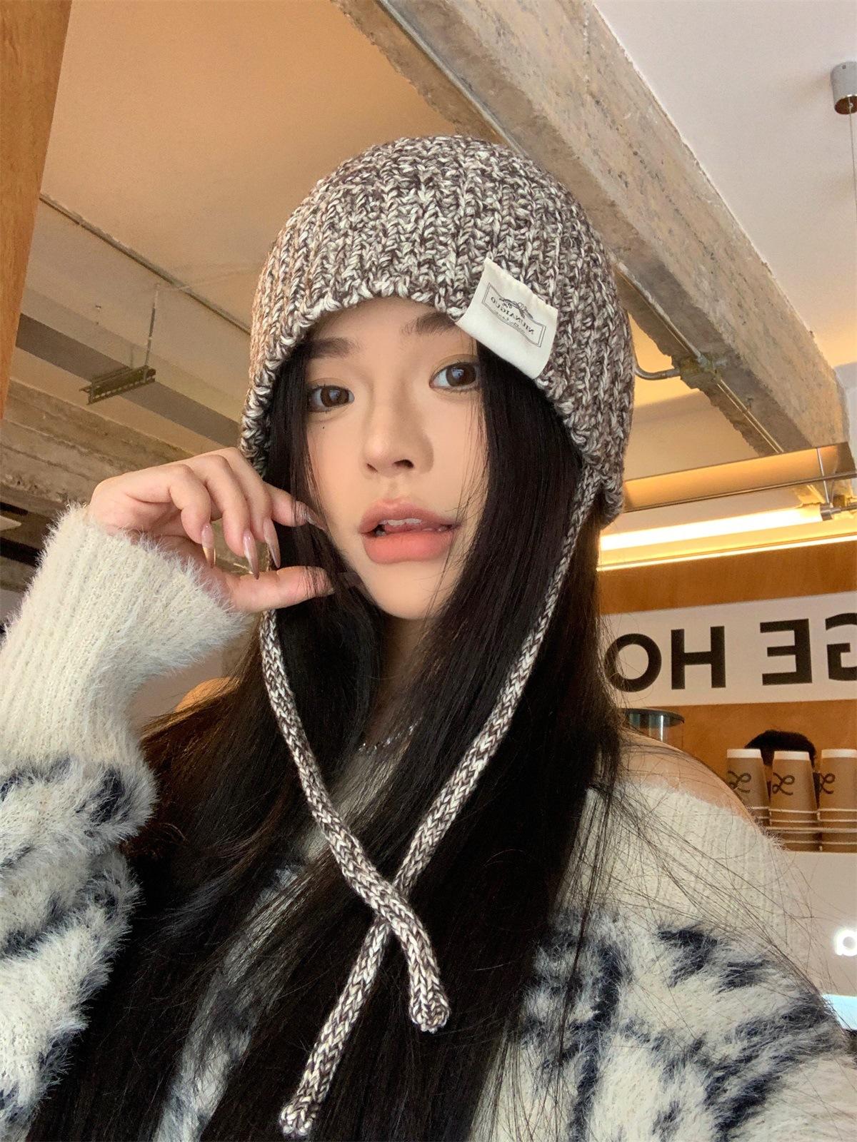 Corea del Sur Ins Color de Contraste Vintage Sombrero de Pescador de Punto para Mujer Otoño e Invierno Sombrero de Lana con Cordones Cálido Protector de Orejas Sombrero para la Cabeza