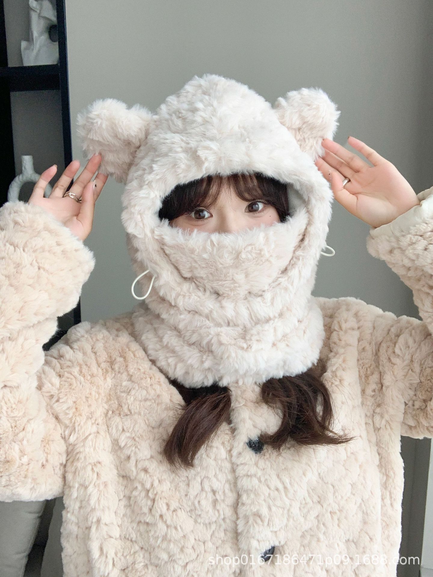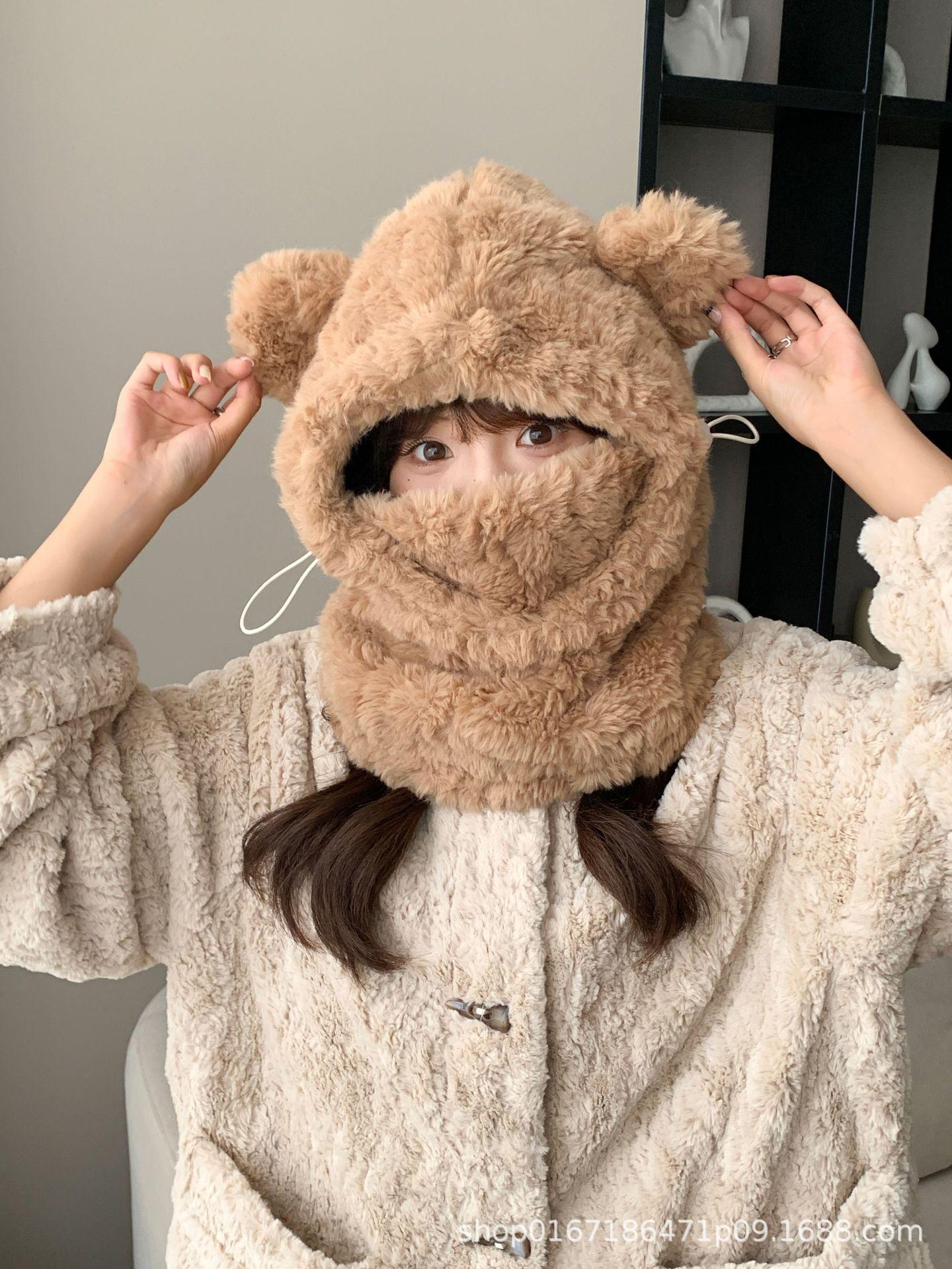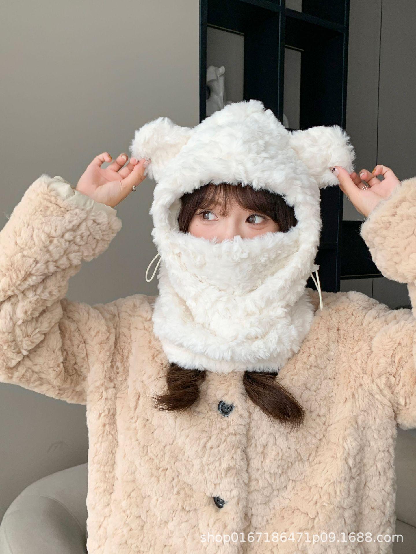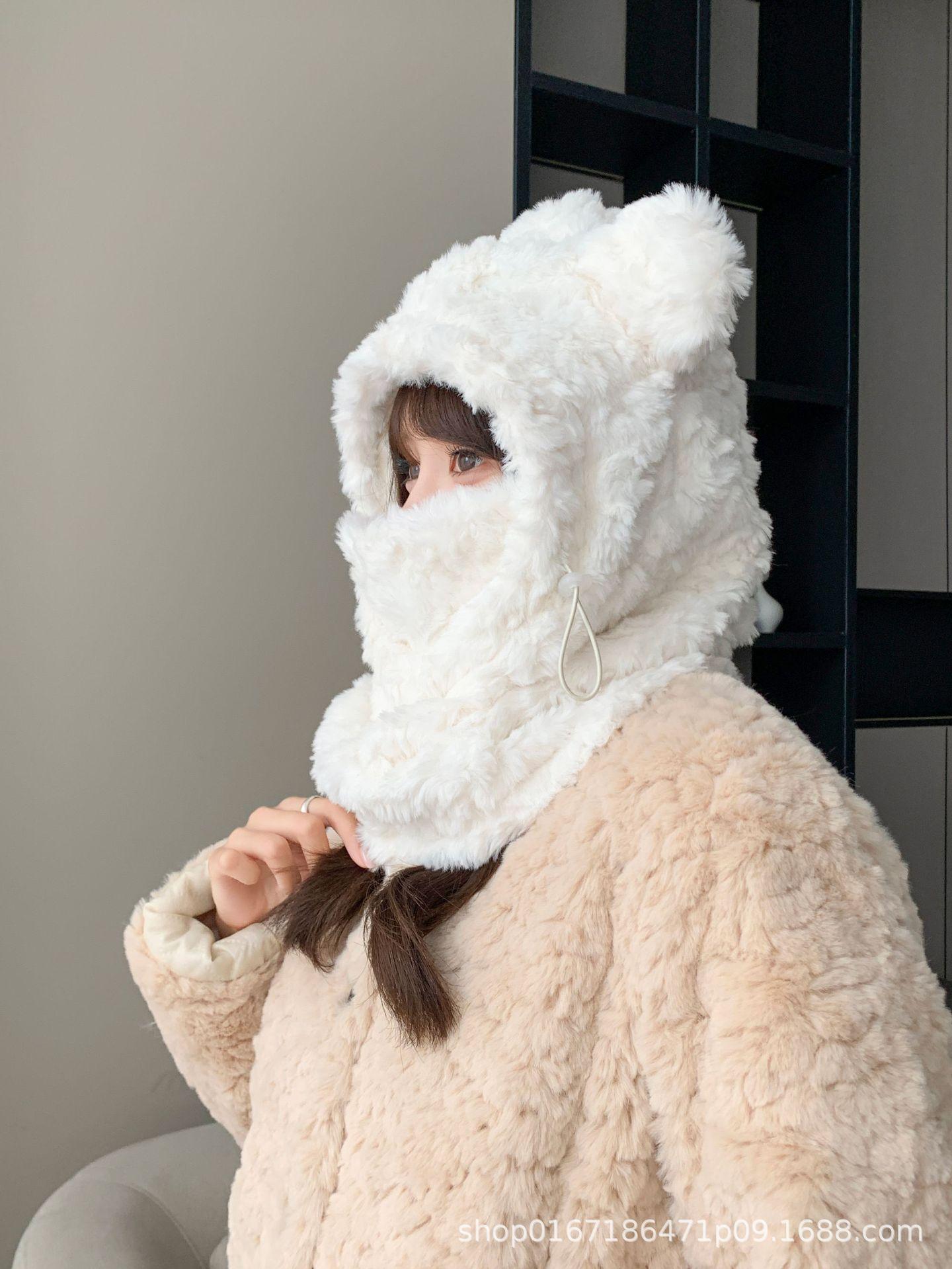 Gorro de felpa con orejeras tejidas, máscara, bufanda de una pieza, cálido, a prueba de frío, sombrero Lei Feng para mujer, invierno, grueso, con forro polar