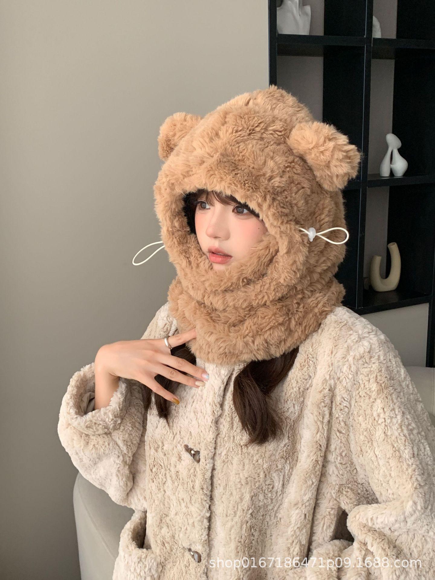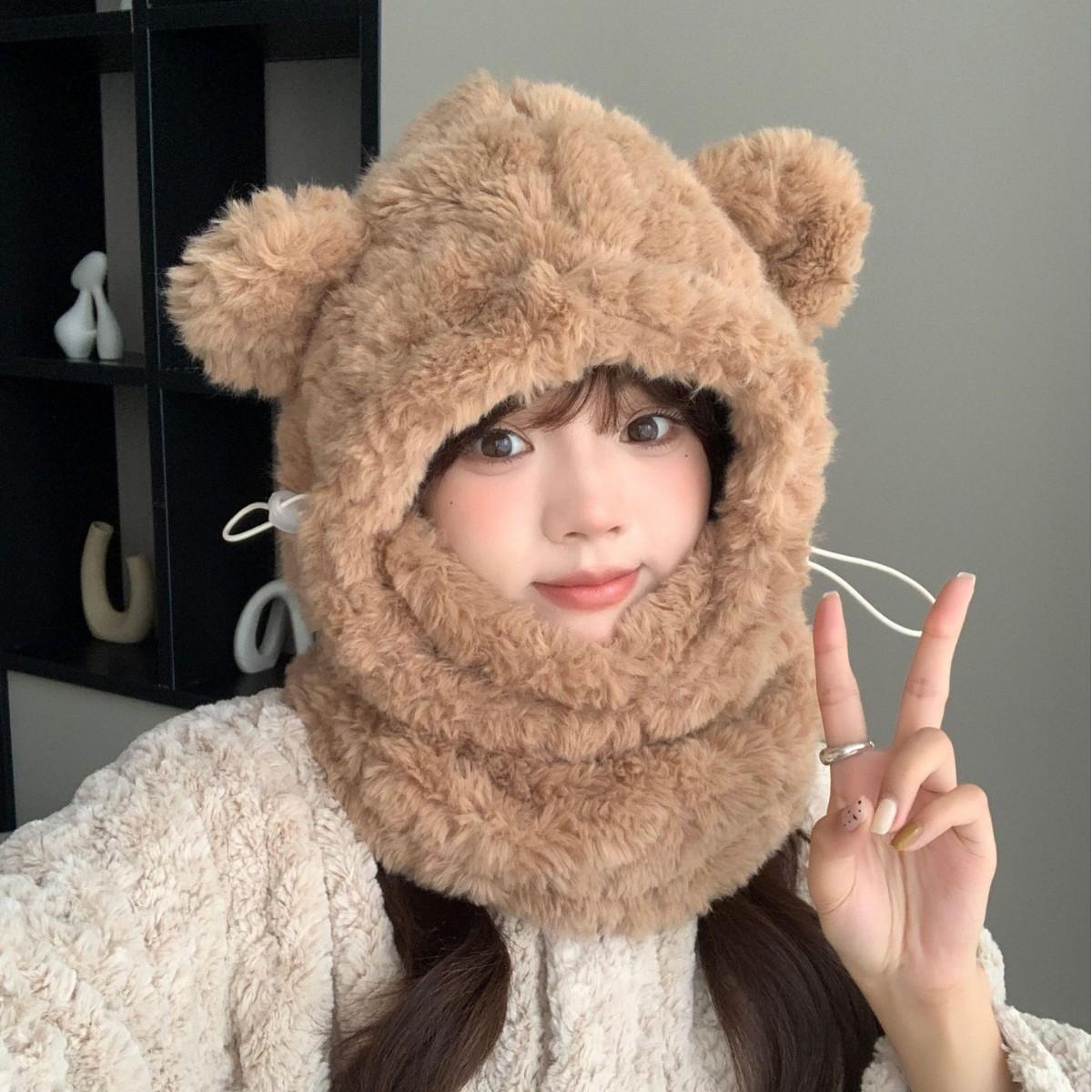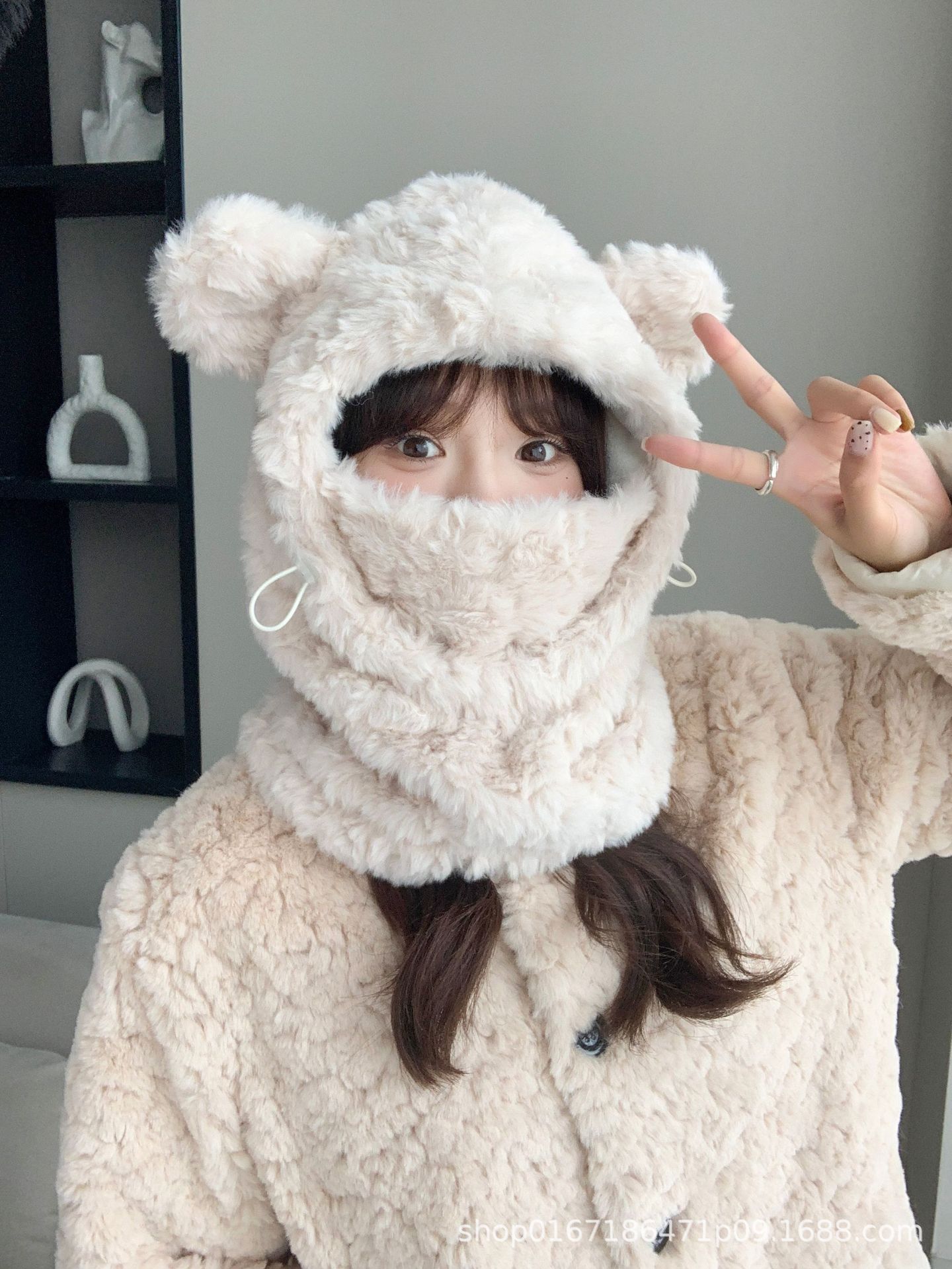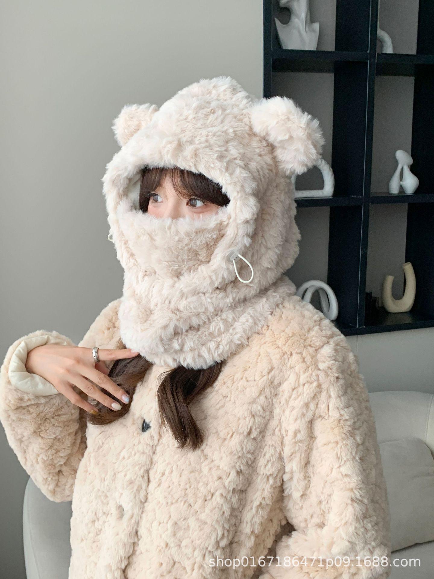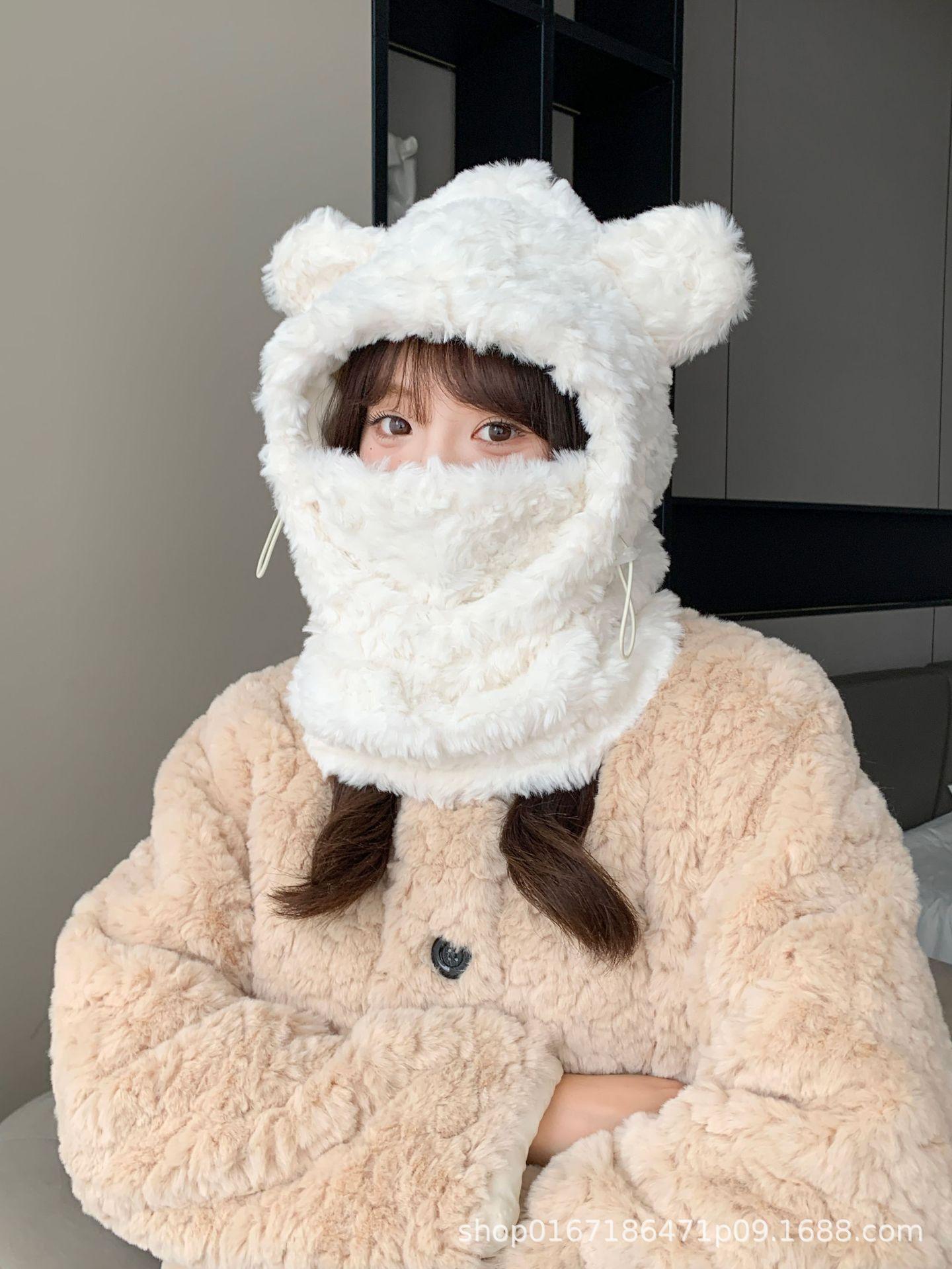 Gorro de felpa con orejeras tejidas, máscara, bufanda de una pieza, cálido, a prueba de frío, sombrero Lei Feng para mujer, invierno, grueso, con forro polar