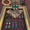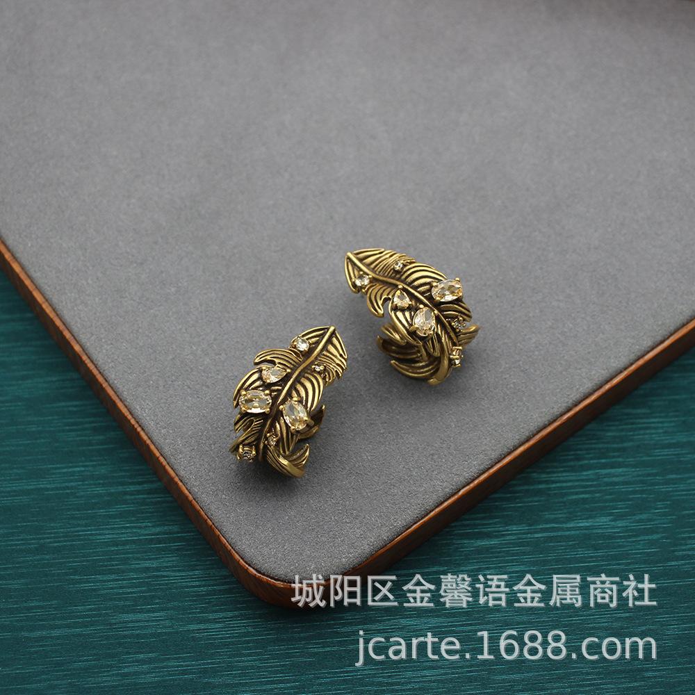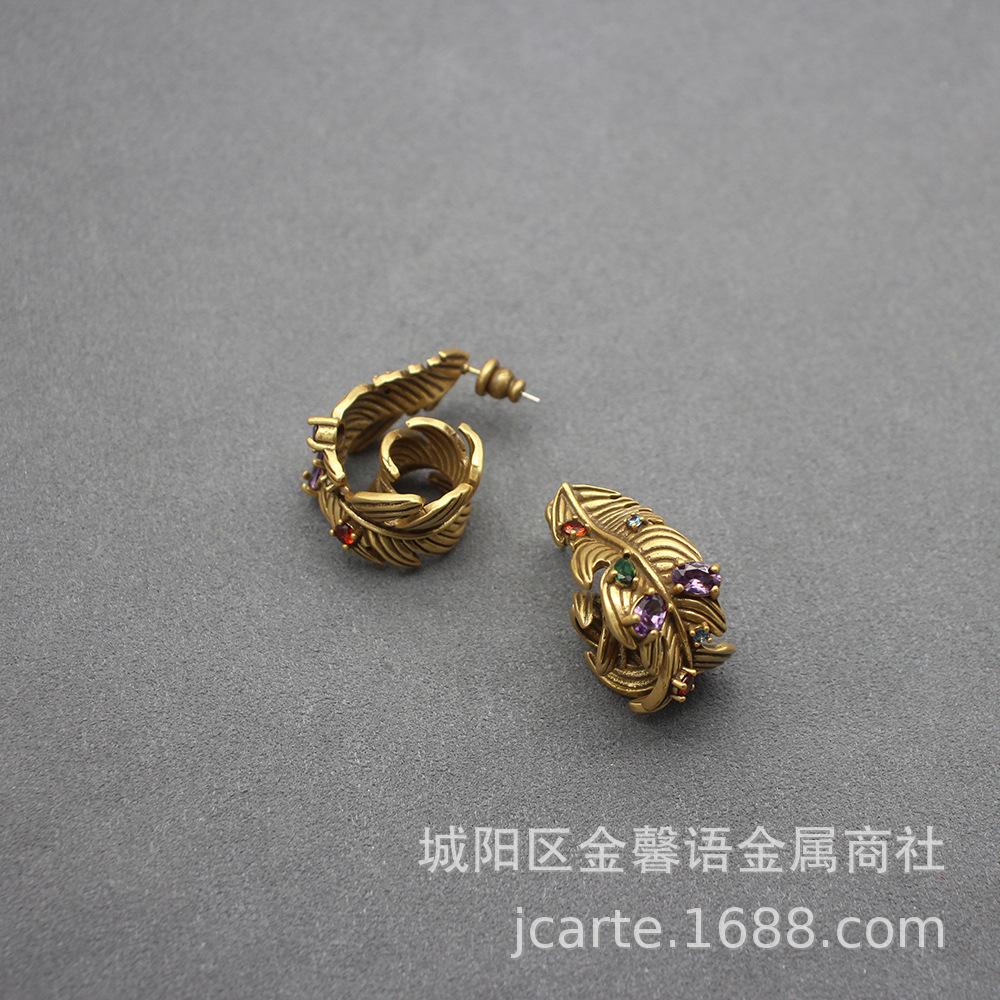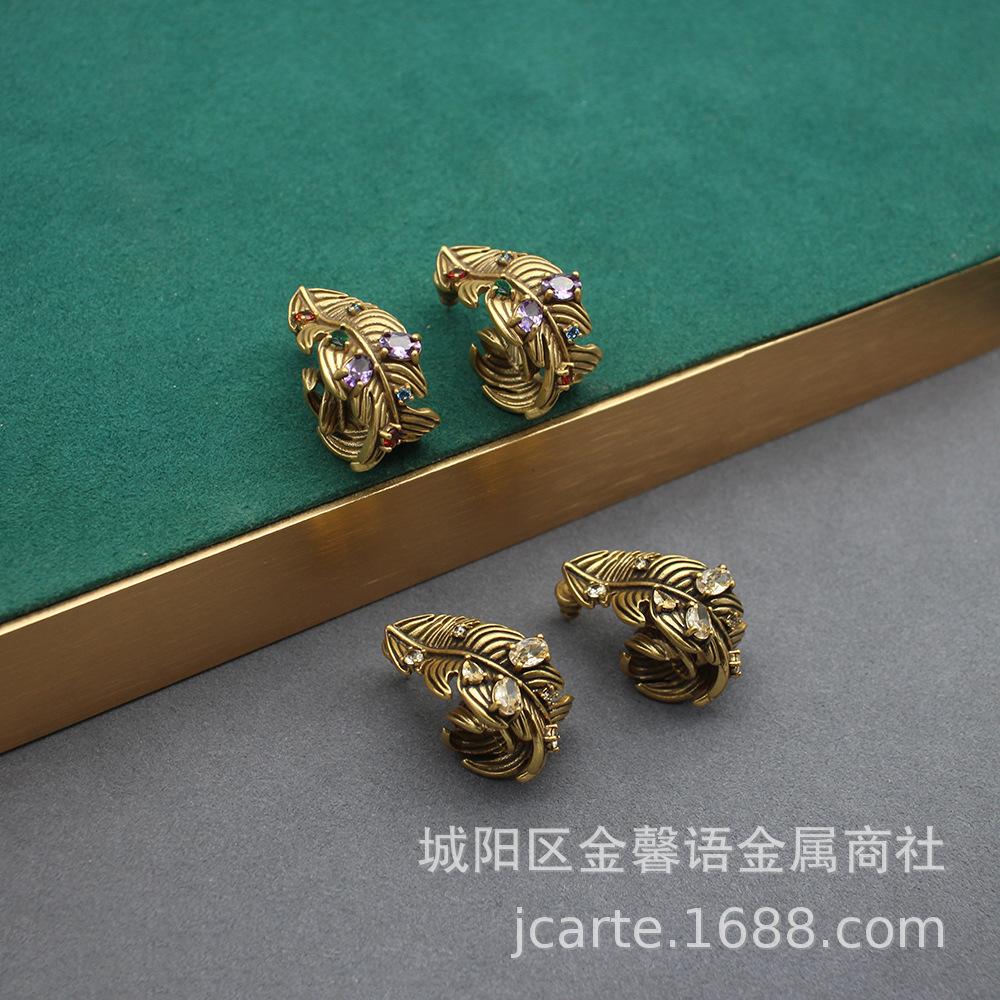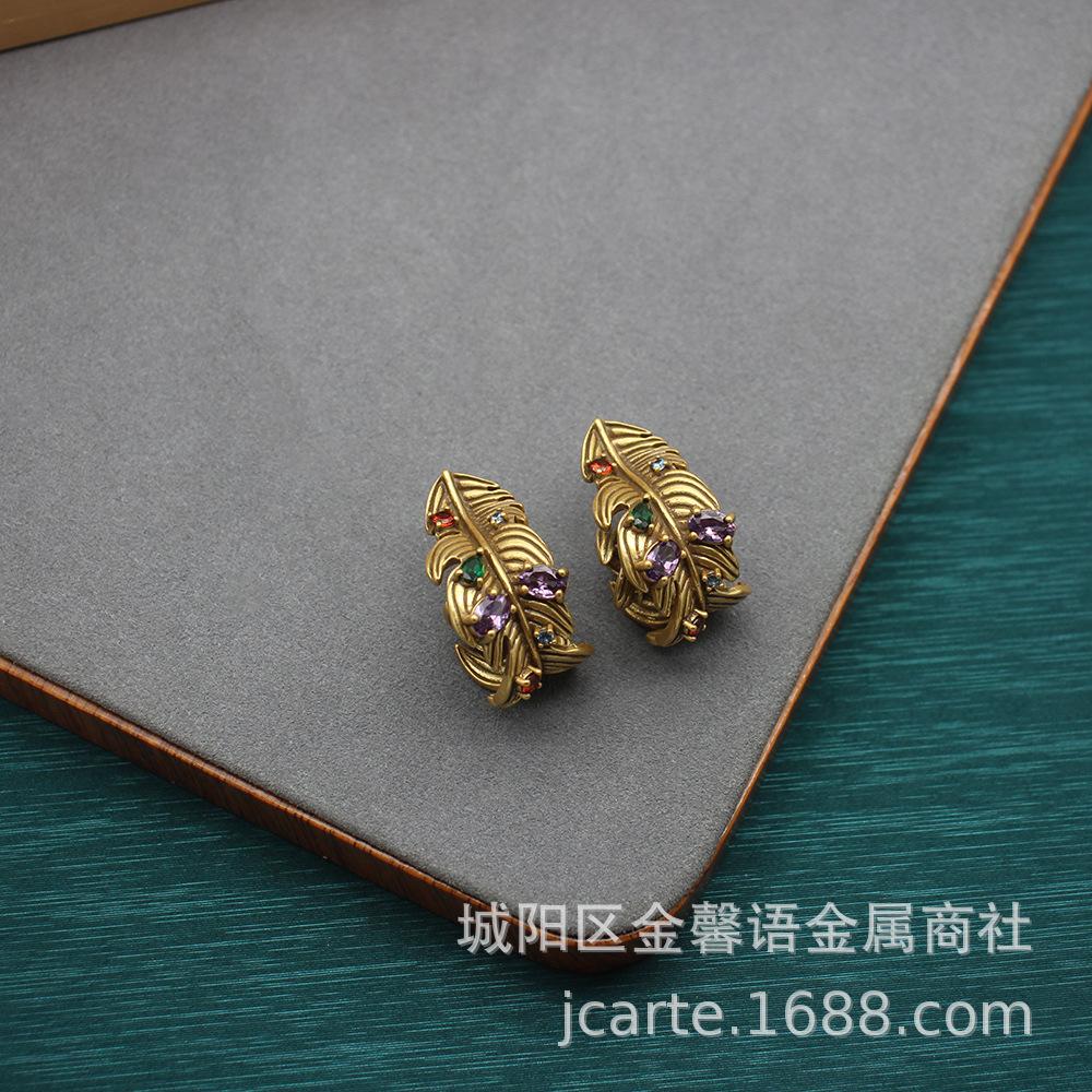 Pendientes vintage de estilo medio antiguo con plumas de circón y oro viejo, chapados en cobre, oro auténtico, aguja de plata 925, joyería italiana sin nicho.