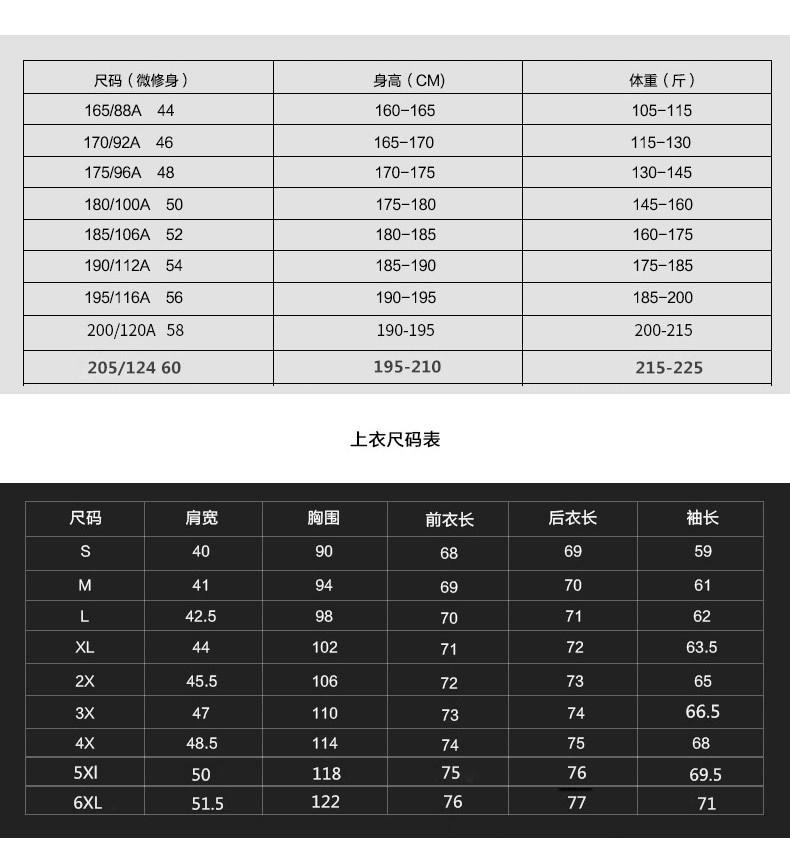 165-S, 170-M, 175-L, 180-XL, 185-XXL, 190-3XL, 195-4XL