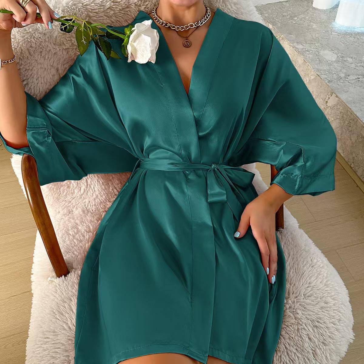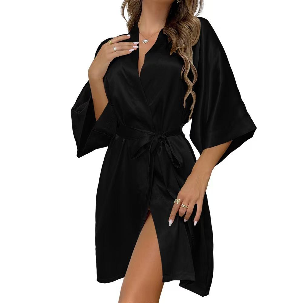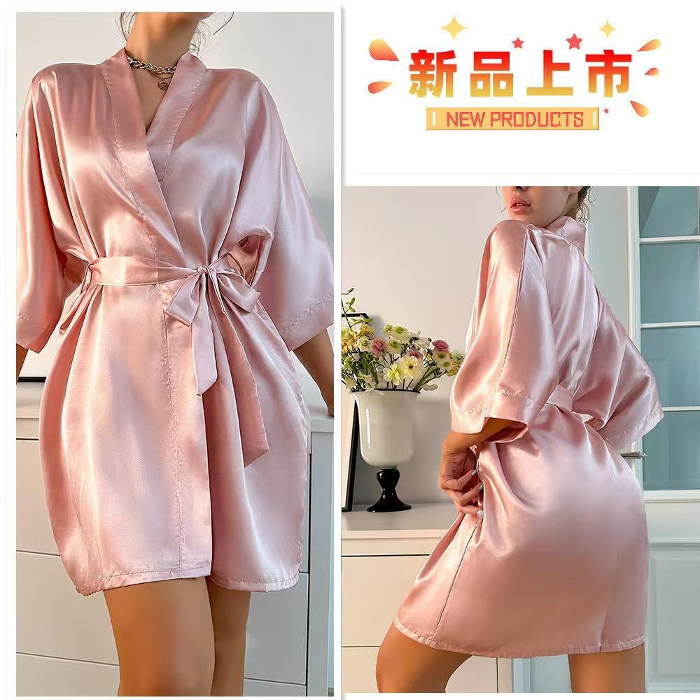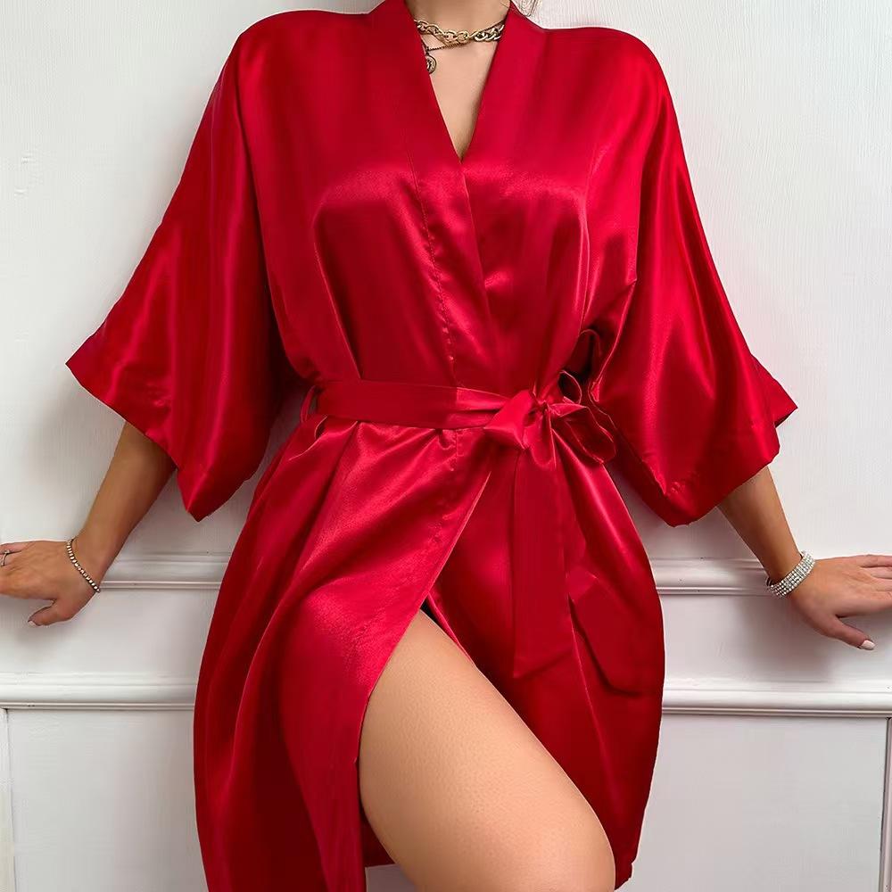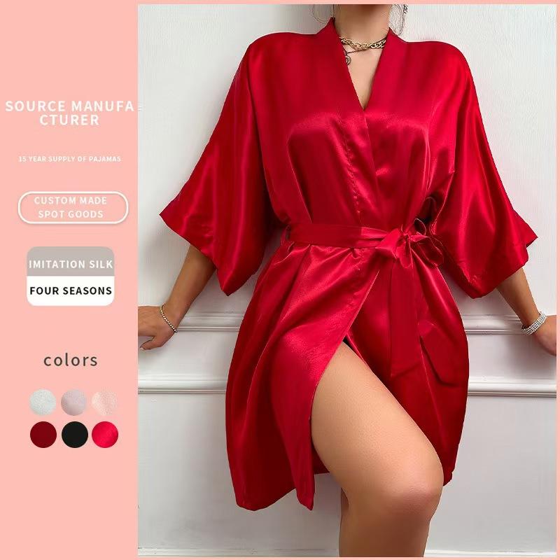 Camisón de seda sexy de talla grande europeo y americano transfronterizo, pijama informal fino, cárdigan holgado sencillo con cordones, bata de baño para mujer