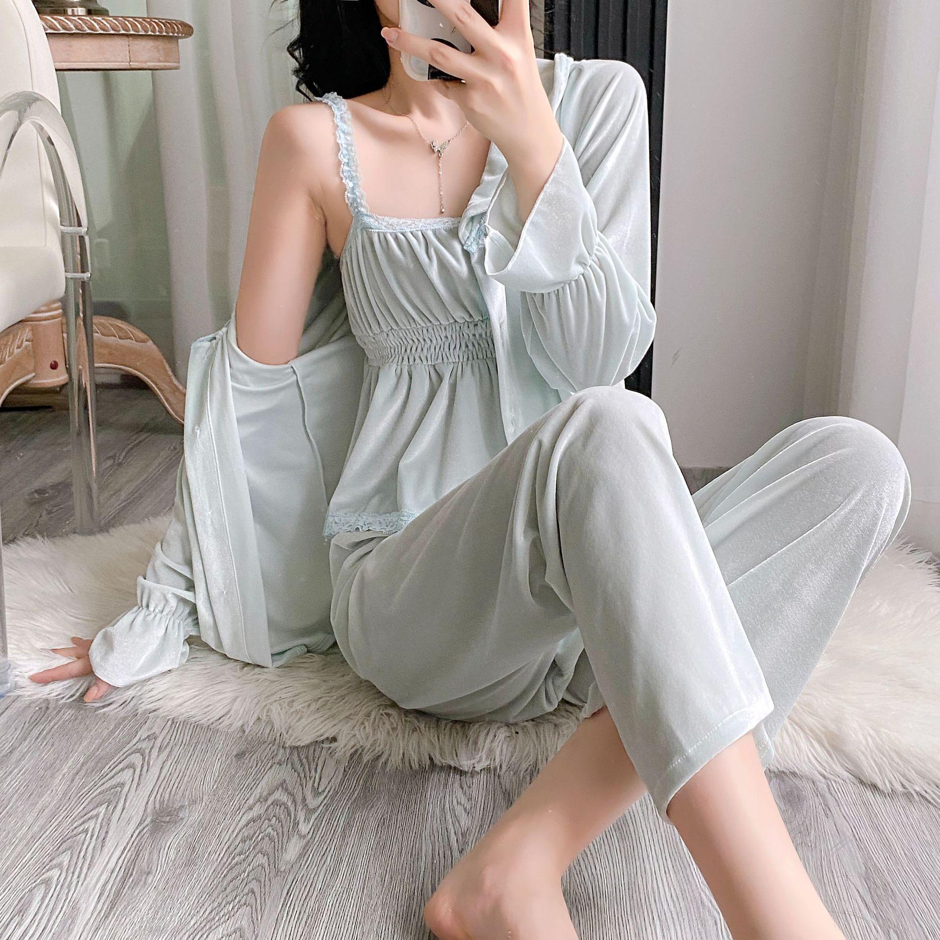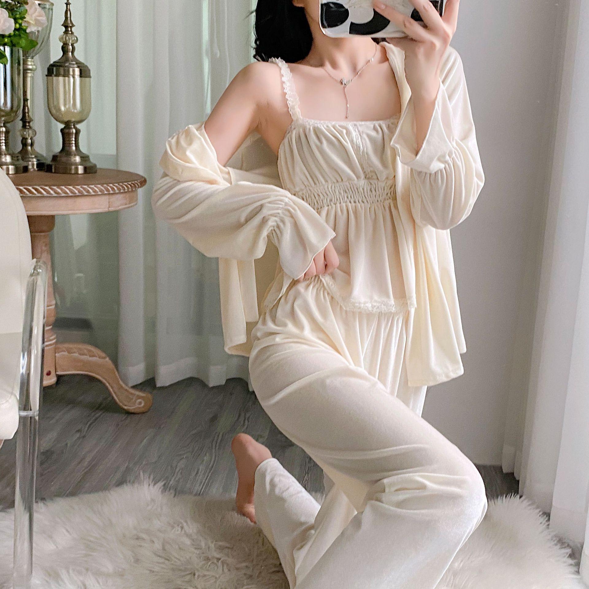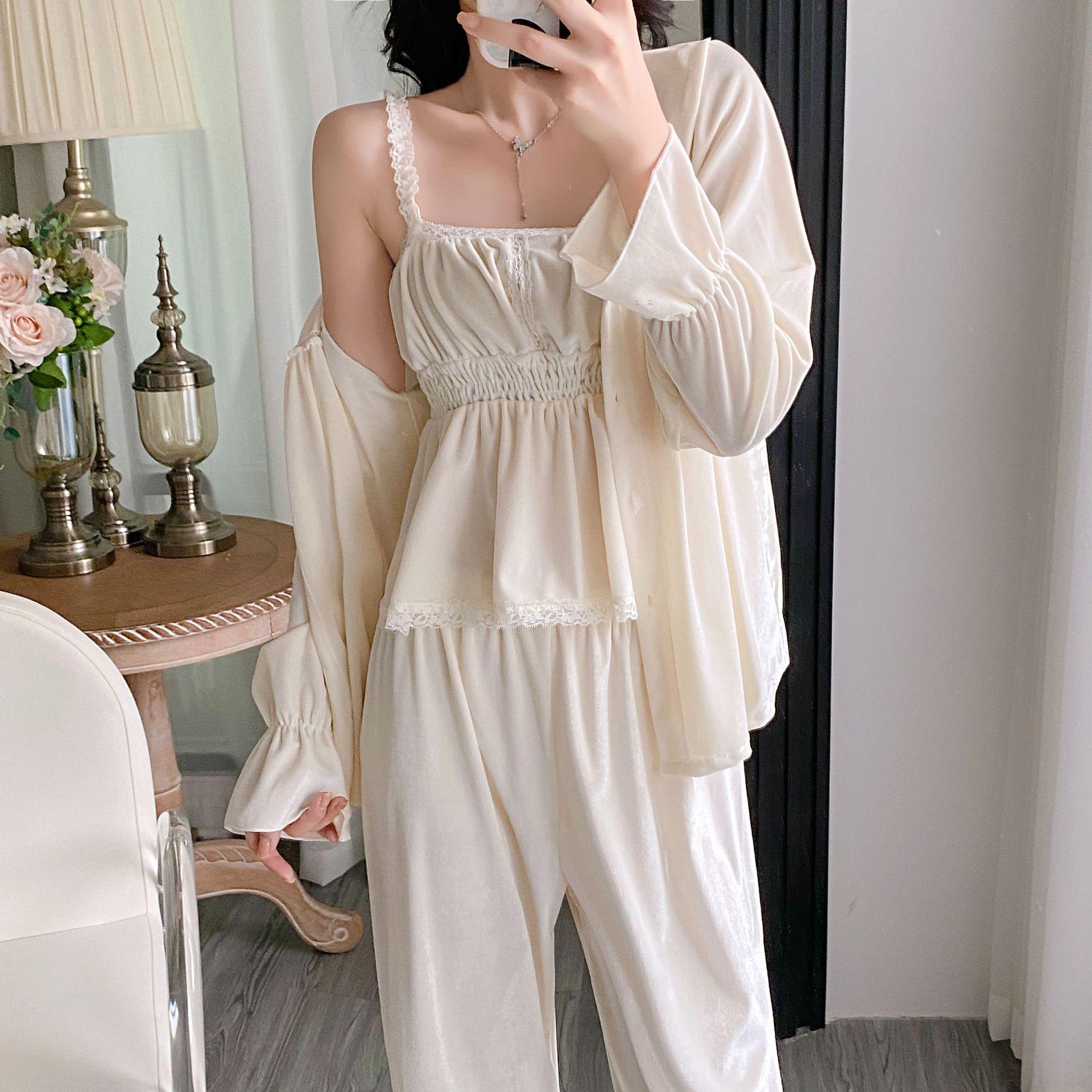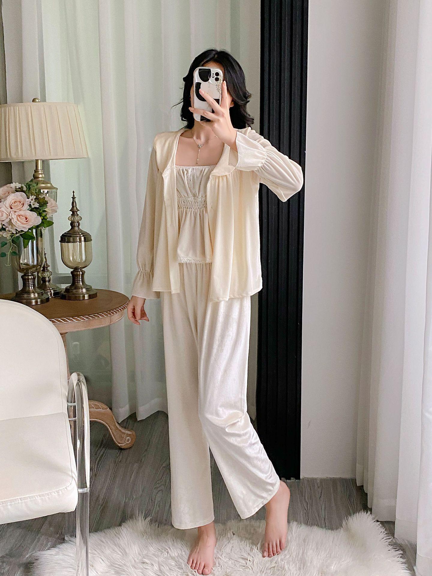 Otoño Nuevo Pijama de Terciopelo Dorado para Mujer Sexy Tirantes Pantalones Camisón Conjunto de Tres Piezas Deseo Puro Ropa para el Hogar Traje Francés