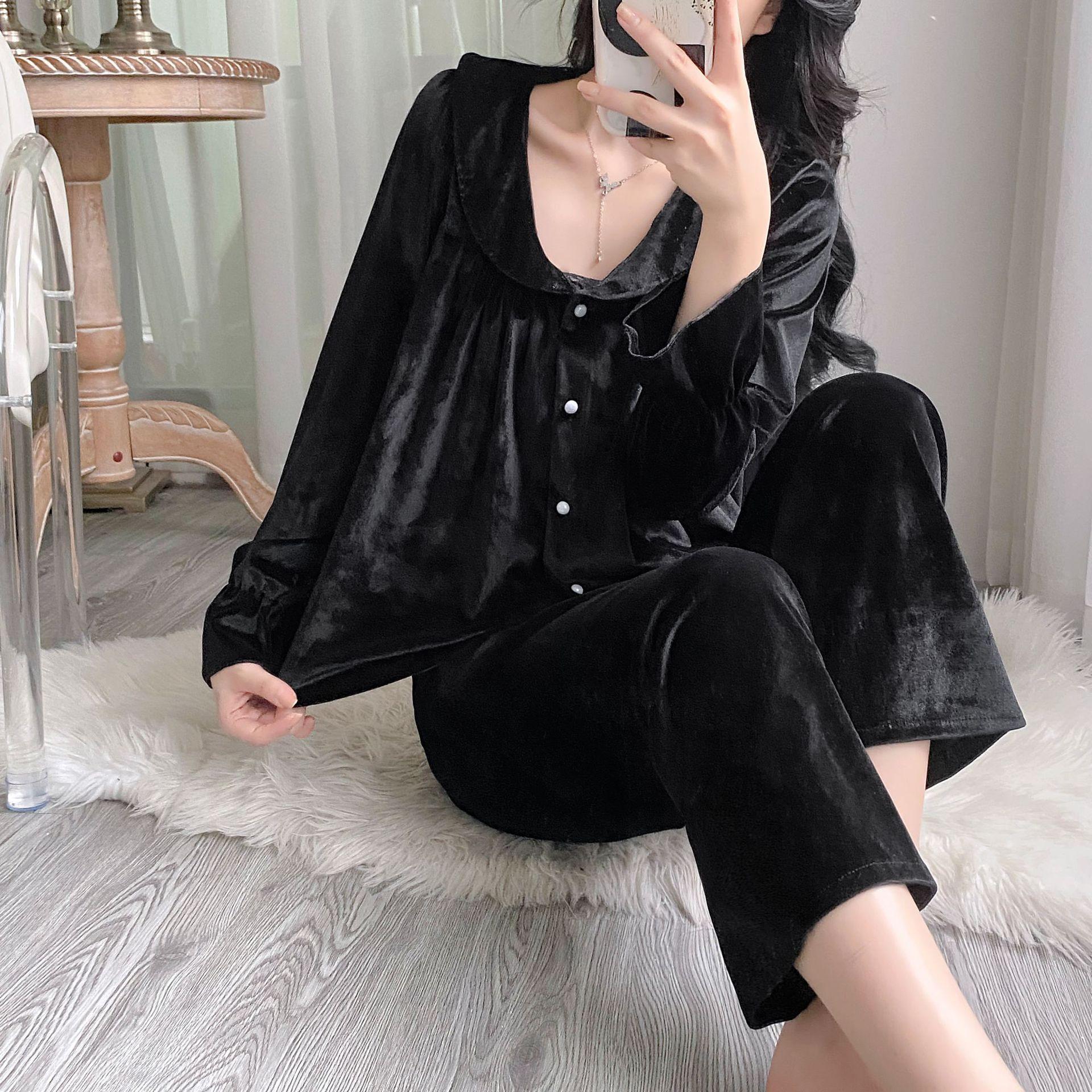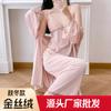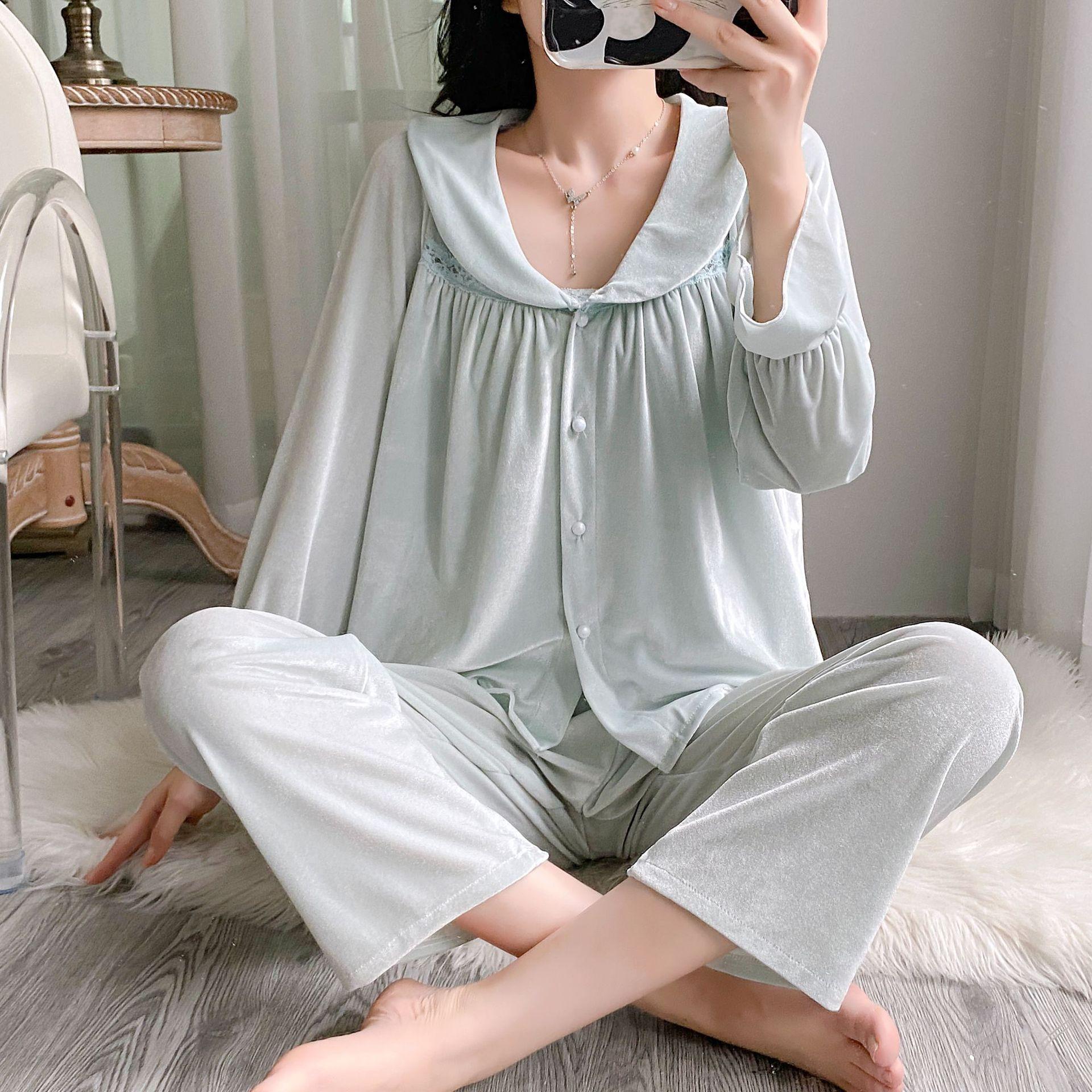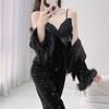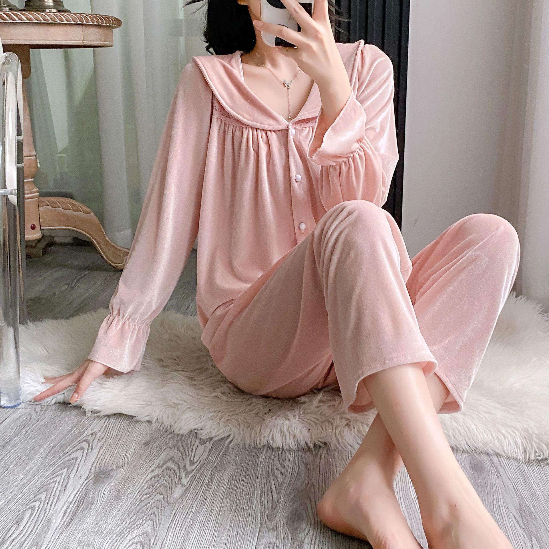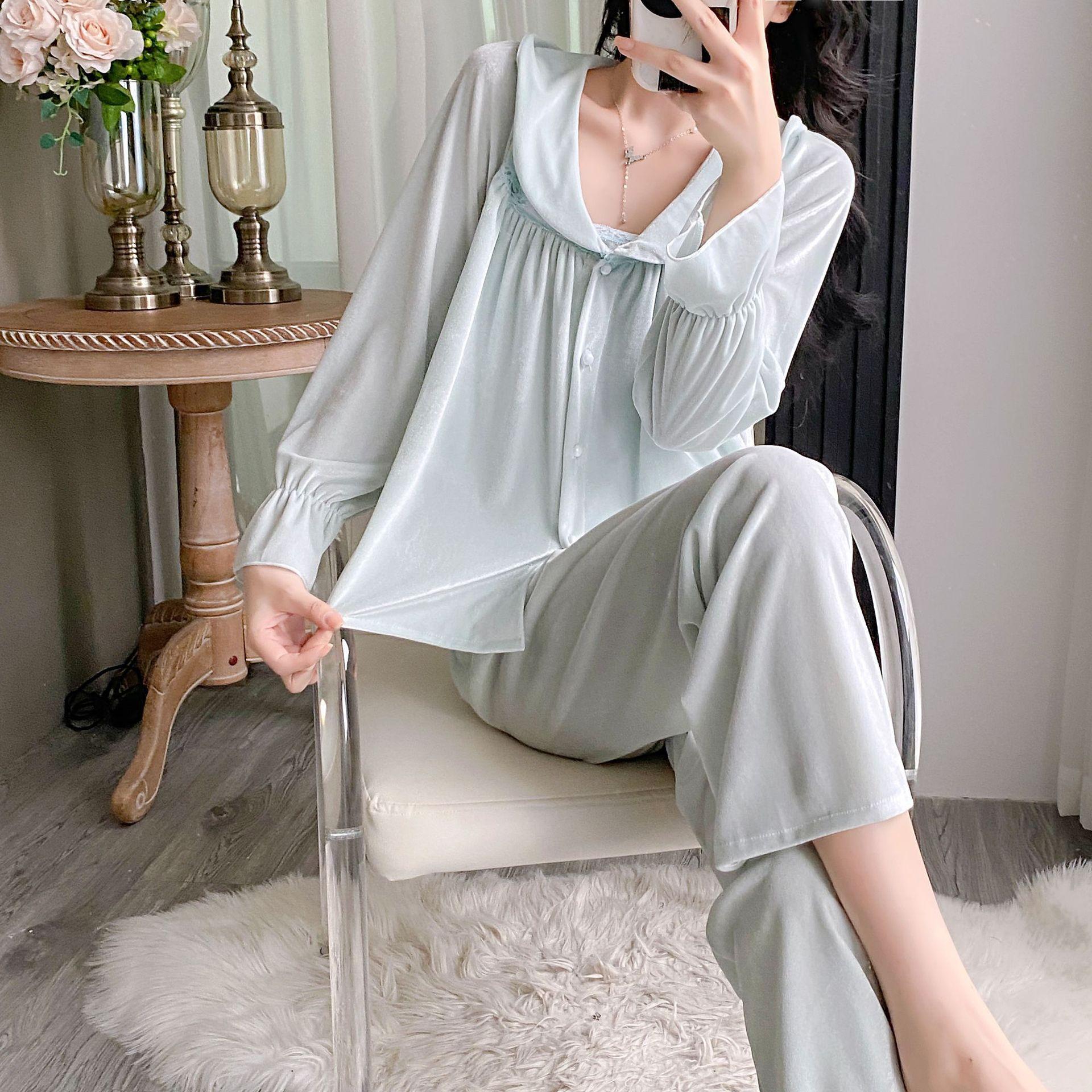 Otoño Nuevo Pijama de Terciopelo Dorado para Mujer Sexy Tirantes Pantalones Camisón Conjunto de Tres Piezas Deseo Puro Ropa para el Hogar Traje Francés