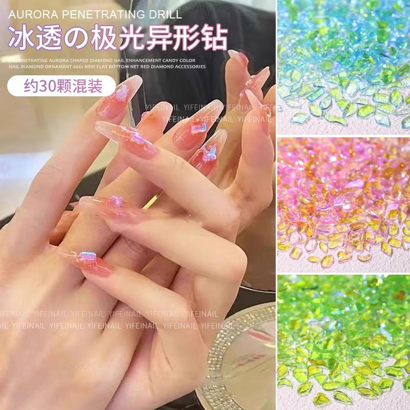 Taladro para decoración de uñas Aurora de color transparente con forma de hielo, rojo, destello, cristal de color transparente, base plana, forma especial, adornos para decoración de uñas de color mixto
