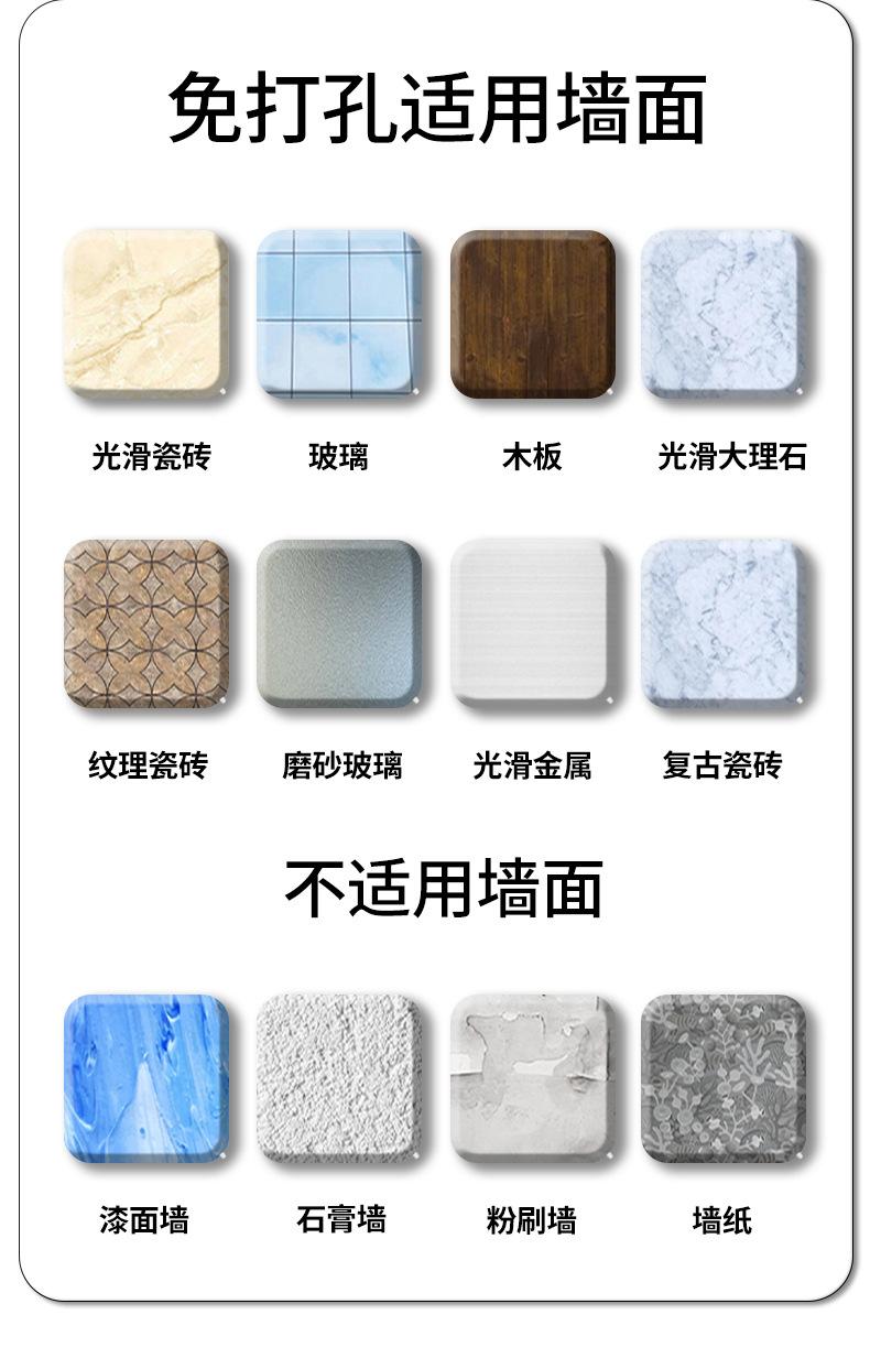 (2) Tenga en cuenta que la superficie de la pared debe ser plana y sólida, como baldosas de vidrio.No disponible enSobre paredes irregulares e inestables como paredes pintadas, papel pintado, paredes de cal, etc.