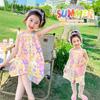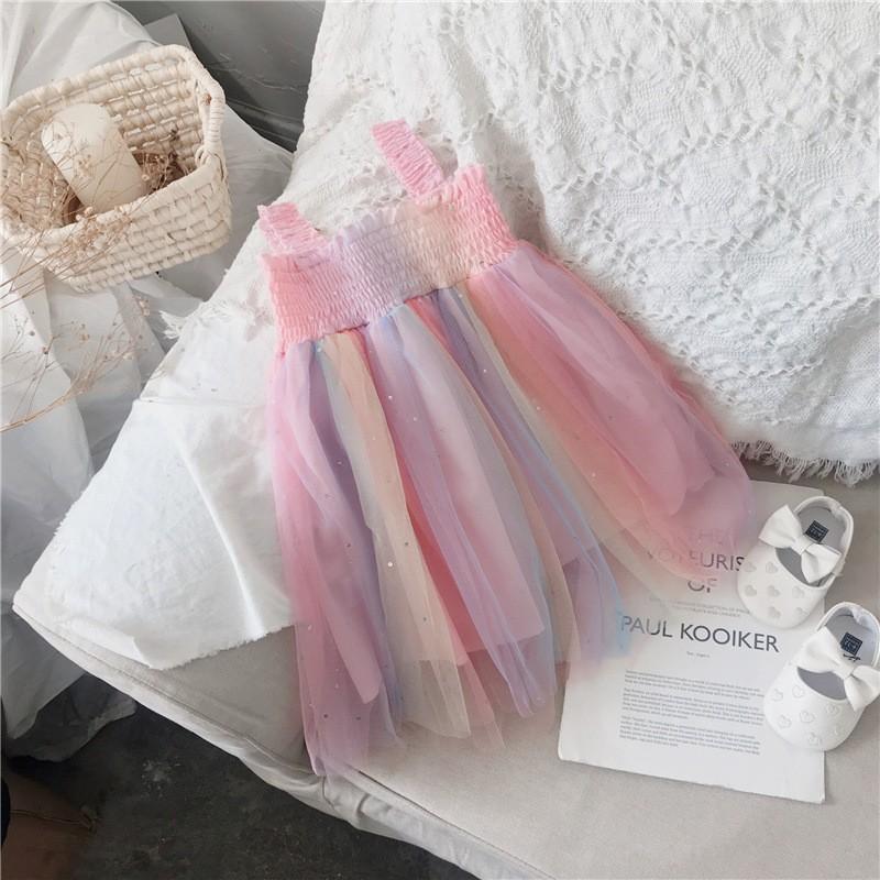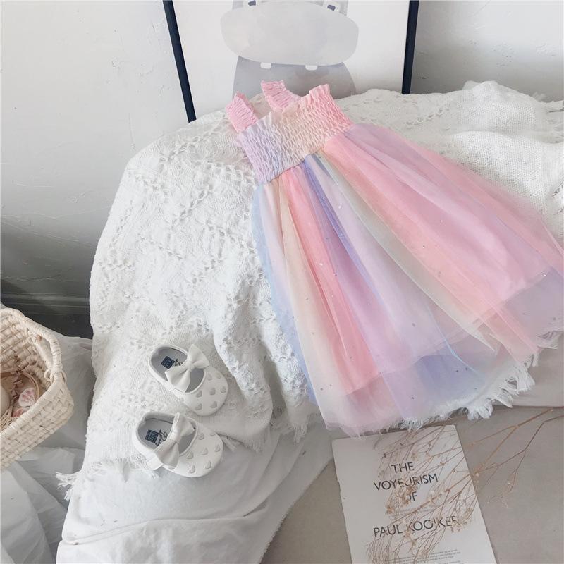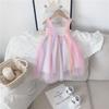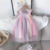 Vestido de verano para niña, elegante vestido de princesa con tirantes, vestido corto de verano arcoíris para niña con pelo