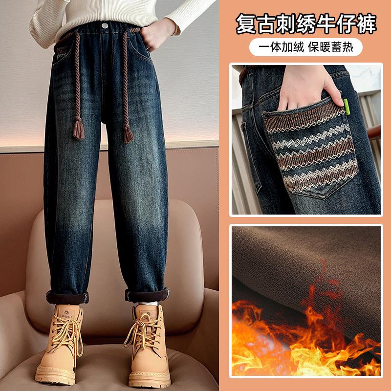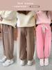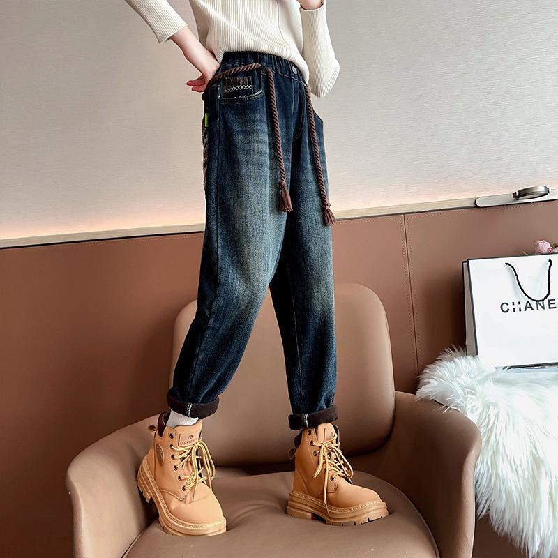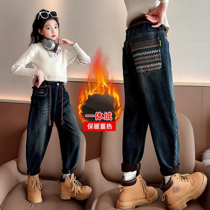Pantalones para niña con forro polar otoño e invierno 2023 nuevos para niños grandes, terciopelo de una pieza para exterior, pantalones de papá, jeans gruesos para niños
