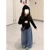 Traje para Niñas Primavera y Otoño 2024 Nuevo Estilo Coreano Estilo Occidental Niñas Manga Larga Cuello Redondo Top con Cintura Jeans Conjunto de Dos Piezas