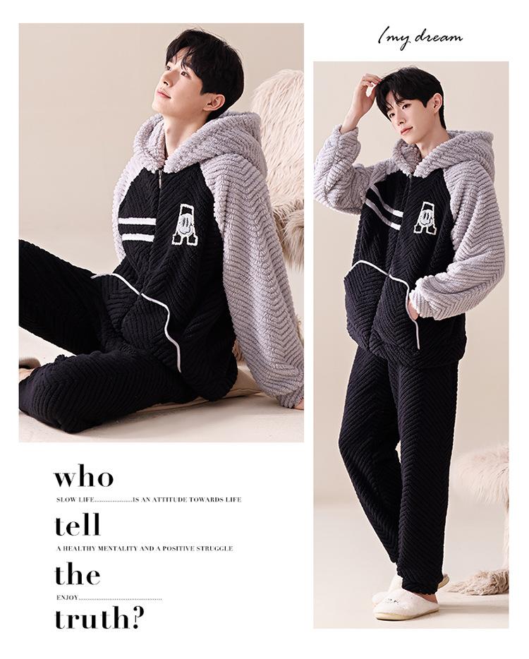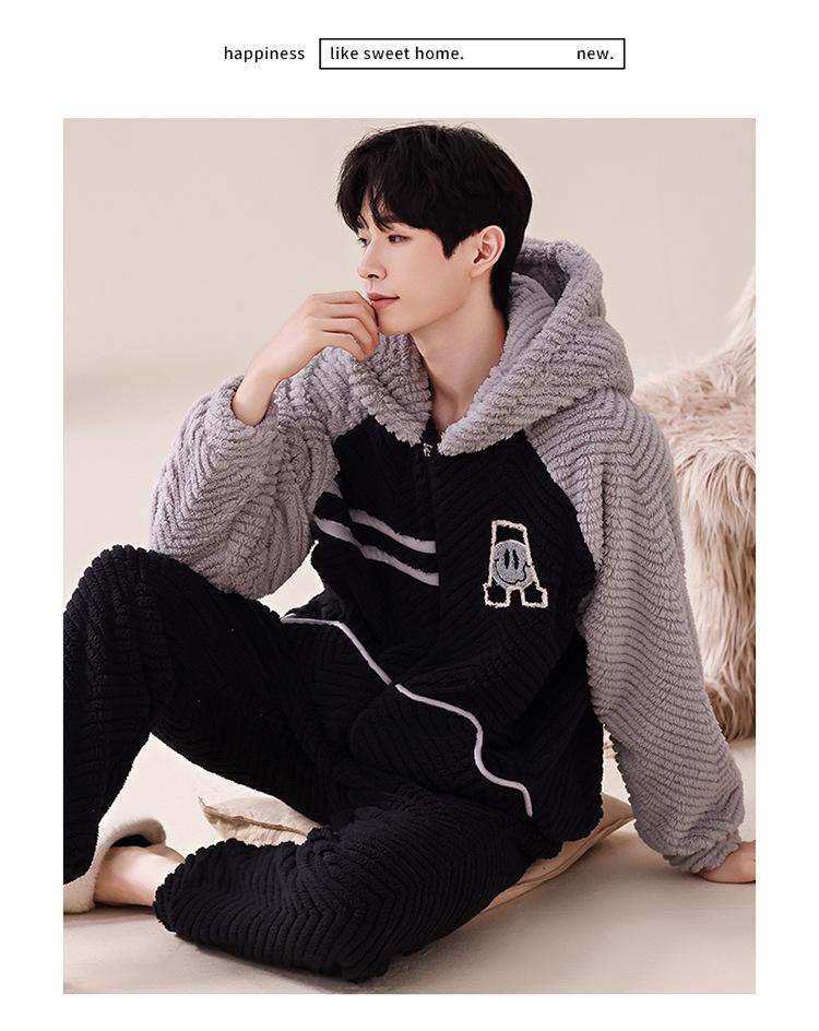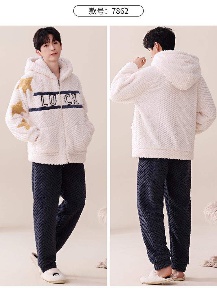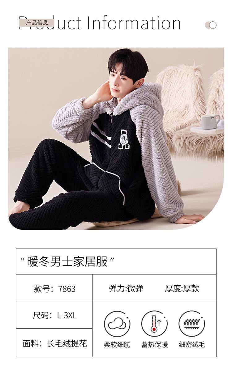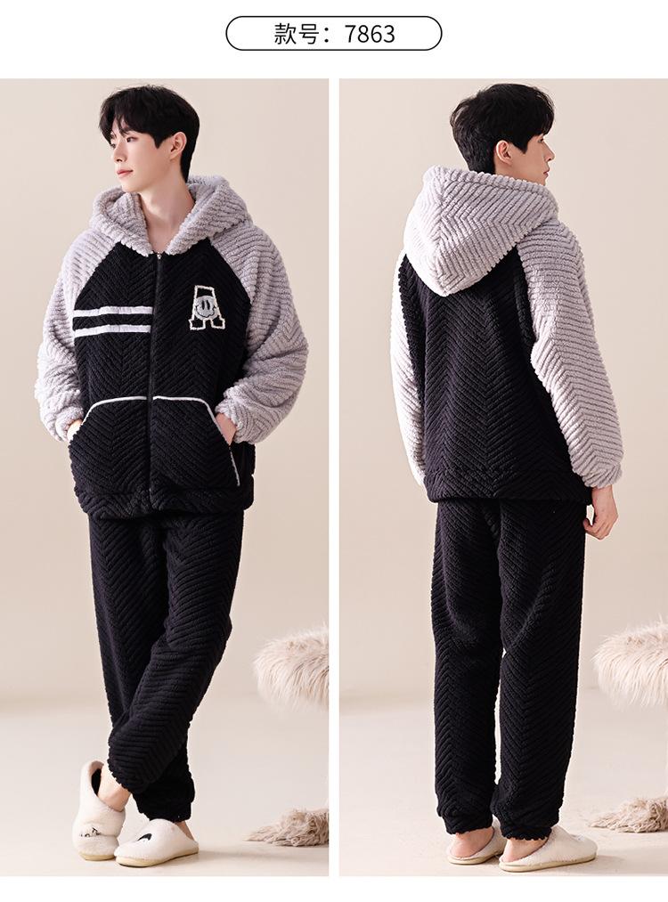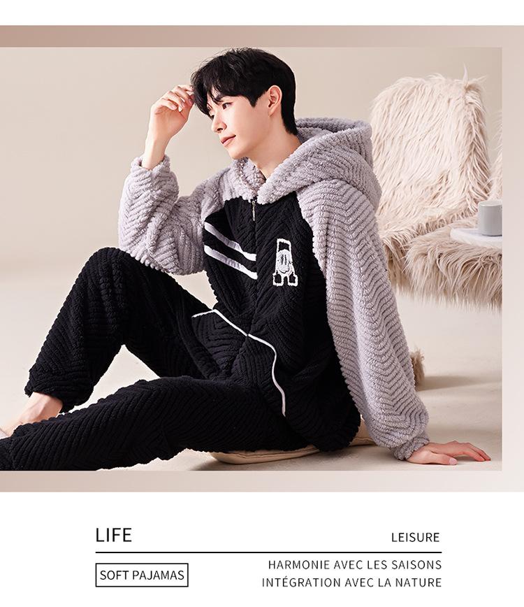 Pijama cálido de franela con forro polar para hombre, ropa de invierno con capucha y cremallera, forro polar coral grueso para el hogar.