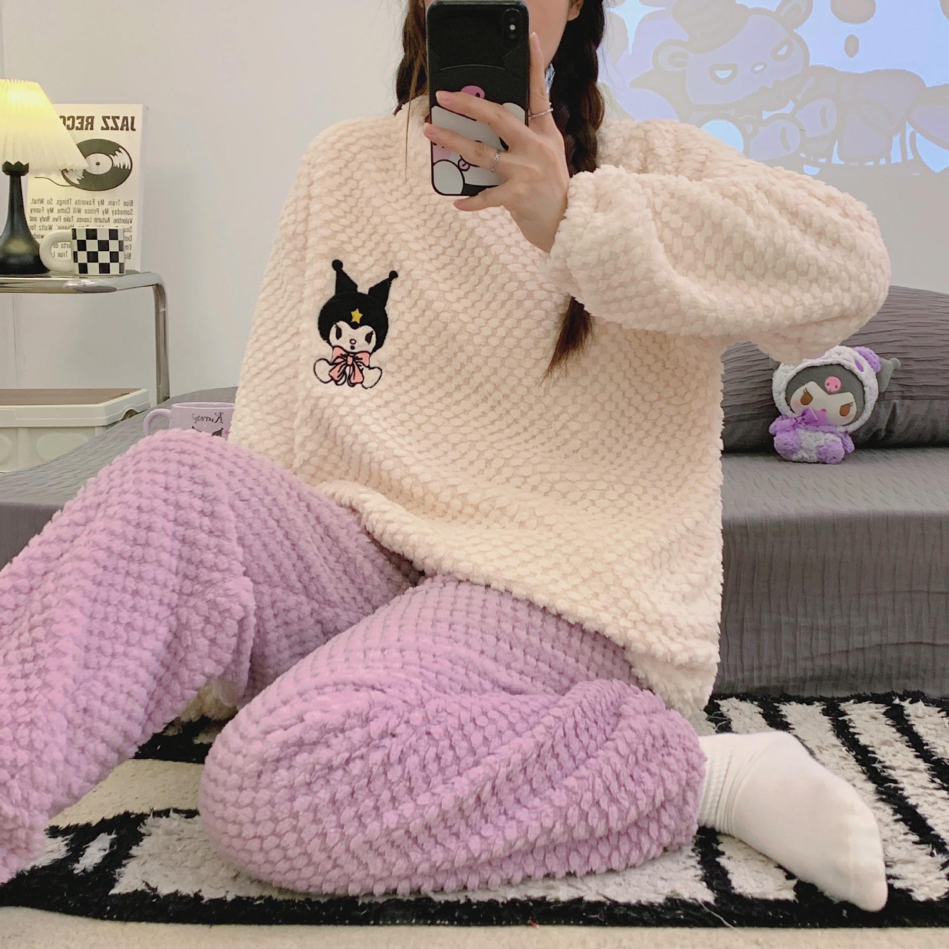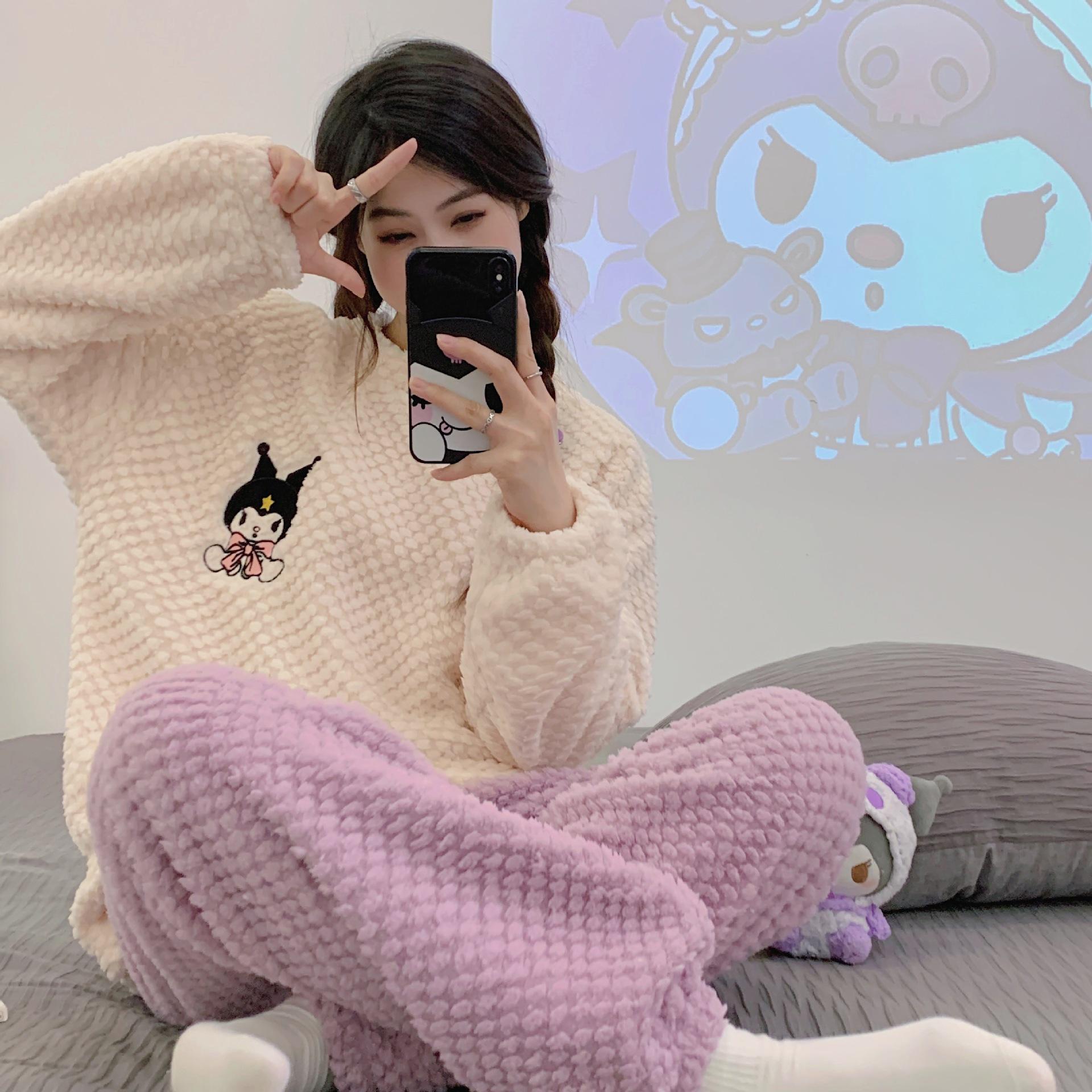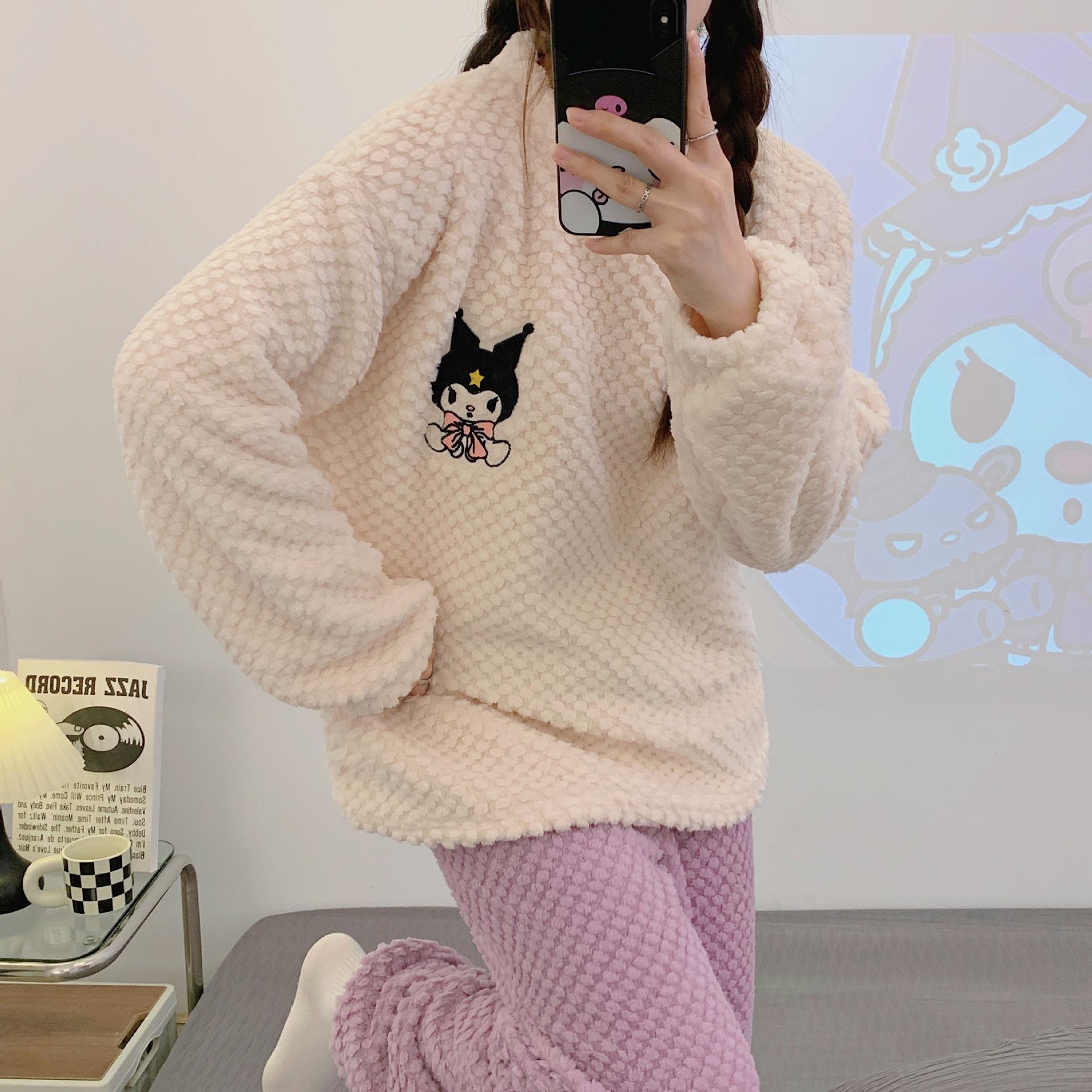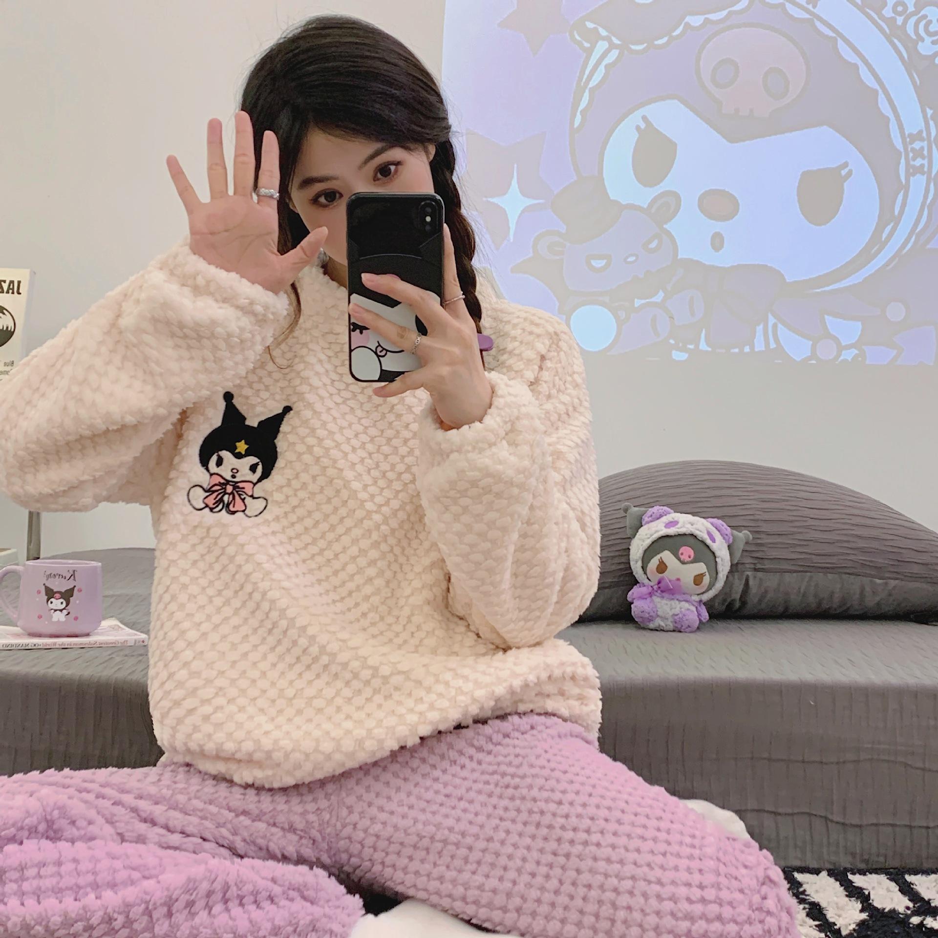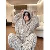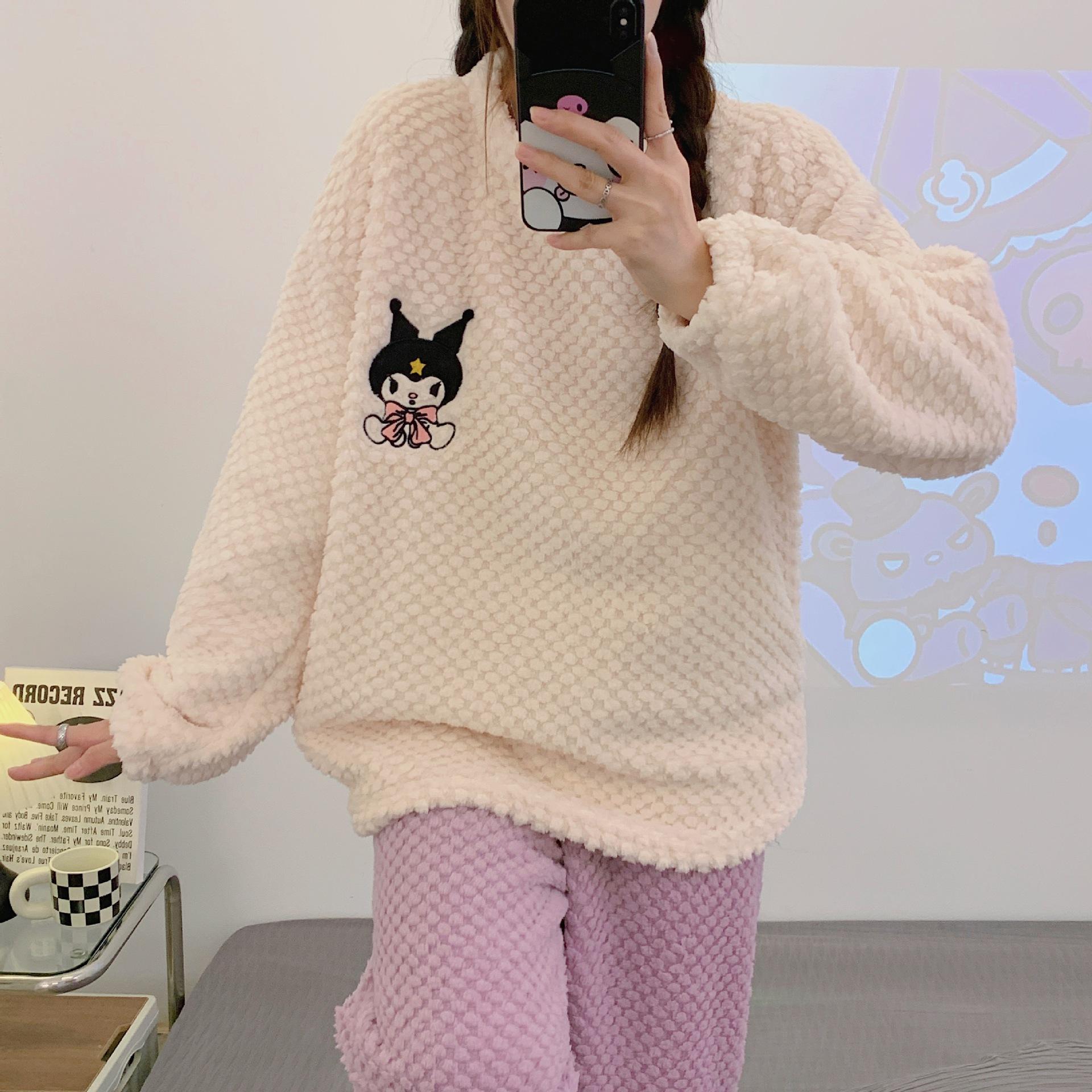 Pijama de cuello redondo para mujer, forro polar grueso, otoño e invierno, jacquard, forro polar coral, bordado, dibujos animados, jersey, manga larga, pantalones, traje