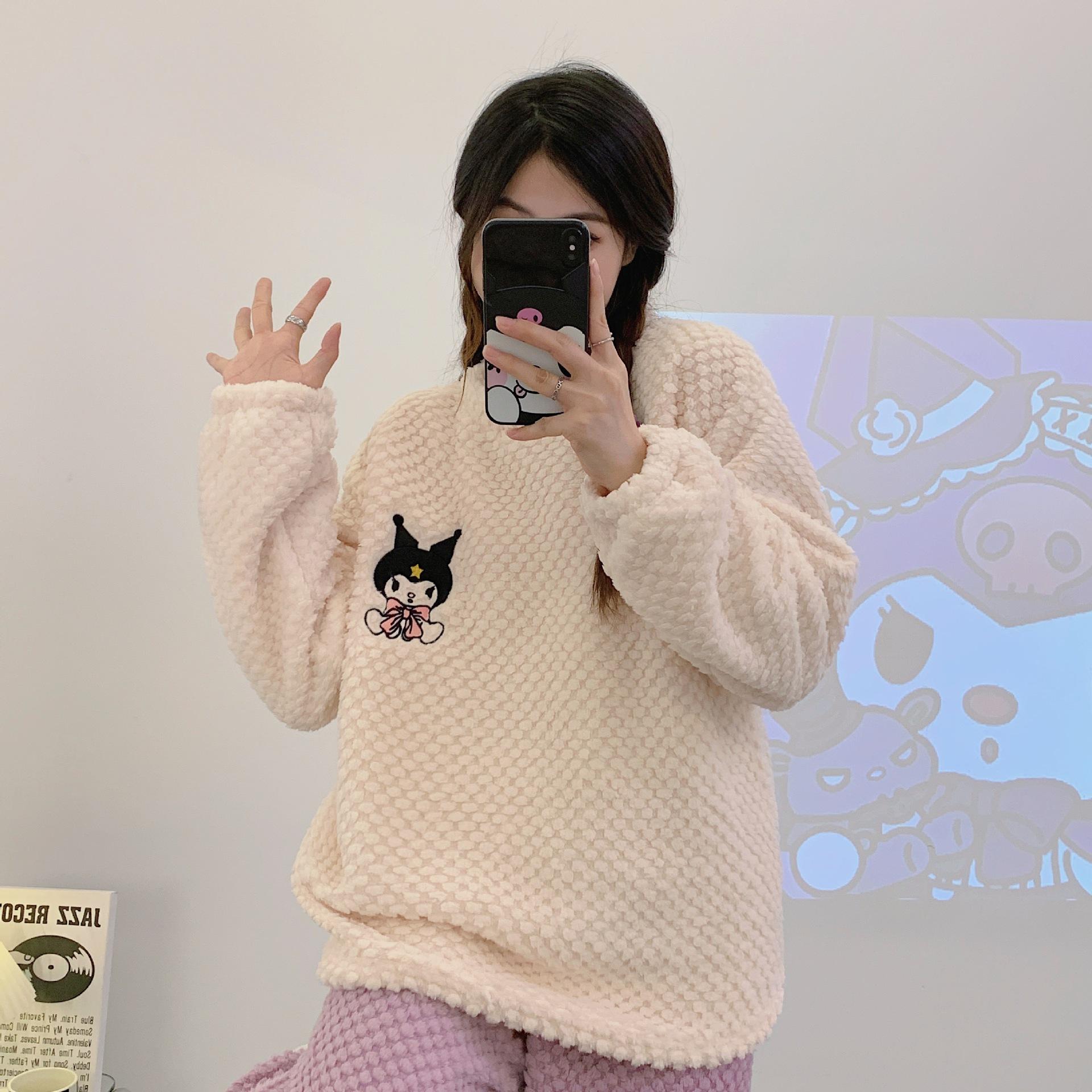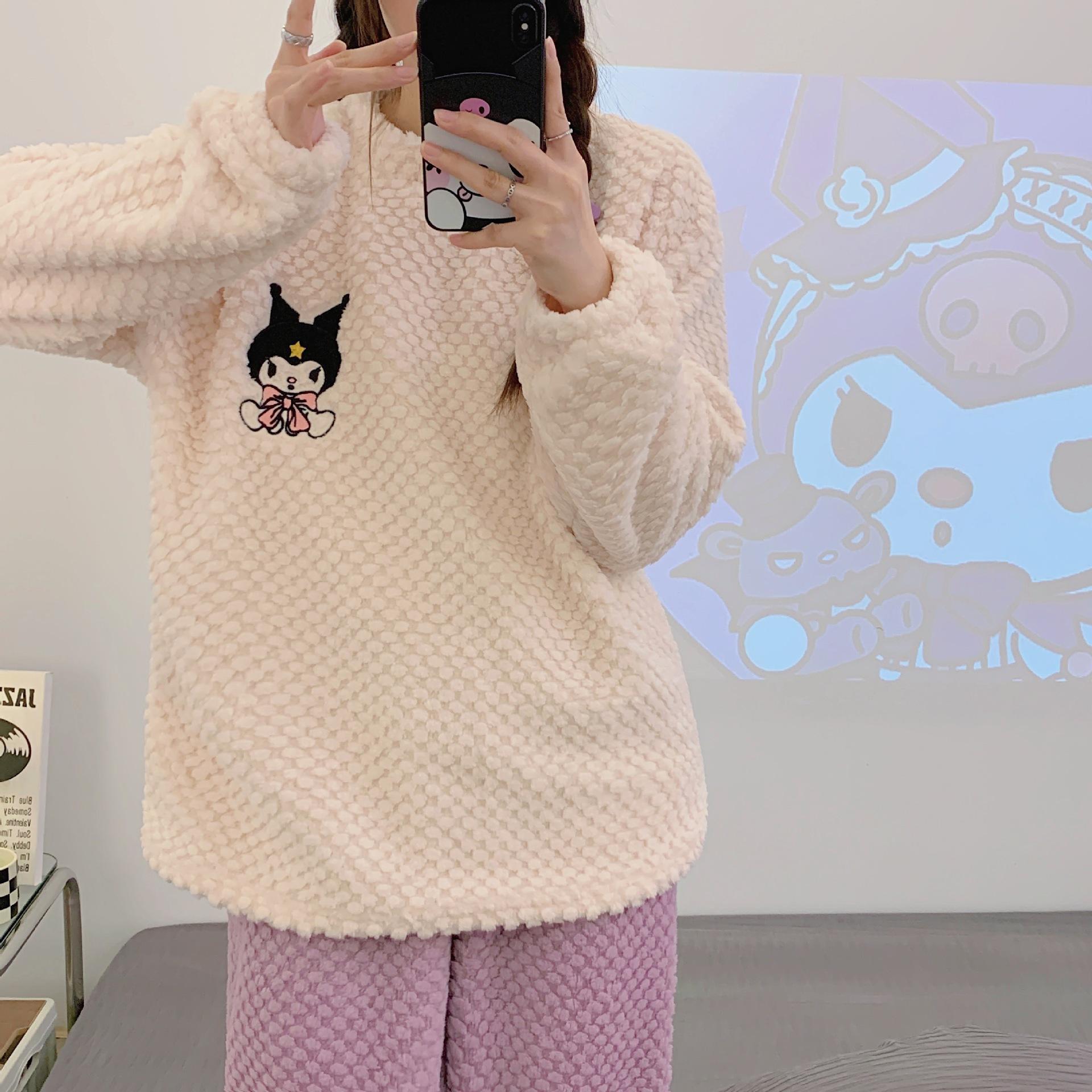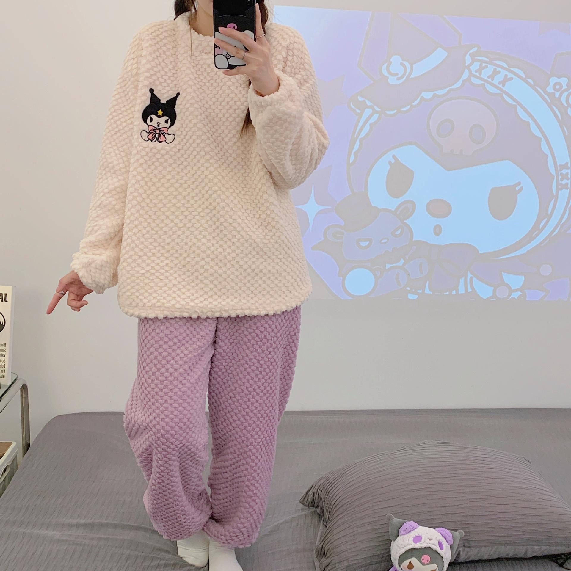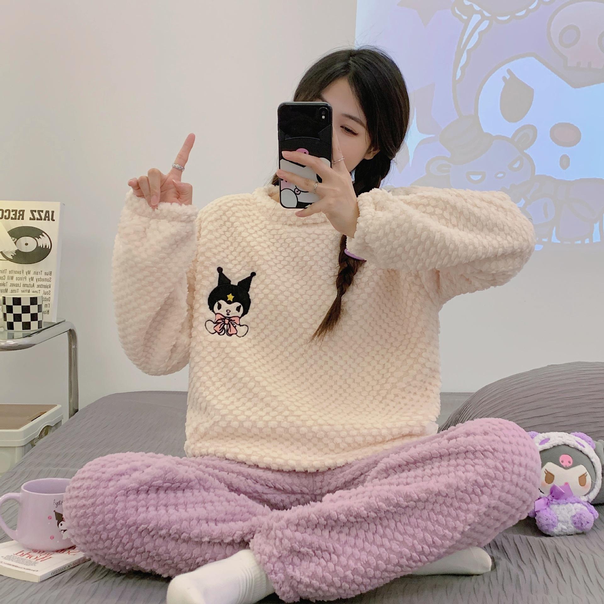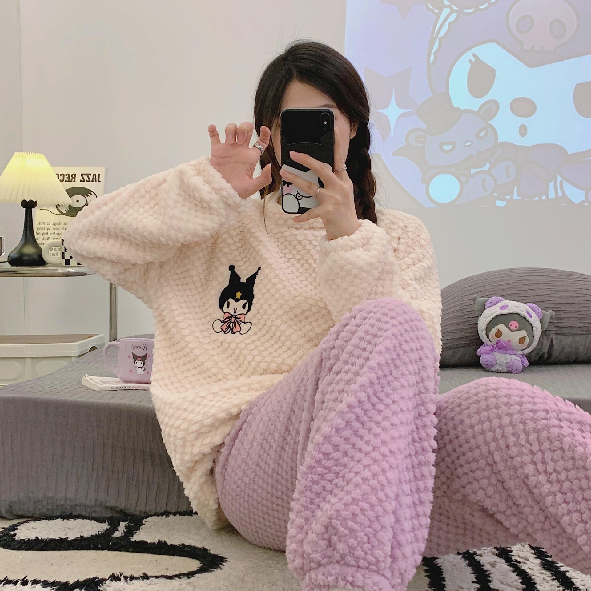 Pijama de cuello redondo para mujer, forro polar grueso, otoño e invierno, jacquard, forro polar coral, bordado, dibujos animados, jersey, manga larga, pantalones, traje