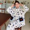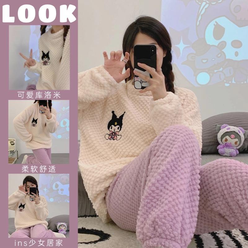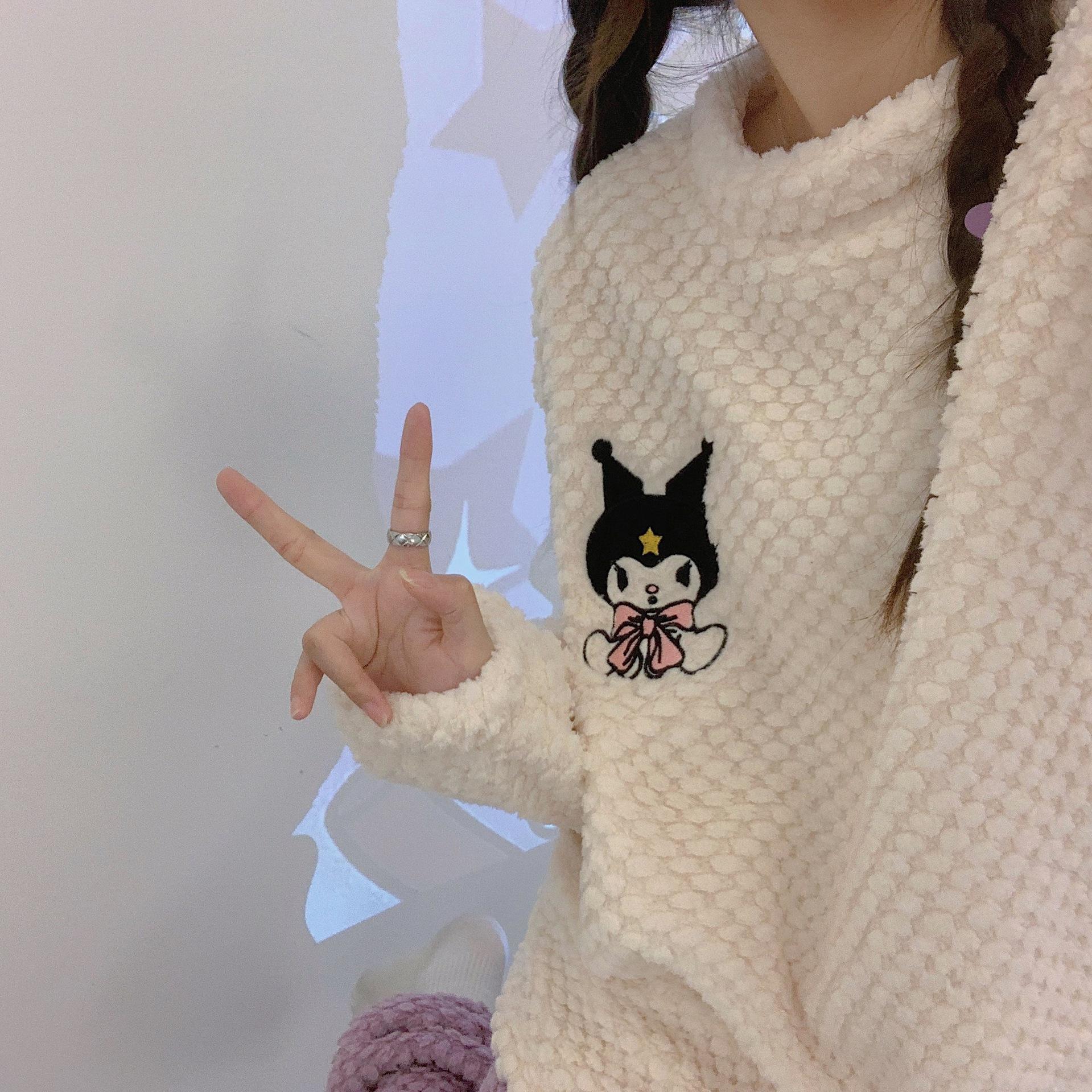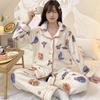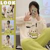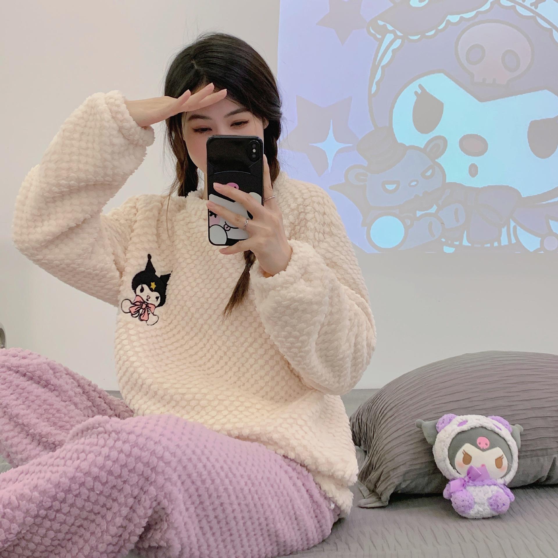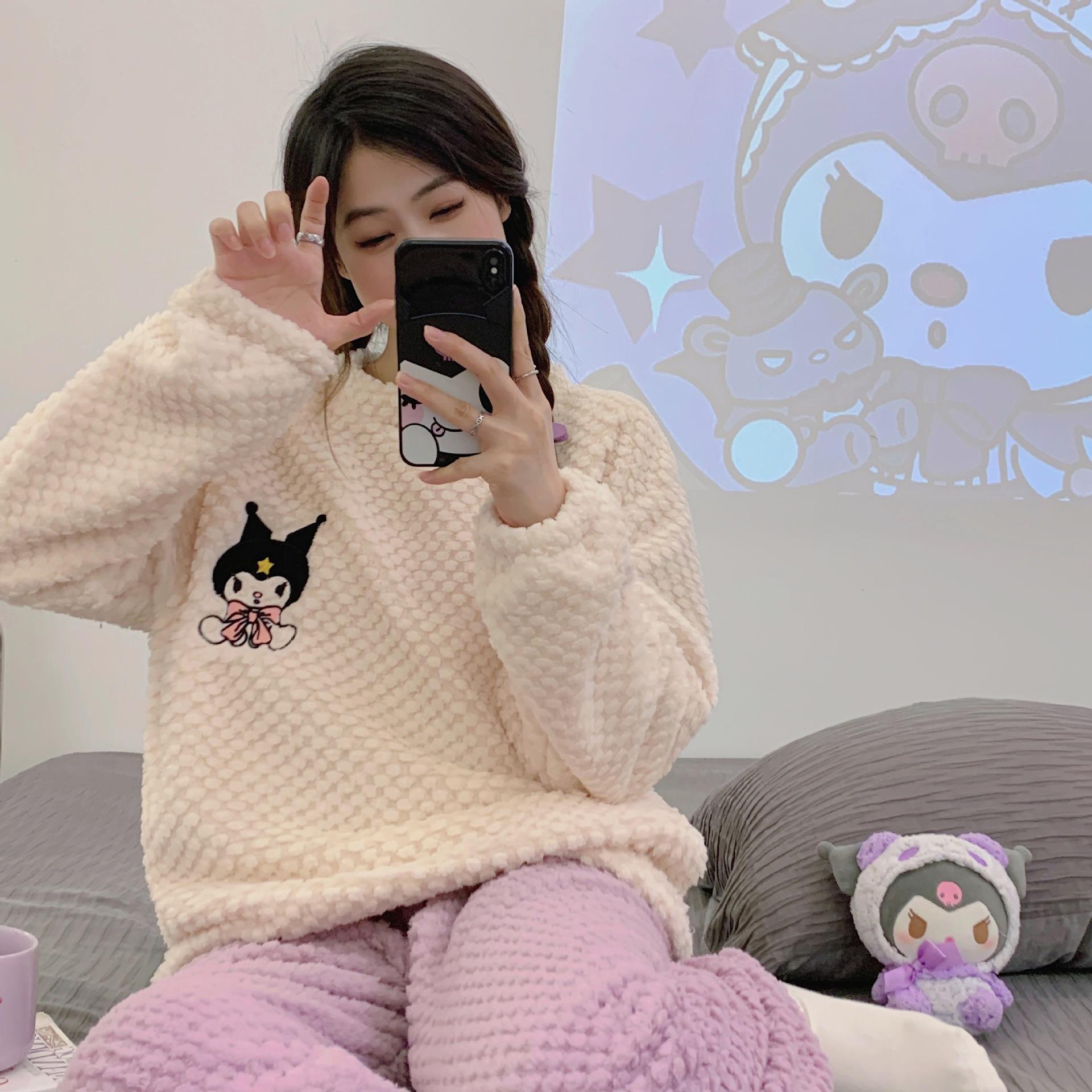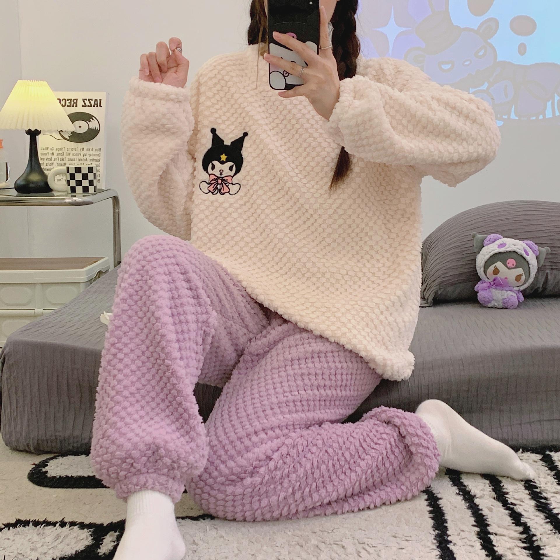 Pijama de cuello redondo para mujer, forro polar grueso, otoño e invierno, jacquard, forro polar coral, bordado, dibujos animados, jersey, manga larga, pantalones, traje