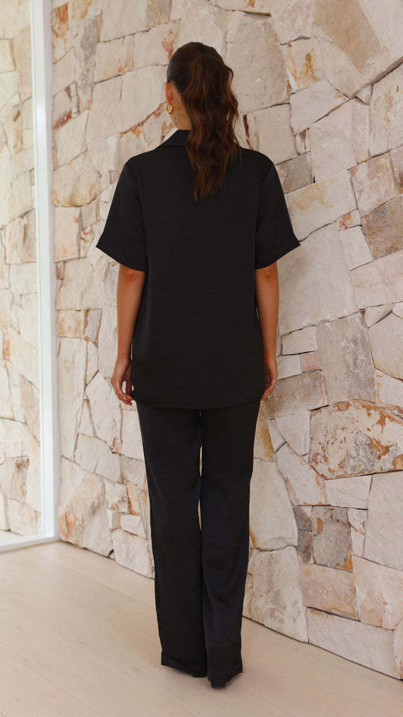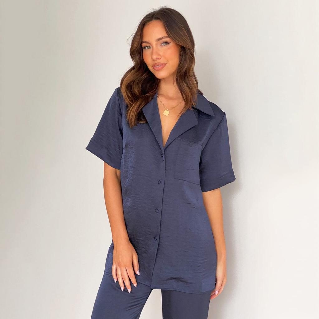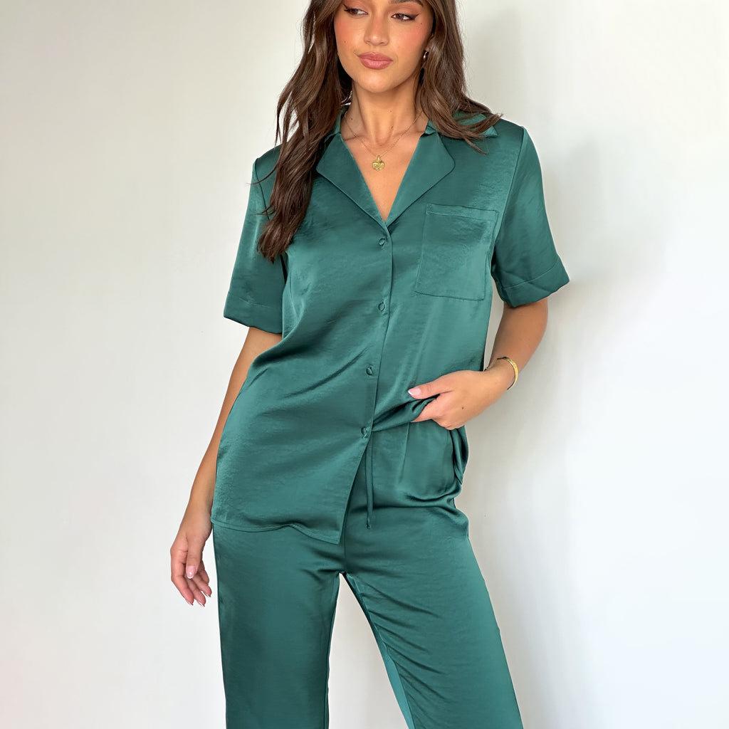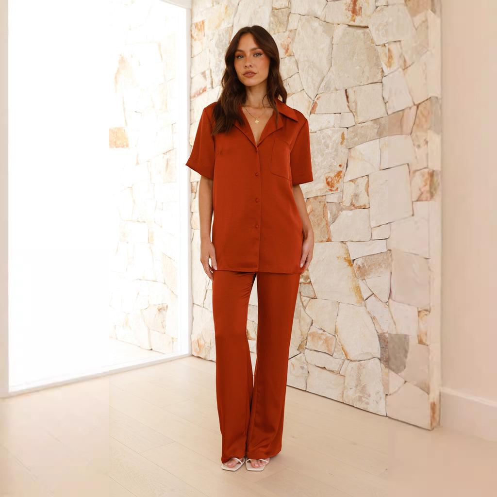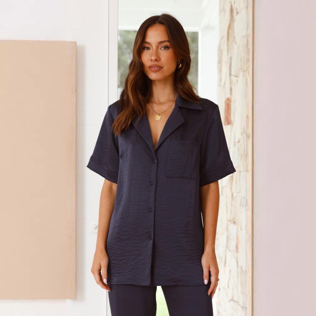Pijama informal cómodo de manga corta para mujer, nuevo conjunto de pijamas de color liso con solapa para el hogar, disponible en Amazon.