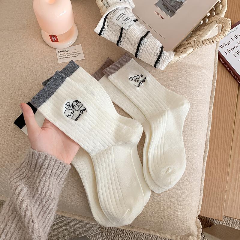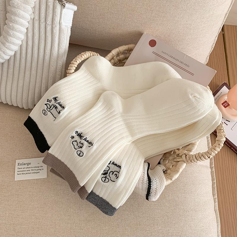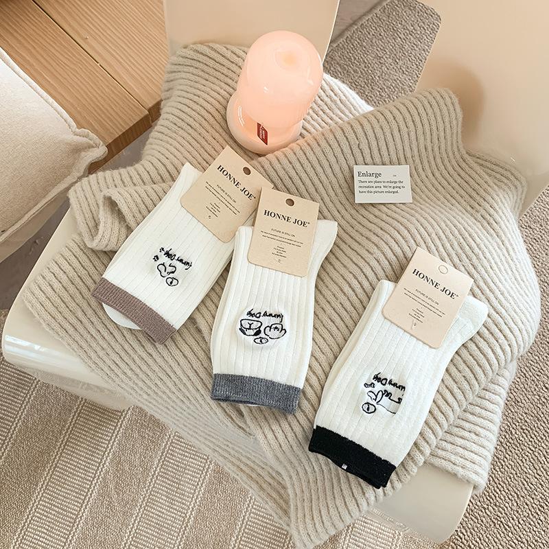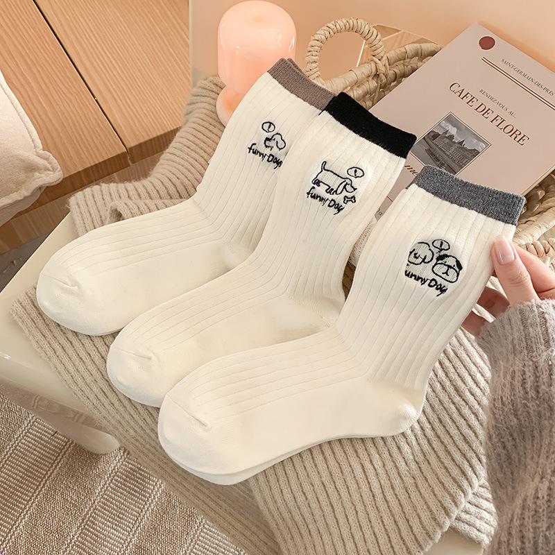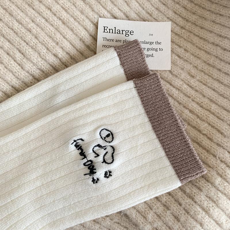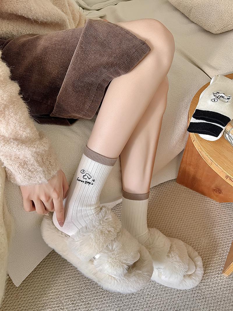 Compra Calcetines con bordado de cachorro, rayas verticales de doble aguja, calcetines de tubo medio, calcetines gruesos y cálidos a juego para mujer, calcetines de estilo ins para otoño e invierno. al por mayor en Joom.pro