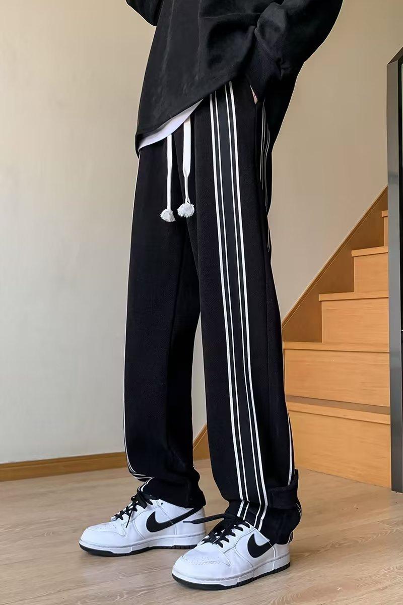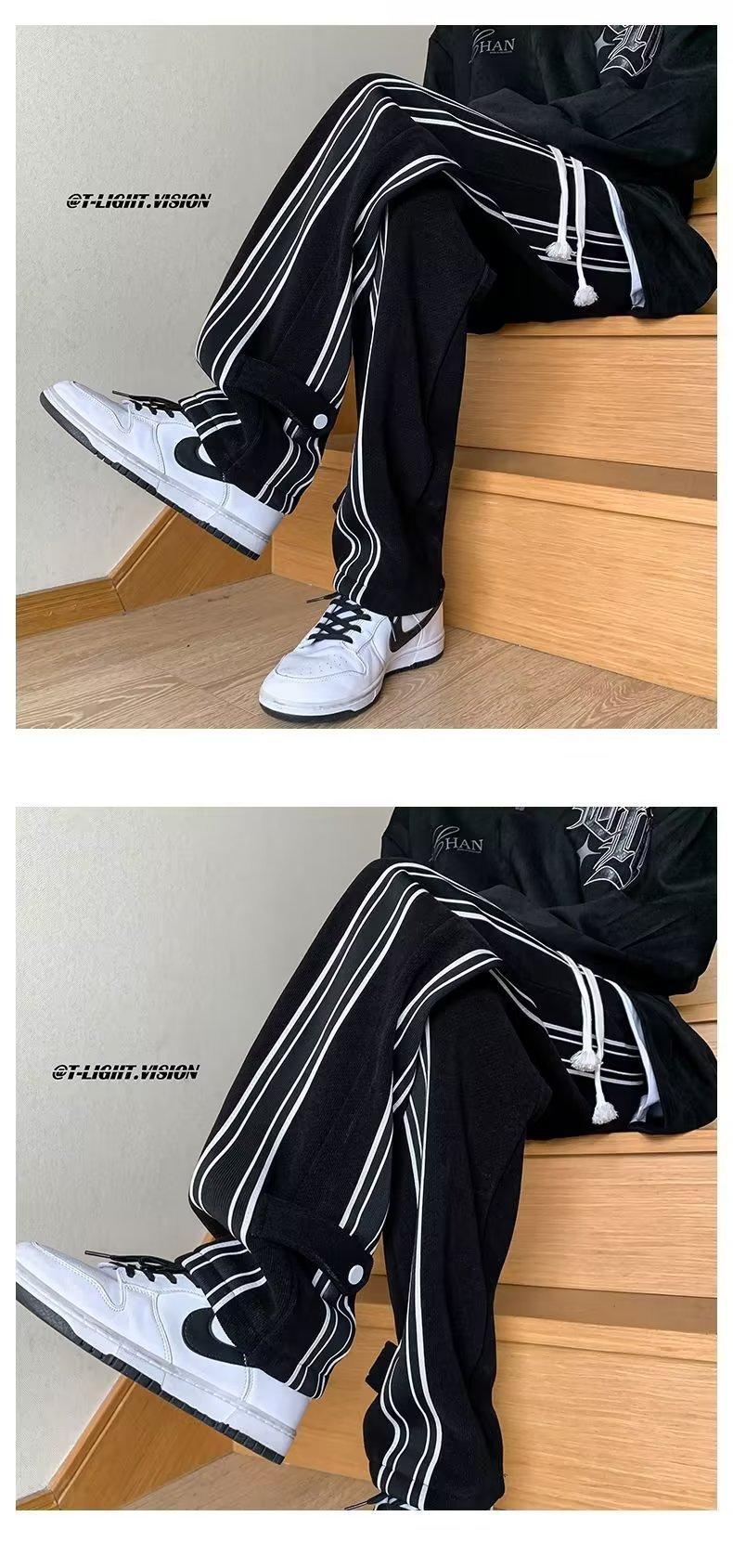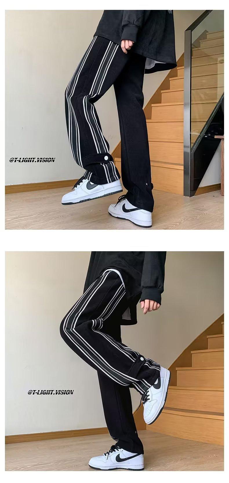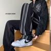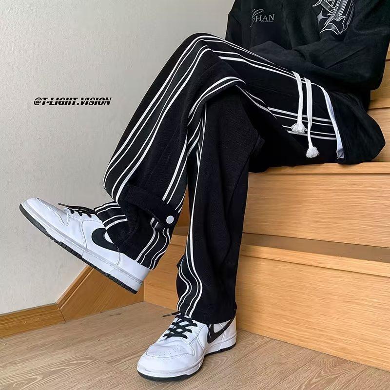 Pantalones de rayas blancas y negras para hombre, estilo americano de otoño, estilo urbano, rectos, deportivos, de marca de moda, holgados, de pierna ancha, informales.