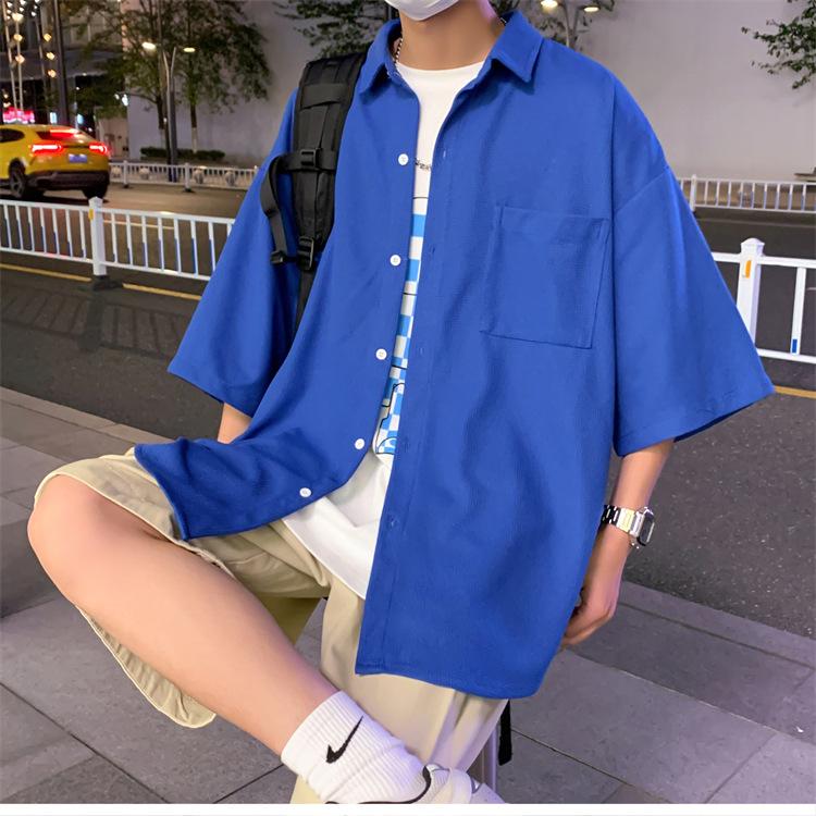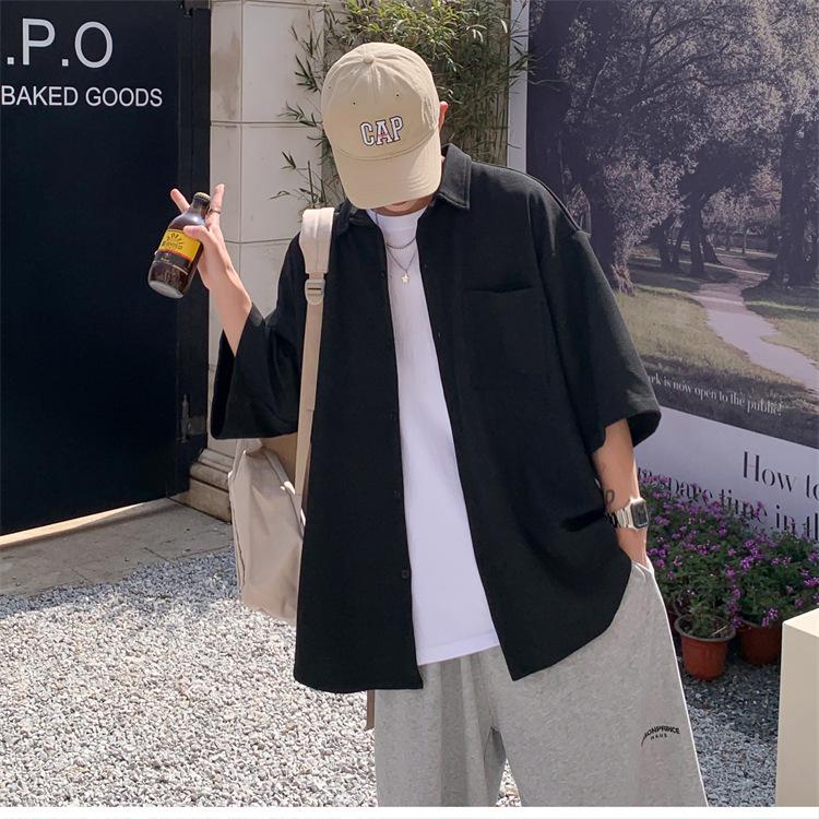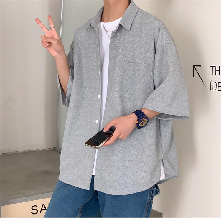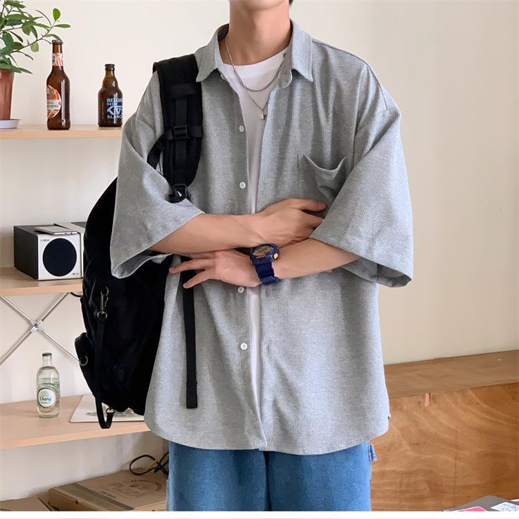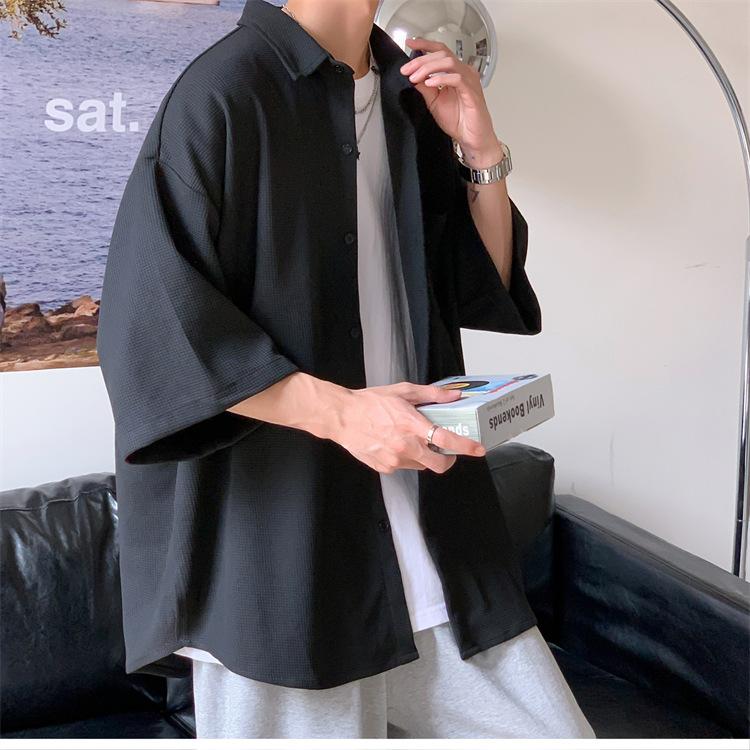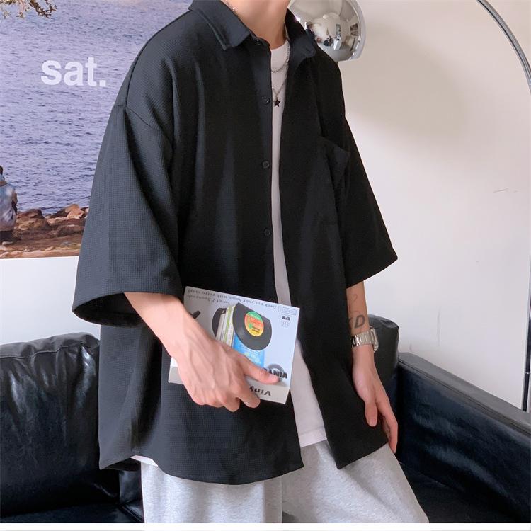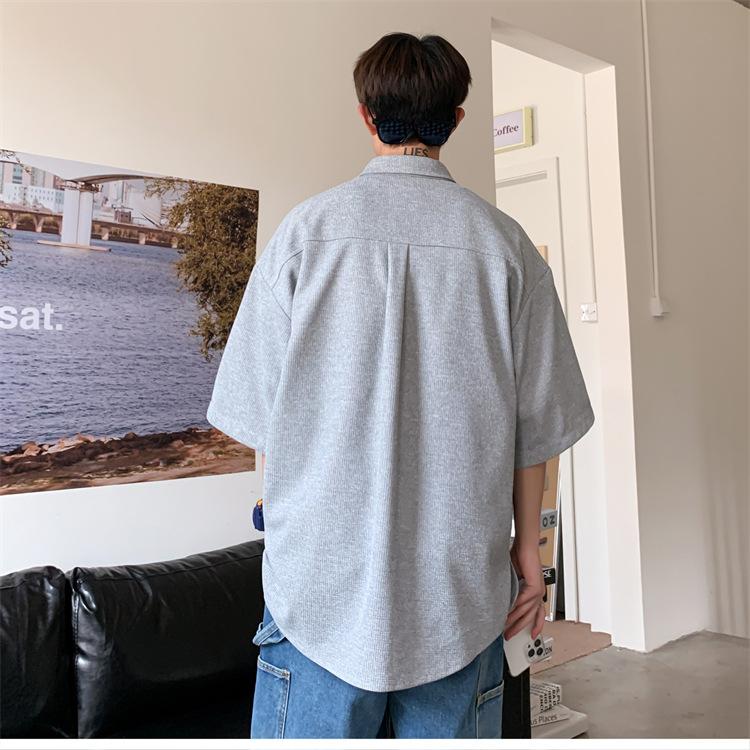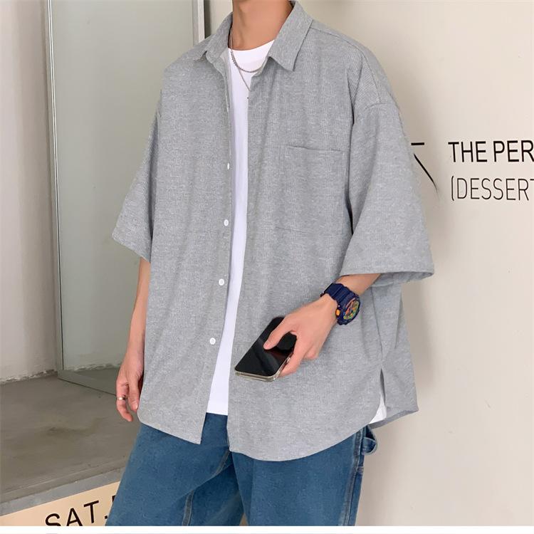 Camisa informal de color liso para hombre, estilo Xia Gang 2022, nueva camisa con ventilación tipo gofre, camisa holgada de manga corta de talla grande para hombre